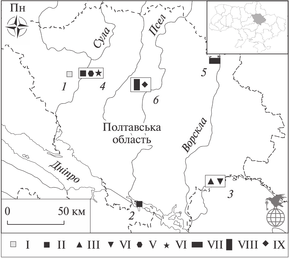 Рис. 1. Карта находок новых фибул VI - начале VIII в. с территории Полтавщины. Условные обозначения: I - сложная антропозооморфна фибула Родинкова / Тип ИИ.2; II - простая антропоморфная фибула Родинкова / Тип И.2; III - пальчатая фибула с каймой из птичьих голов, подтипа семиглавых, серии Б и варианта Майорки по В.Е. Родинкова; IV - пальчатая фибула днепровского типа; V - широкопластинчатая фибула Гавритухин / тип 2б; VI - фибула типа Керчь, подгруппа А, вид IV; VII - малая неорнаментована пальчатая фибула Гавритухин / Тип Пергамон - Бухарест - оз. Тей, подтип неорнаментированных, серия А; VIII - фибула переходная от двопластичнои к пальчатая; IХ - фибула серии «Новоселица». 1 - Малый Вязовок; 2 - Павловка; 3 - Шедиево; 4 - Засулля-Мгар; 5 - Батьки; 6 - Ковали