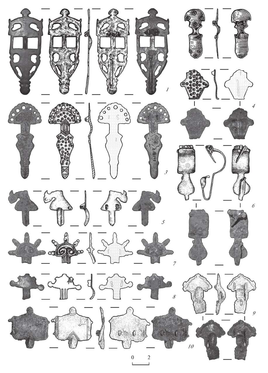 2. Щиток двопластинчастои фибулы. Отлитый вместе с имитациями декоративных кнопок. Всего их было пять. Сохранились только две – одна сверху (большая, цилиндрическая) и одна сверху слева (маленькая, цилиндрическая). Следы орнамента, обнаруженные на местах соединения скобки, имитирующие накладные пальметки. С обратной стороны остатки двух петель для крепления железной иглы. Размеры обломка – 4,8 x 4,8 см, размеры щитка – 3,0 x 4,1 см, длина сохранившейся части дужки – 0,9 см (рис. 2, 10).