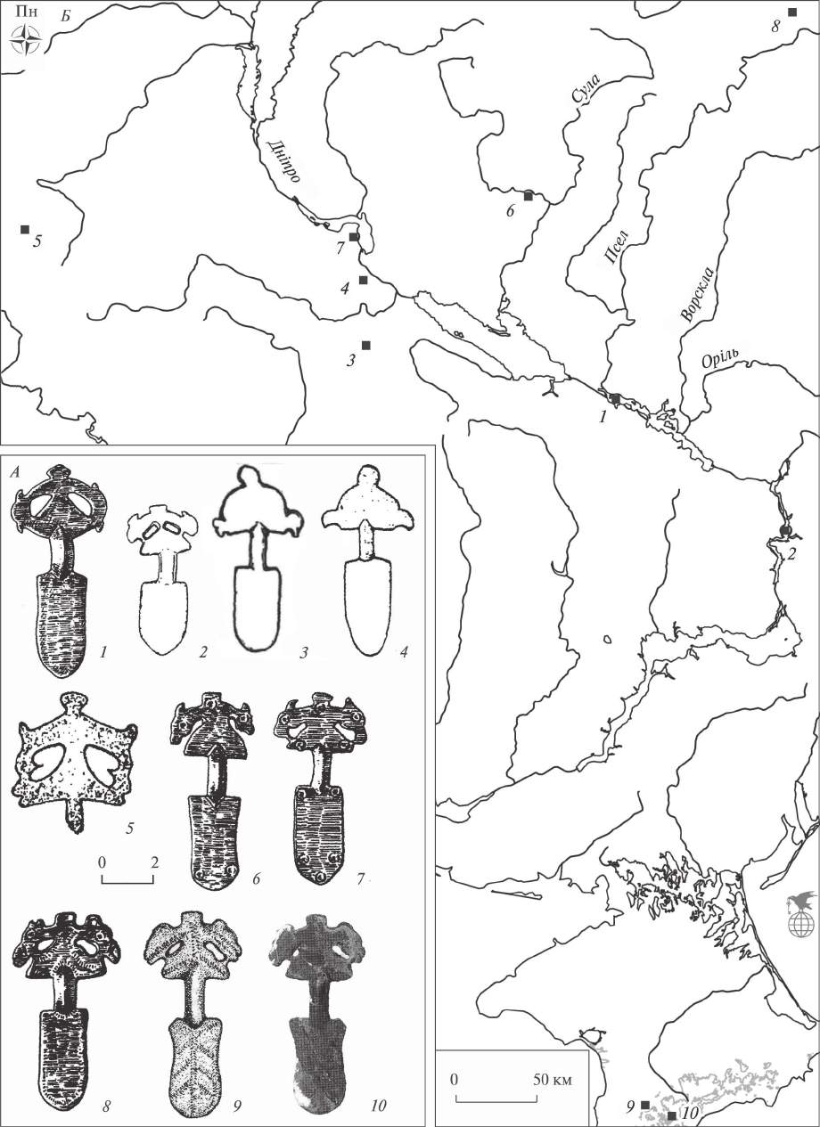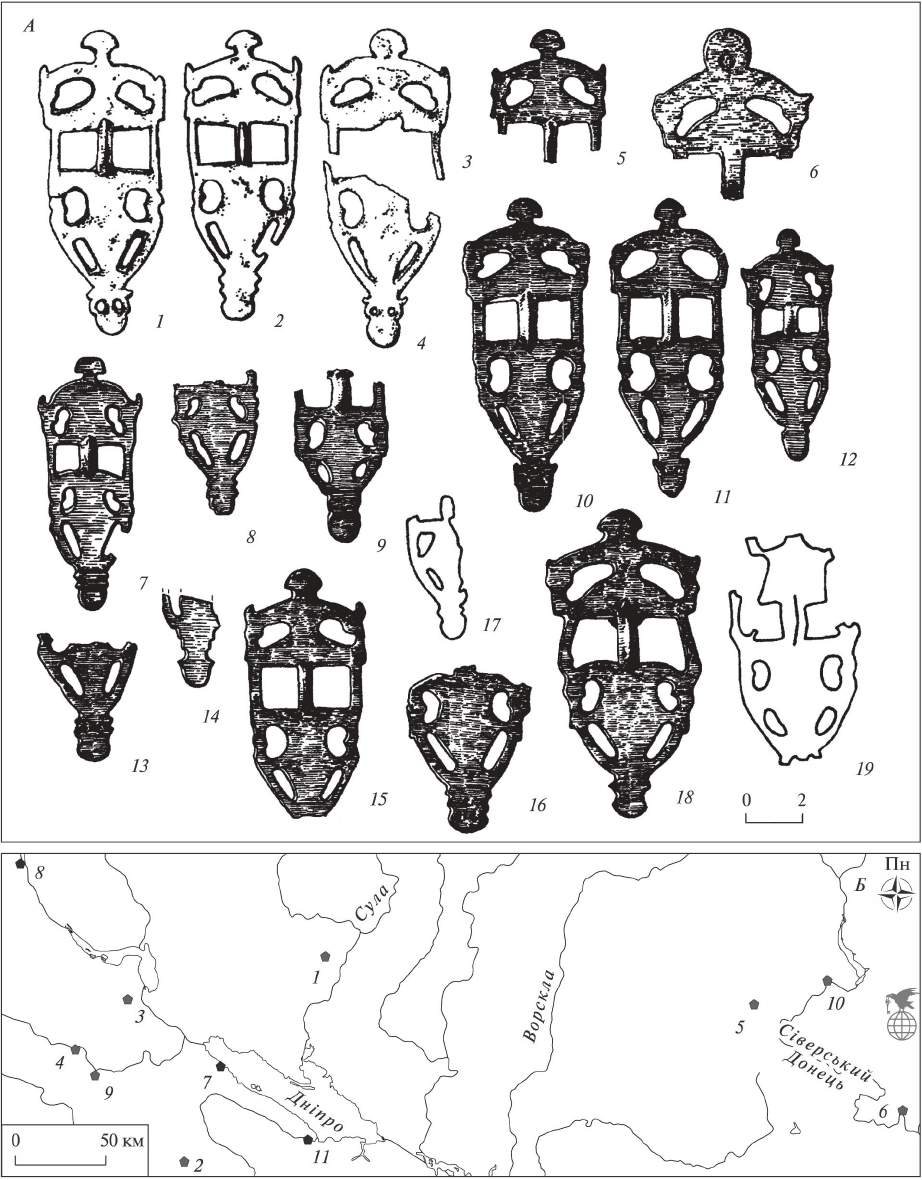 Б. Карта распространения (черным цветом отмечены места находок, которые точно неизвестны): 1 - Малый Вязовок; 2 - Пастырское городище; 3 - Тростянец; 4 - Дежки; 5 - Тымченки (уроч. Таранцева) 6 - Любовка; 7 - район Черкасского уезда; 8 - юг Киевской губернии; 9 - Стеблев; 10 - Кочетокський могильник (уроч. Сороков овраг) 11 - района Чигиринского уезда