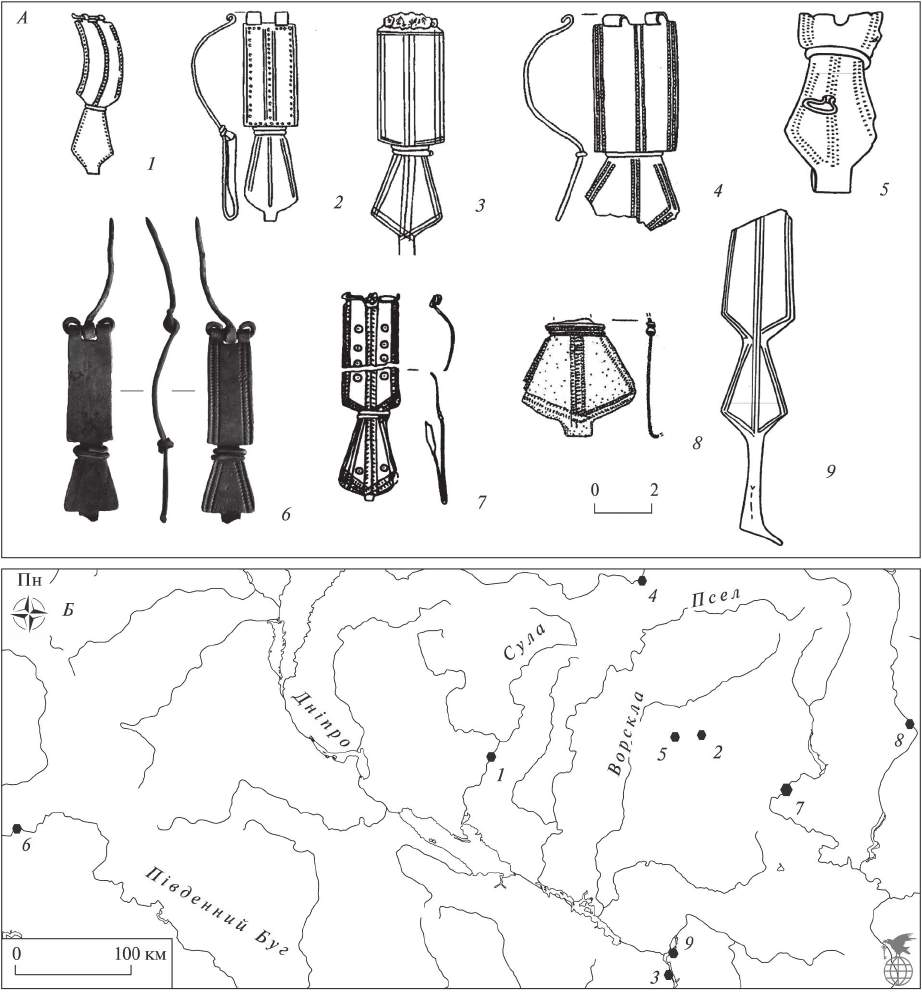 Рис. 7. А. Находки широкоплативчастих фибул типа Гавритухин/тип 2б: 1 - Богодухов; 2 - Волосское; 3 - Гапоново; 4-5 - Козеевка - Новая Одесса; 6 - Меджибож-Рыбхоз; 7 - Мохнач; 8 - Игрень-Подкова; 9 - Колосков.