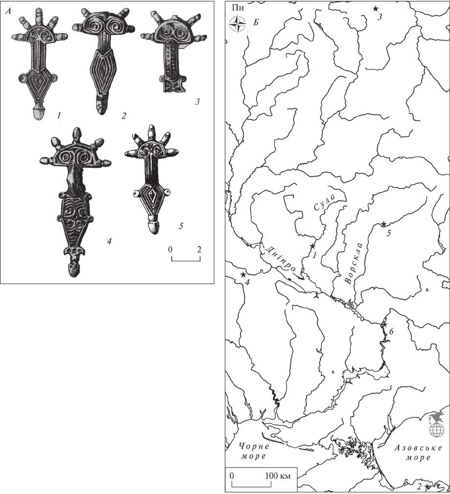 Рис. 8. А. Находки пальчатых фибул типа Керчь, подгруппа А, вид IV, аналогии находке с Засулья-Мгара: 1 - Керчь; 2 - Спас-Перекша; 3 - Кидановка; 4 - Березовка; 5 - Игрень.