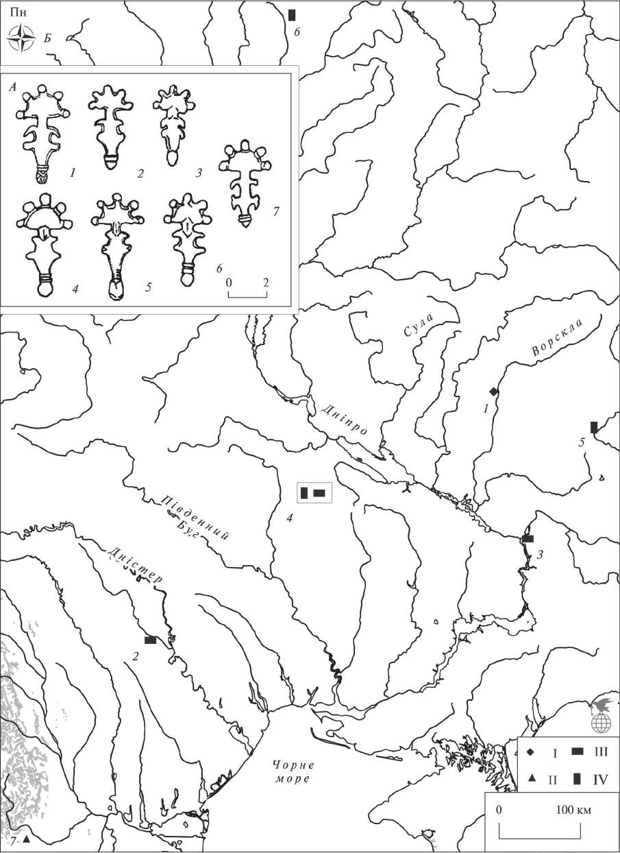 Б. Карта распространения. Условные обозначения: I - находка с Родителей; II - находка с Серато-Монтеору; III - вариант Селиште; IV - вариант Черкасский Бишкин. 1 - Батьки; 2 - Селиште; 3 - Игрень; 4 - Пастырское городище; 5 - Черкасский Бишкин; 6 - Никодимове; 7 - Серато-Монтеору