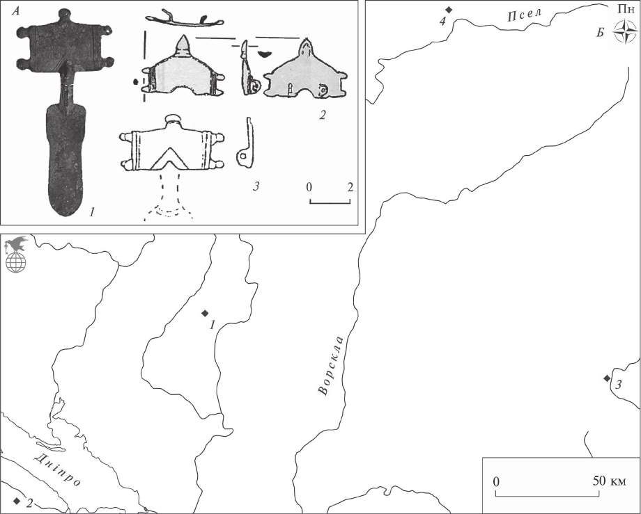 Б. Карта распространения фибул: 1 - Засулля-Мгар; 2 - балка Яцево; 3 - Градижск; 4 - Великая Круча