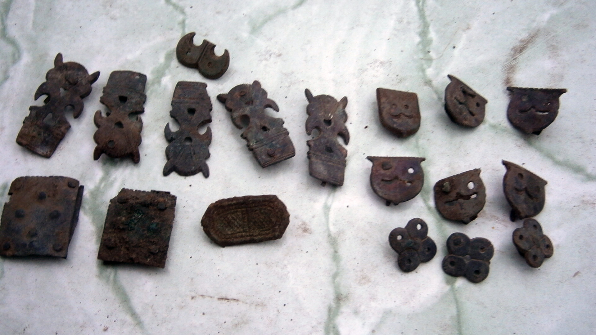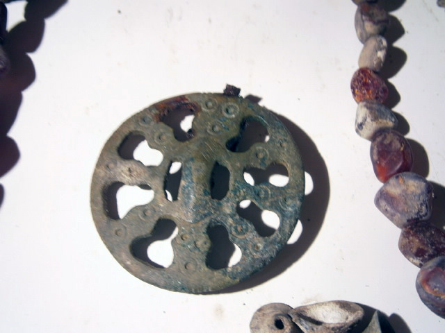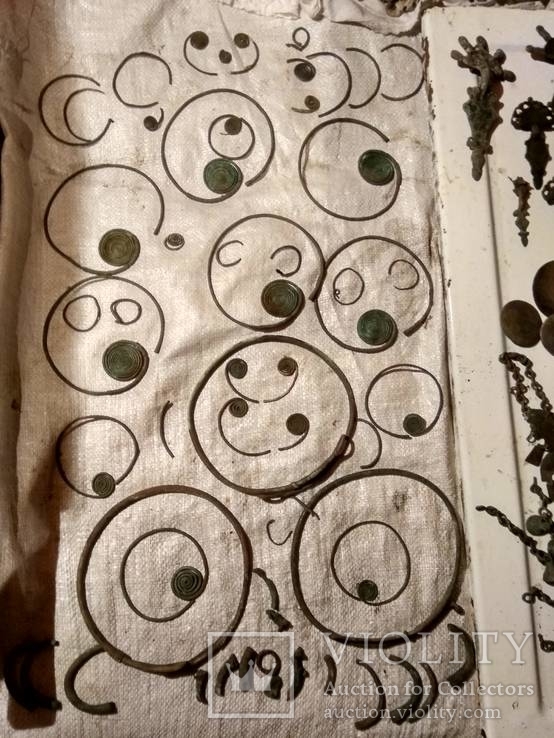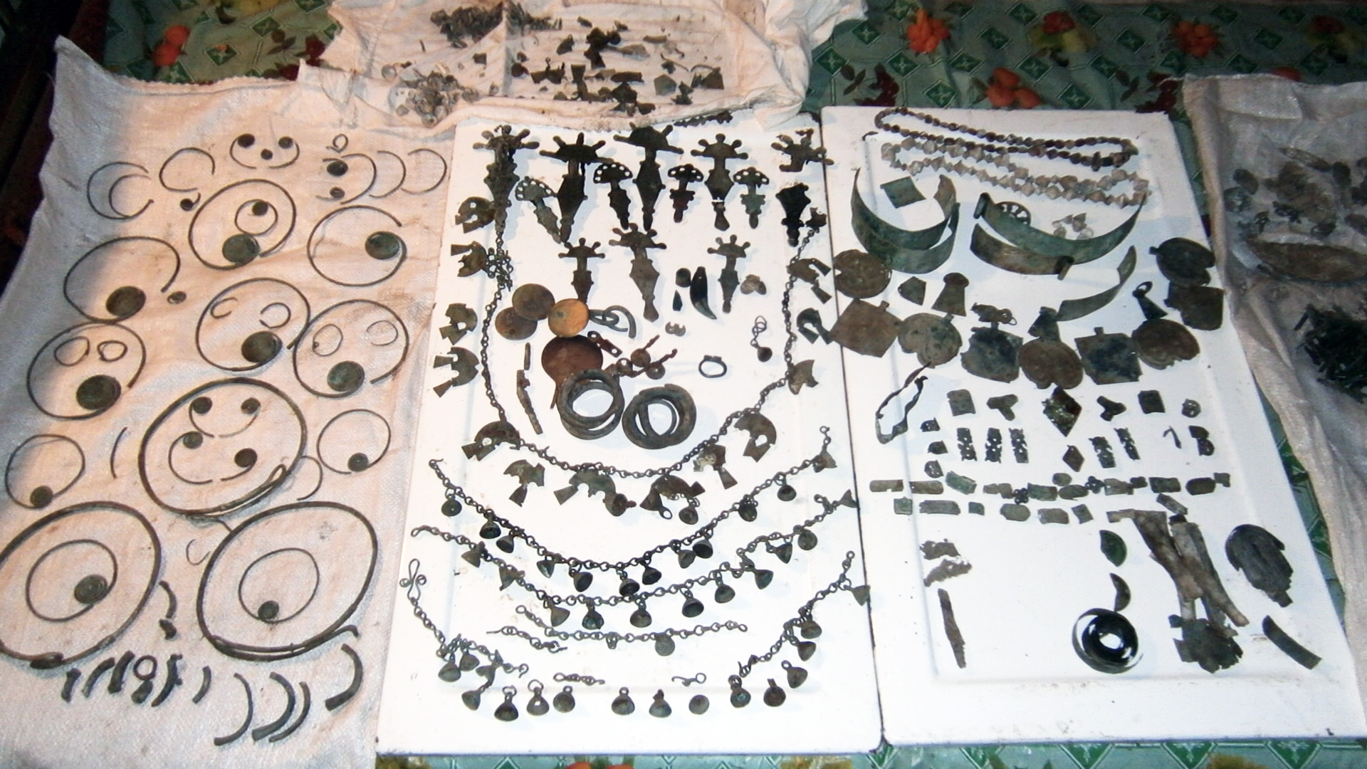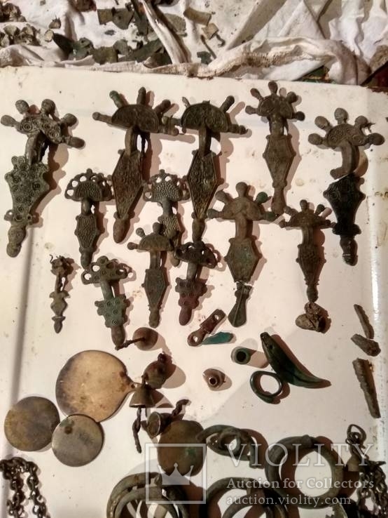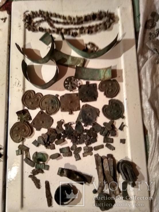 Клад древнеславянской металлопластикиС самого начала Bleid выложил совсем никудышные фотографии, завсегдатаи Виолити ему указали что это несколько не хорошо. Он несколько исправился и разместил фото большего разрешения, но все в той же темной комнате. Эти фотографии позволяют оценить размер и комплектность клада. Лобные венчики, фибулы, привески, пронизки, поясные накладки, бусы, ожерелья, а также зеркальца.