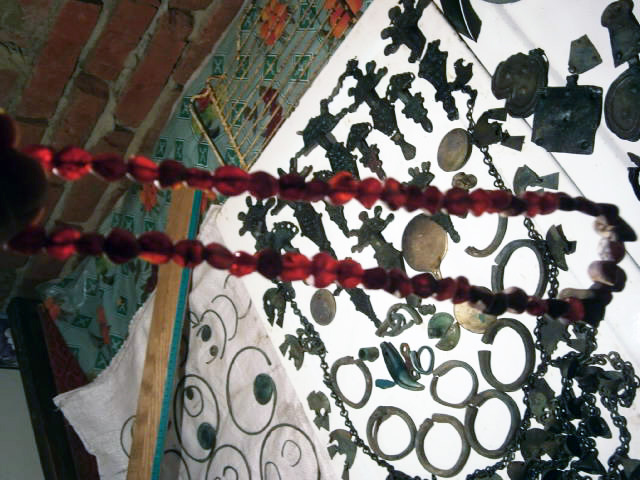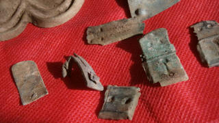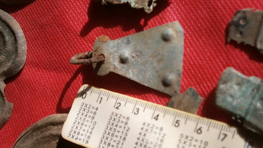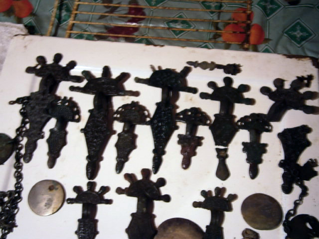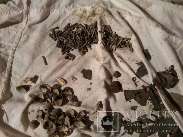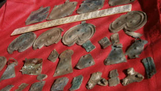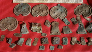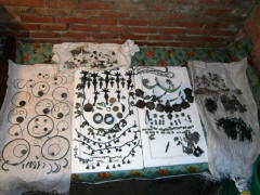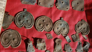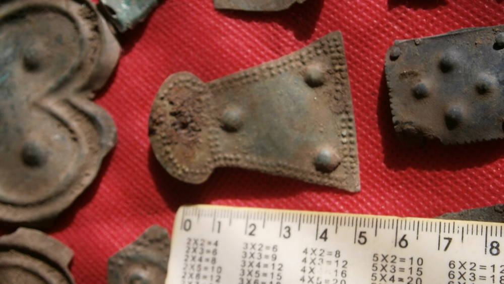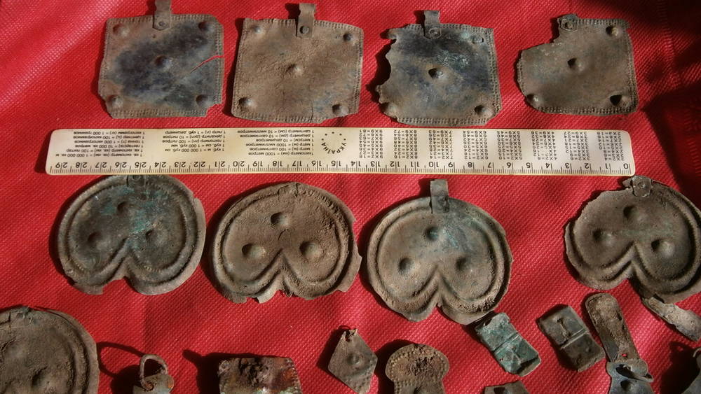Клад древнеславянской металлопластикиС самого начала Bleid выложил совсем никудышные фотографии, завсегдатаи Виолити ему указали что это несколько не хорошо. Он несколько исправился и разместил фото большего разрешения, но все в той же темной комнате. Эти фотографии позволяют оценить размер и комплектность клада. Лобные венчики, фибулы, привески, пронизки, поясные накладки, бусы, ожерелья, а также зеркальца.