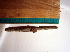 Заготовка второй подвески представляет собой круглую в сечении проволоку толщиной чуть меньше 3 мм, в месте спирального окончания – 1-1,5 мм. Первые два витка спирали (от центра) обмотаны тонкой проволокой диаметром около 0,8 мм. Дужка на длину 2 см также обмотана про волокой, но более толстой (около 1,5 мм). Общая длина сохранившейся части изделия – 12 см, диаметр спирального окончания – 2,5 см.
