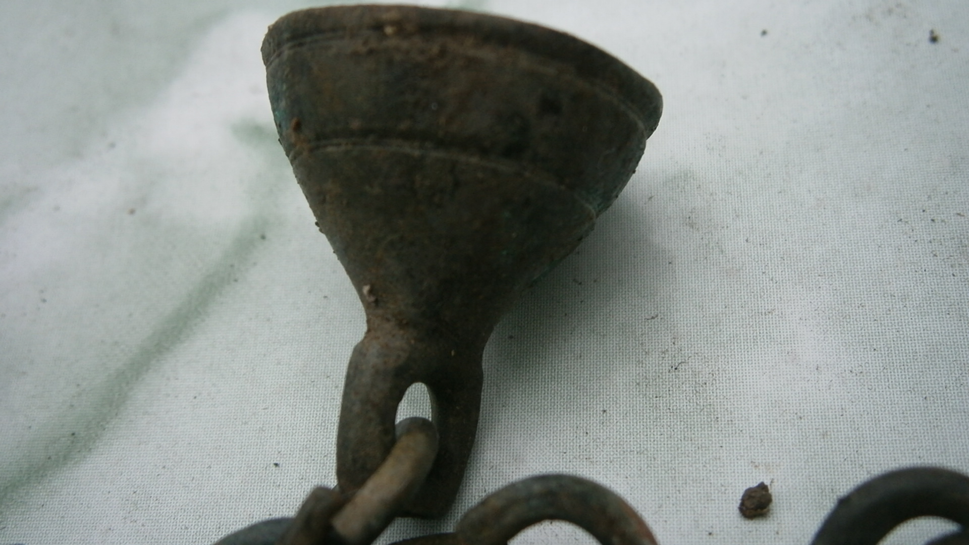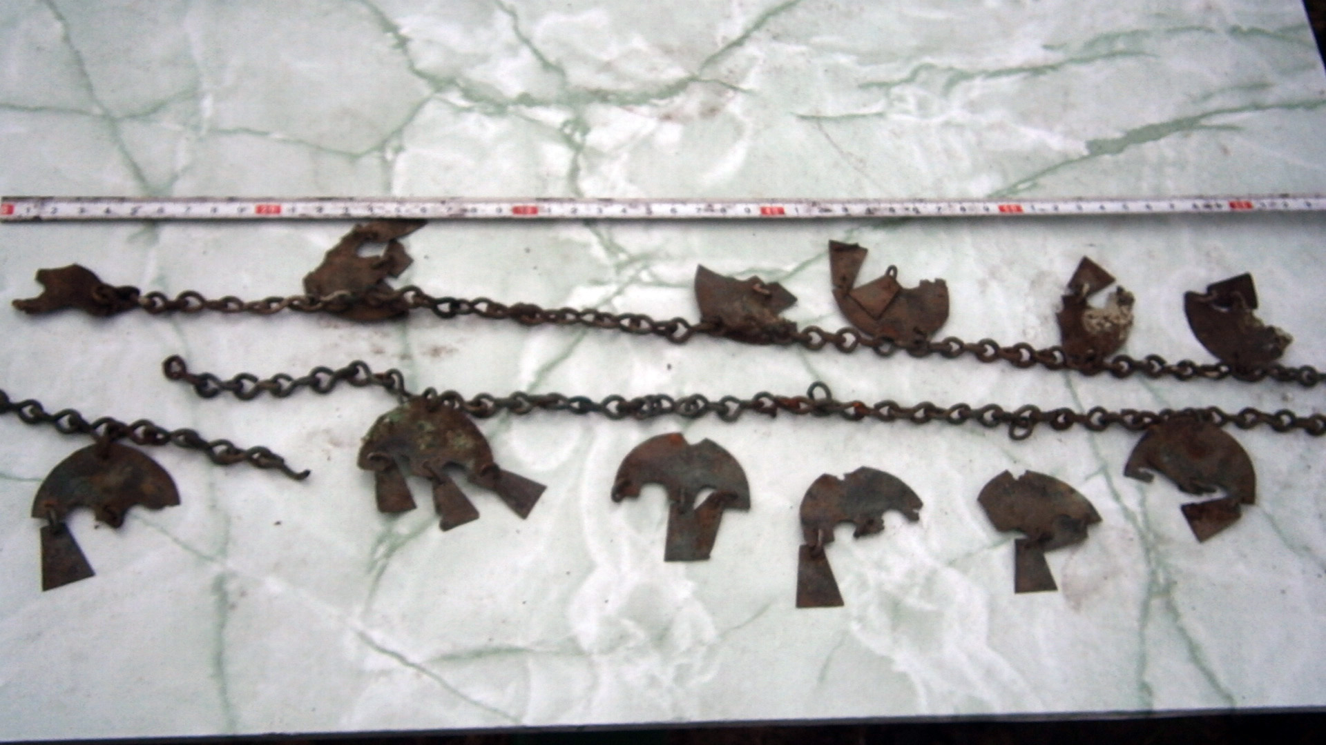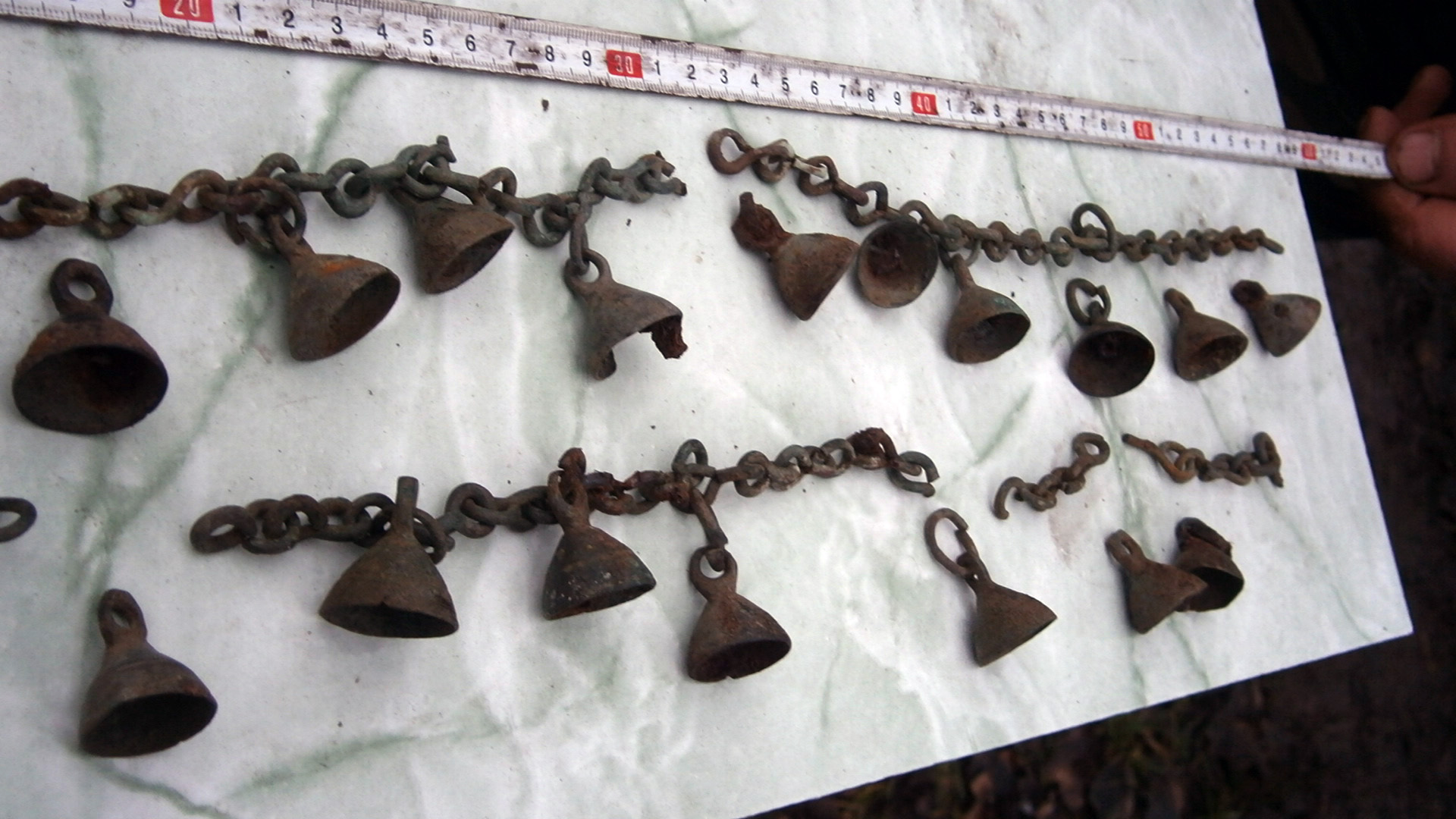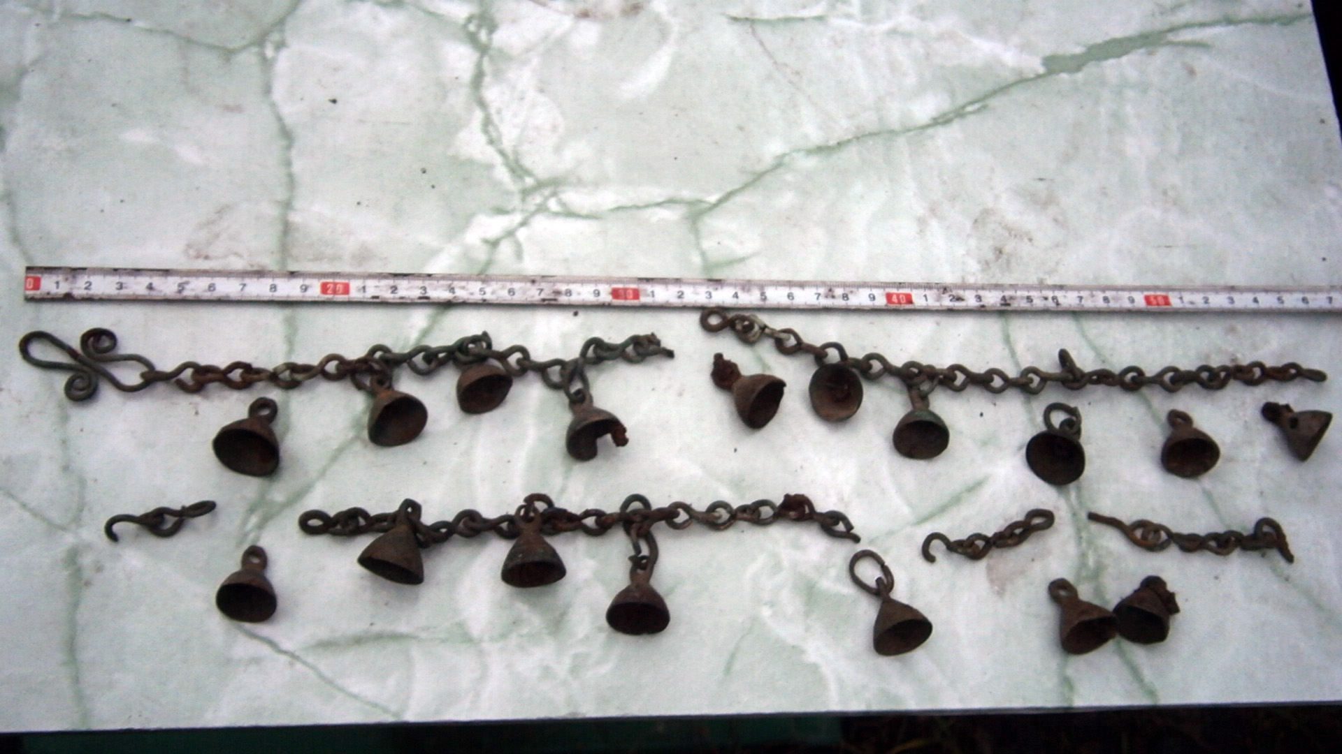 Один позолоченный и много бронзовых колокольчиков, закрепленных на цепиБронзовые конические колокольчики с внутренней петлей для подвешивания язычка. Подобные колокольчики широко представлены в ряде антских кладов (Козиевский, Новоодесский, Суджанский, Гапоновский).