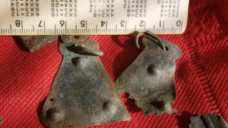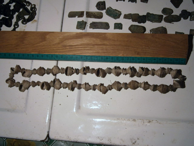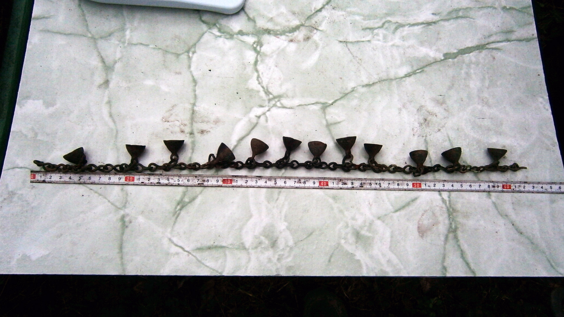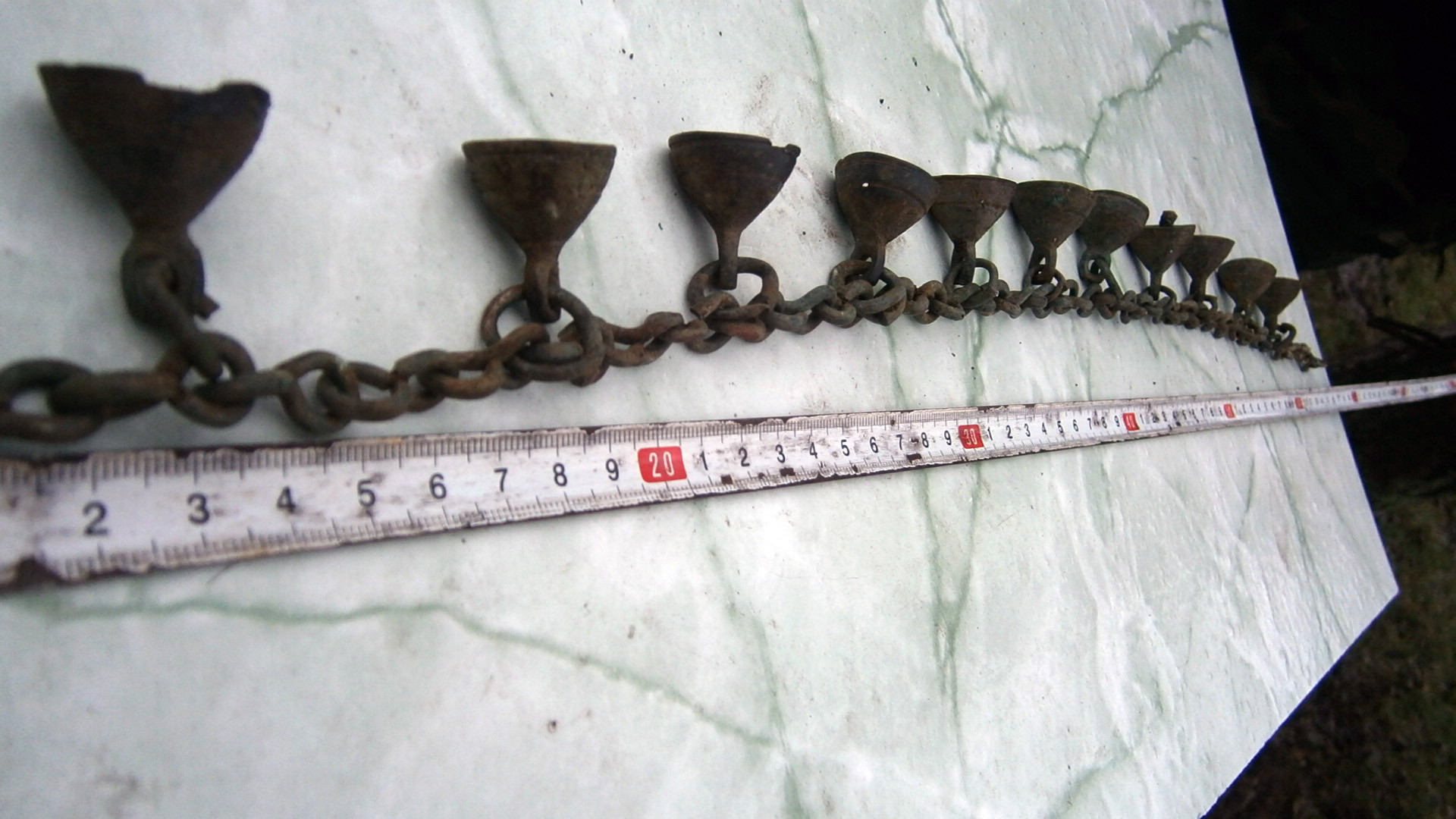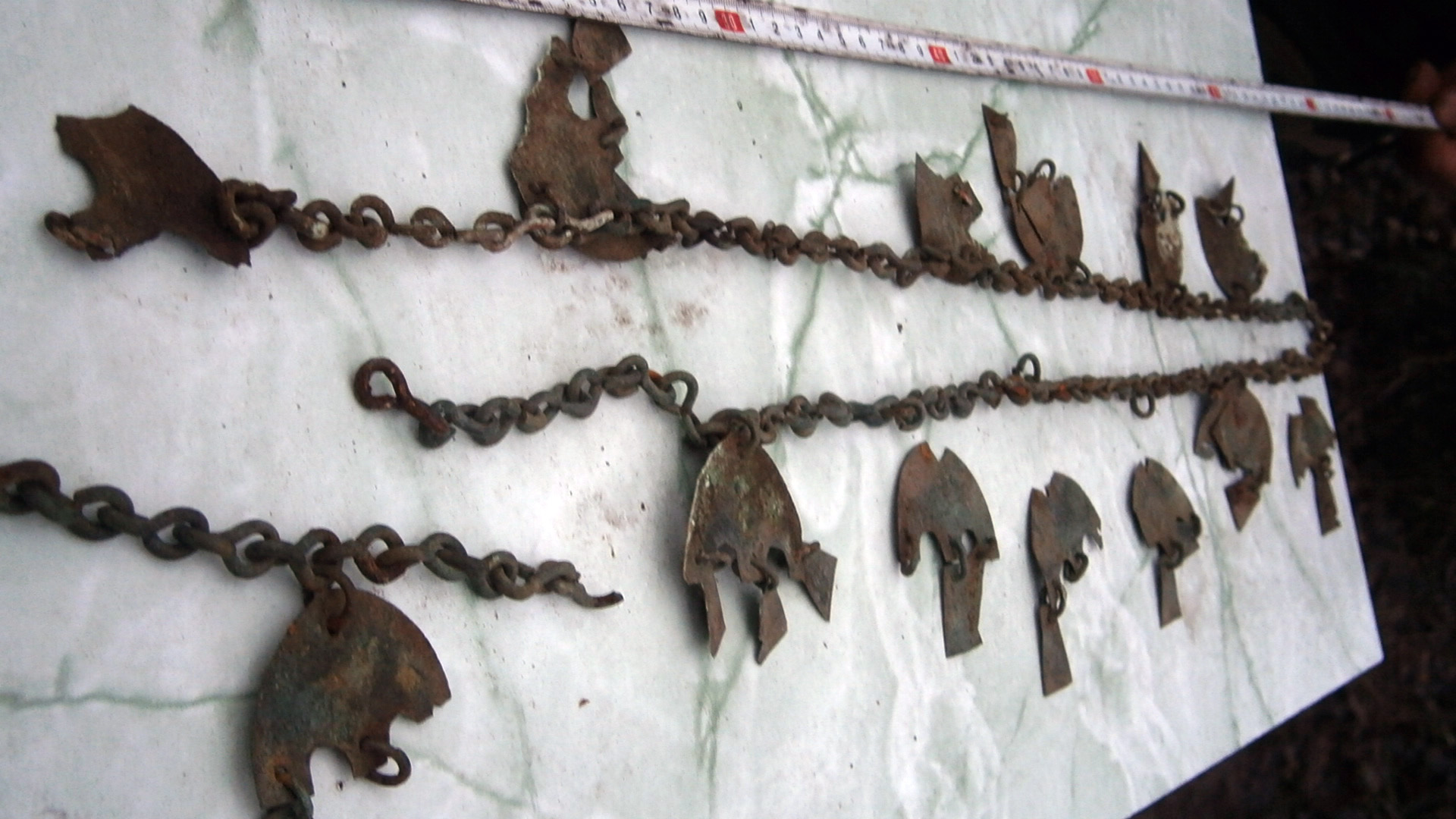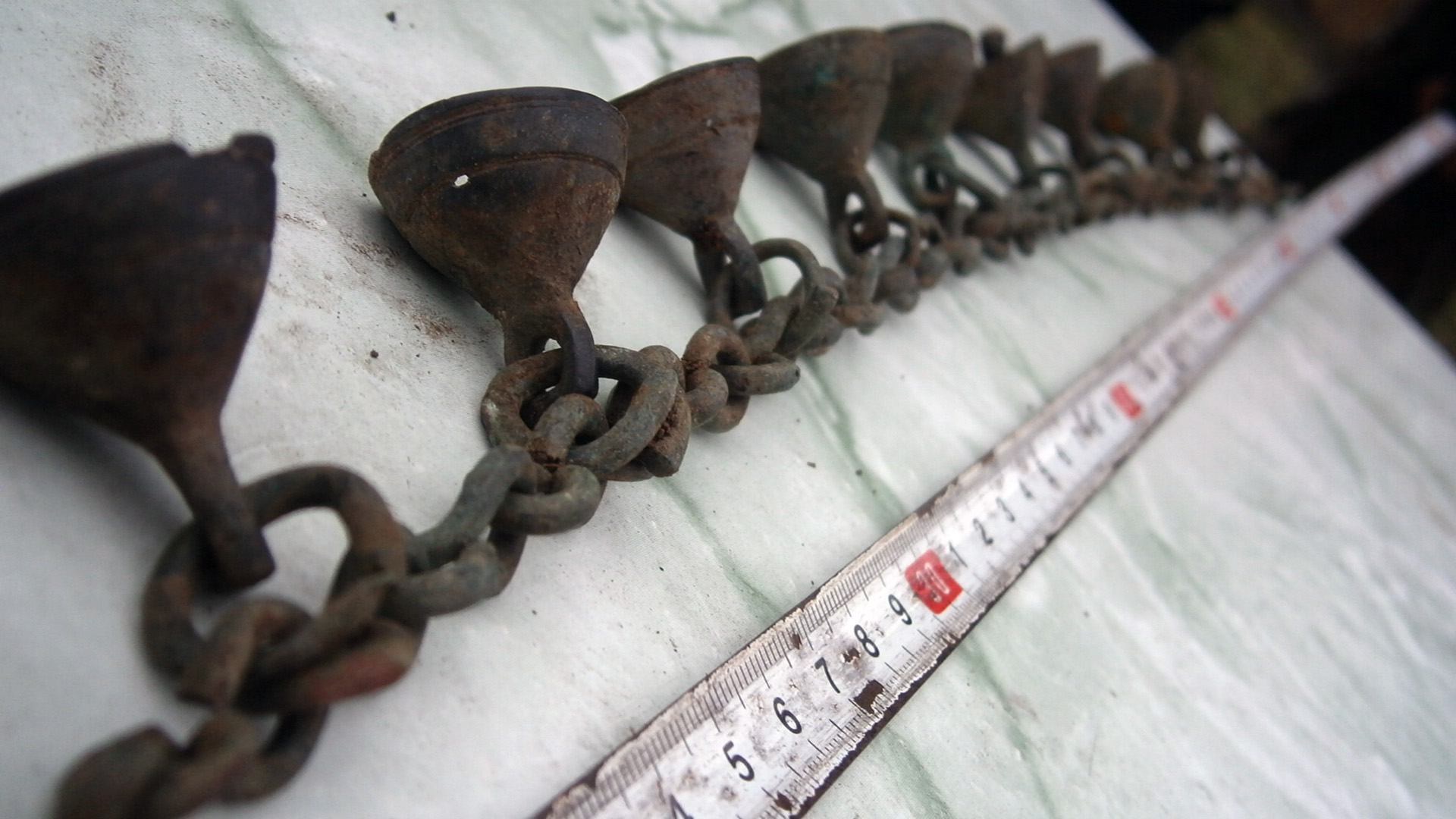 Один позолоченный и много бронзовых колокольчиков, закрепленных на цепиБронзовые конические колокольчики с внутренней петлей для подвешивания язычка. Подобные колокольчики широко представлены в ряде антских кладов (Козиевский, Новоодесский, Суджанский, Гапоновский).