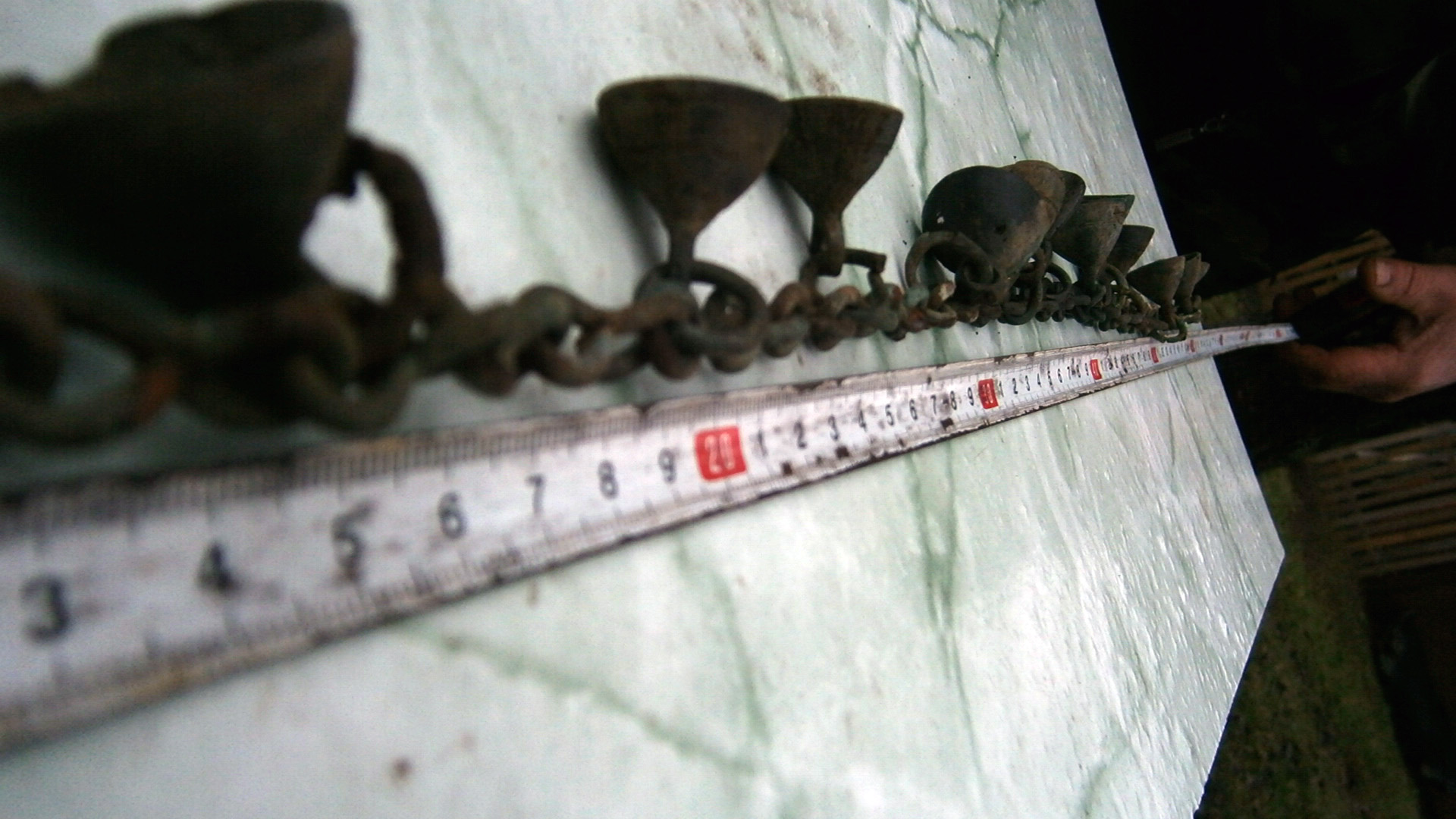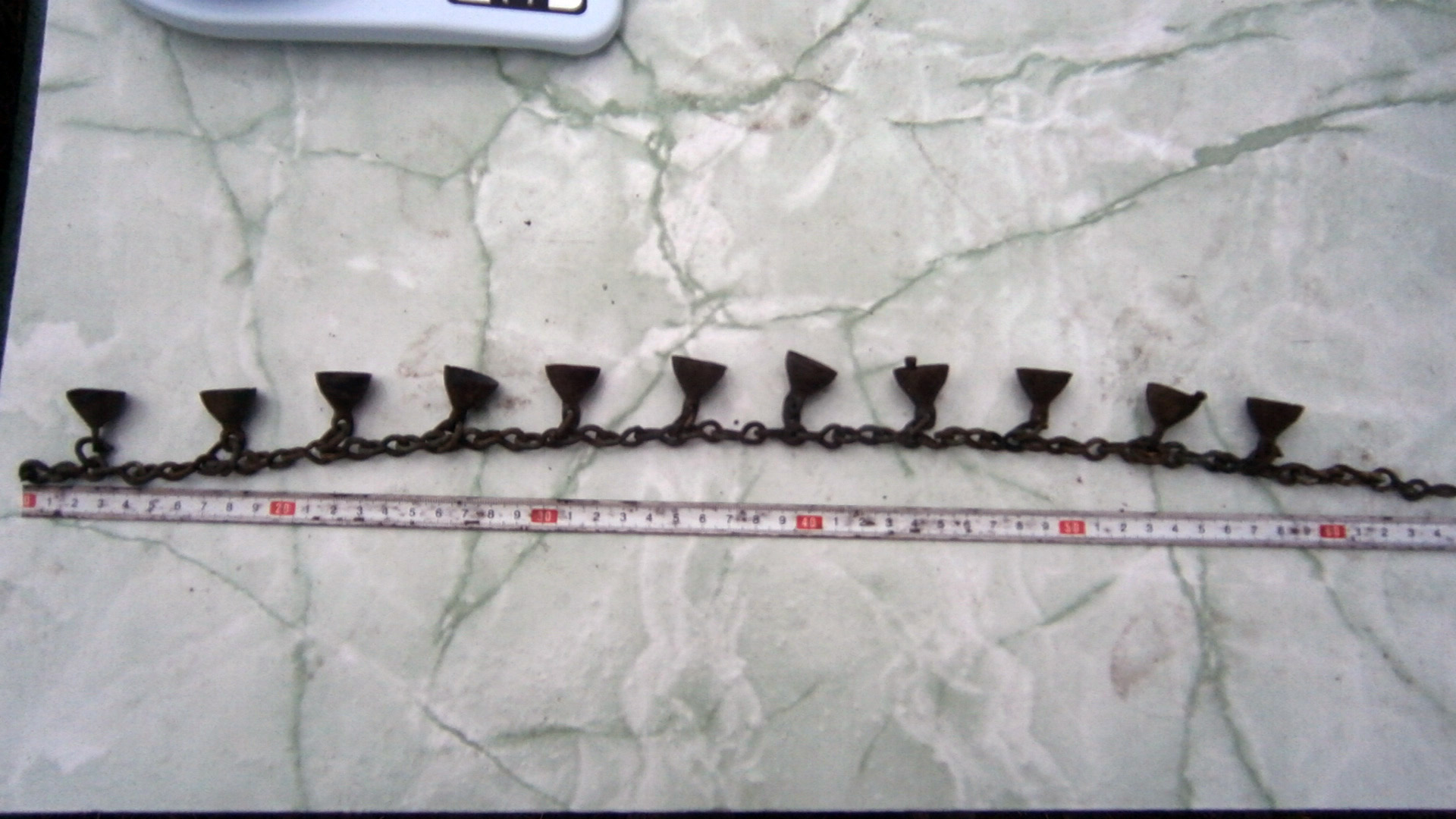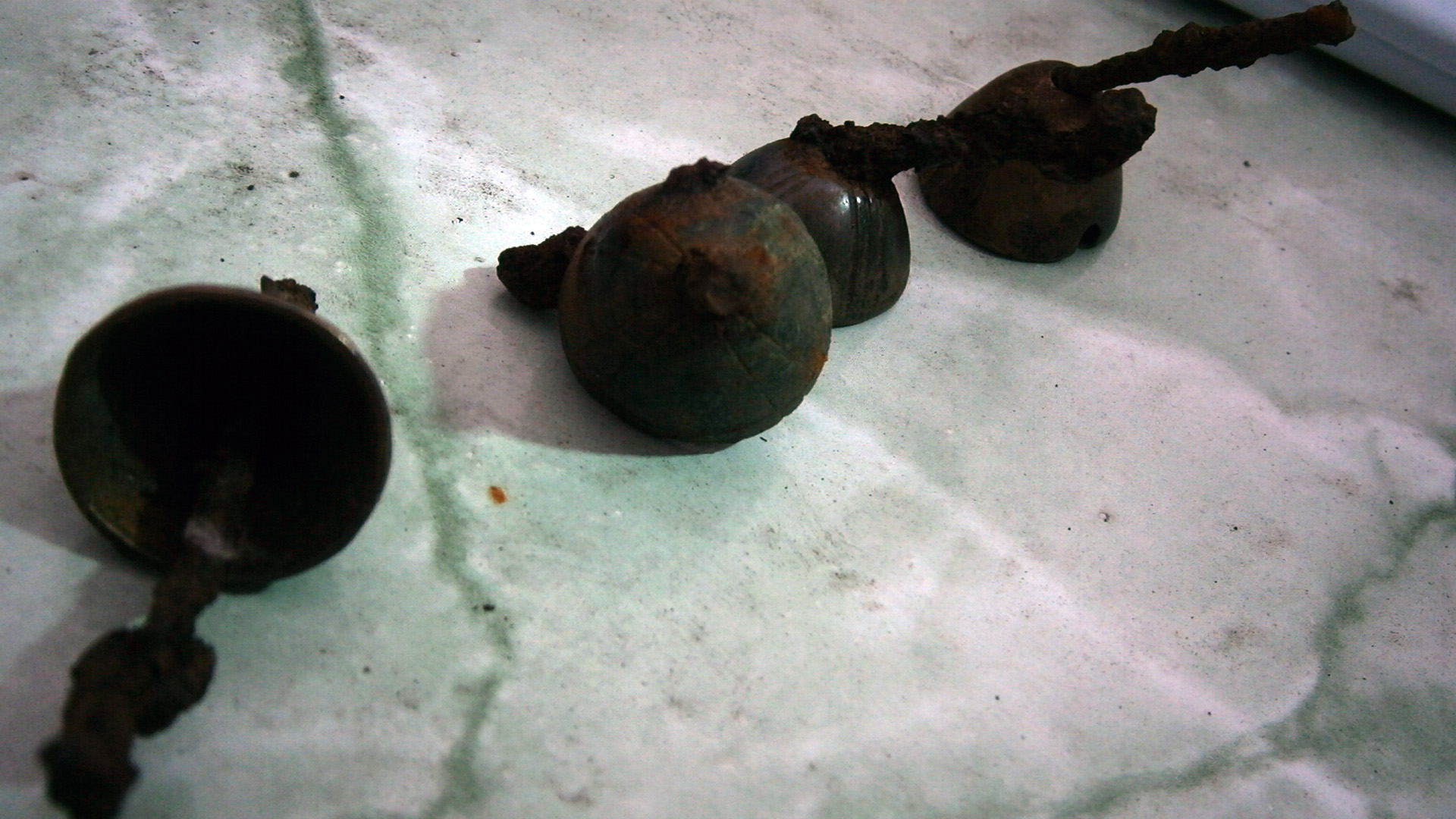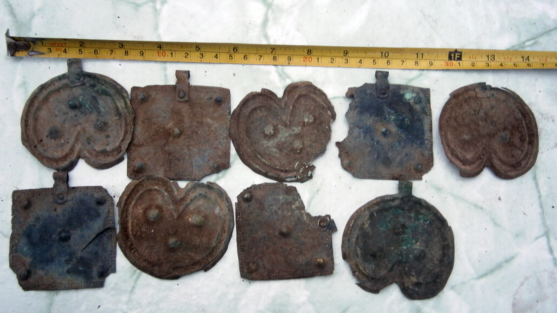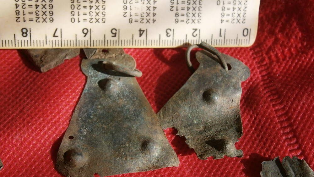 Один позолоченный и много бронзовых колокольчиков, закрепленных на цепиБронзовые конические колокольчики с внутренней петлей для подвешивания язычка. Подобные колокольчики широко представлены в ряде антских кладов (Козиевский, Новоодесский, Суджанский, Гапоновский).