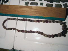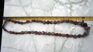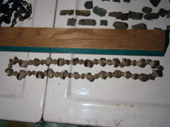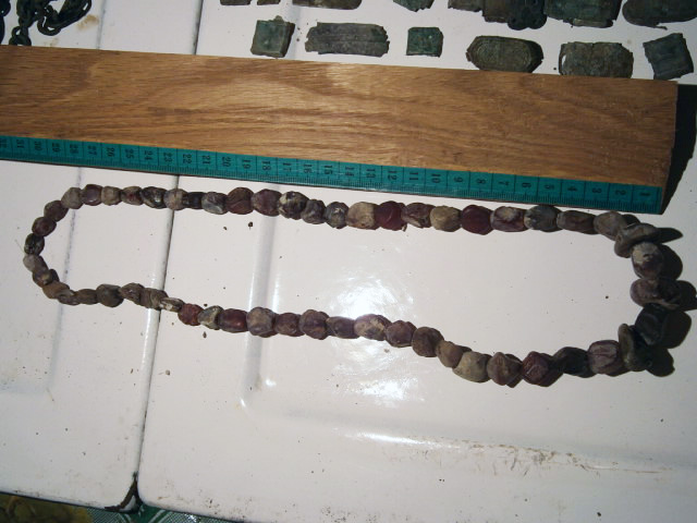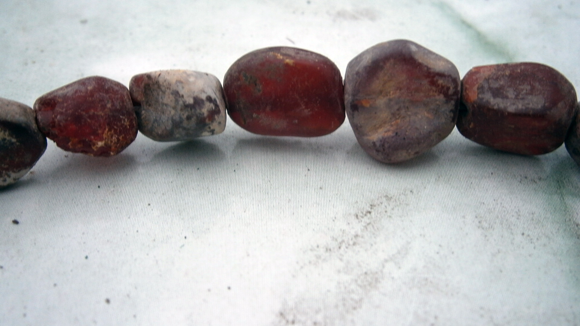 Славянские бусы, привески, поясные накладкиБусы из цветной стеклопасты характерны больше для готов Крыма, во всяком случае эллипсовидные бусины красно-кирпичного цвета бусы встречены в захоронениях раннего слоя Суук-Су. Одна бусина обнаружена в слое VI-VII вв. н.э. на Зимновском городище славянское городище на Волыни, относящееся к Пражской археологической культуре. Бусы находчик собирал сам так как представлял правильным, поэтому не очевидно что они такими были в те времена.