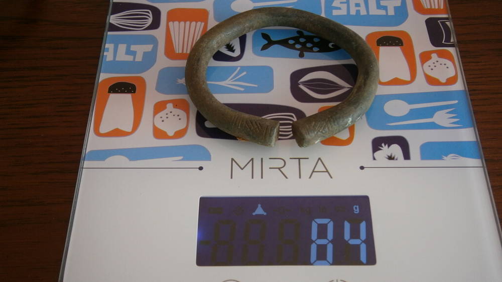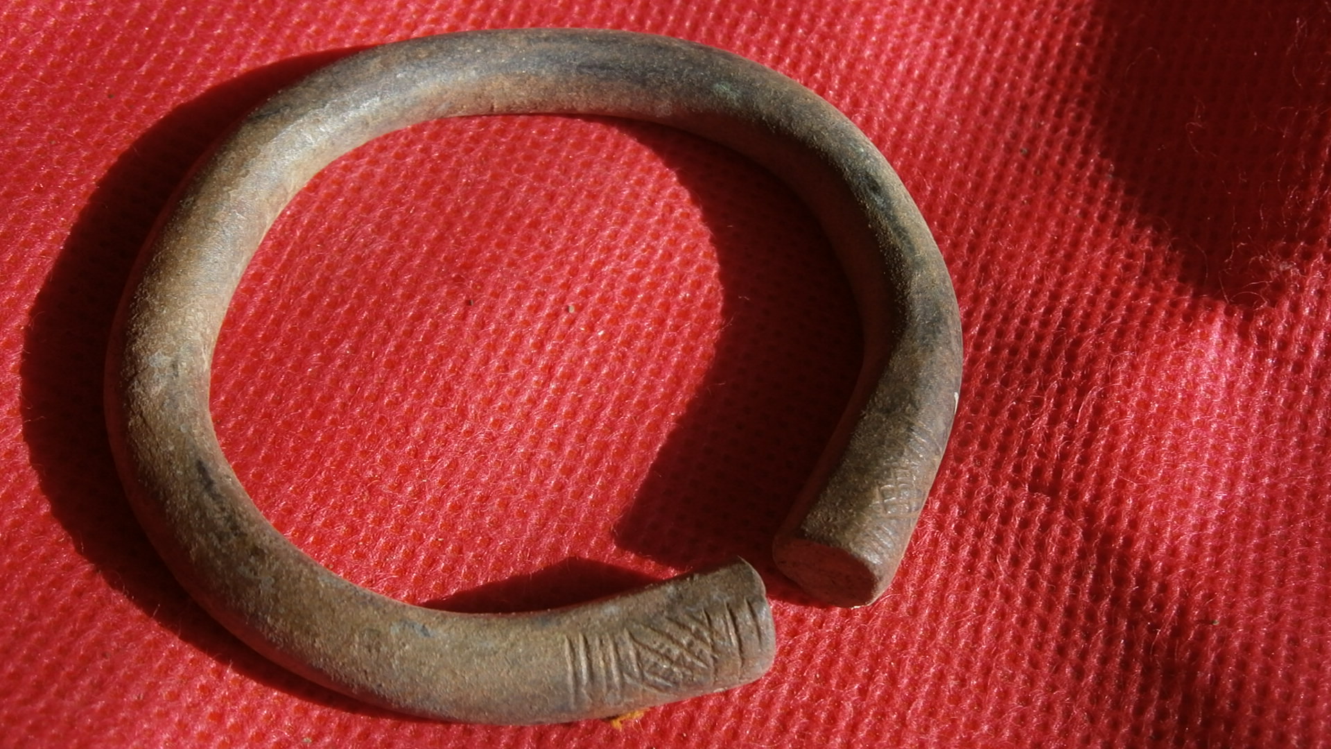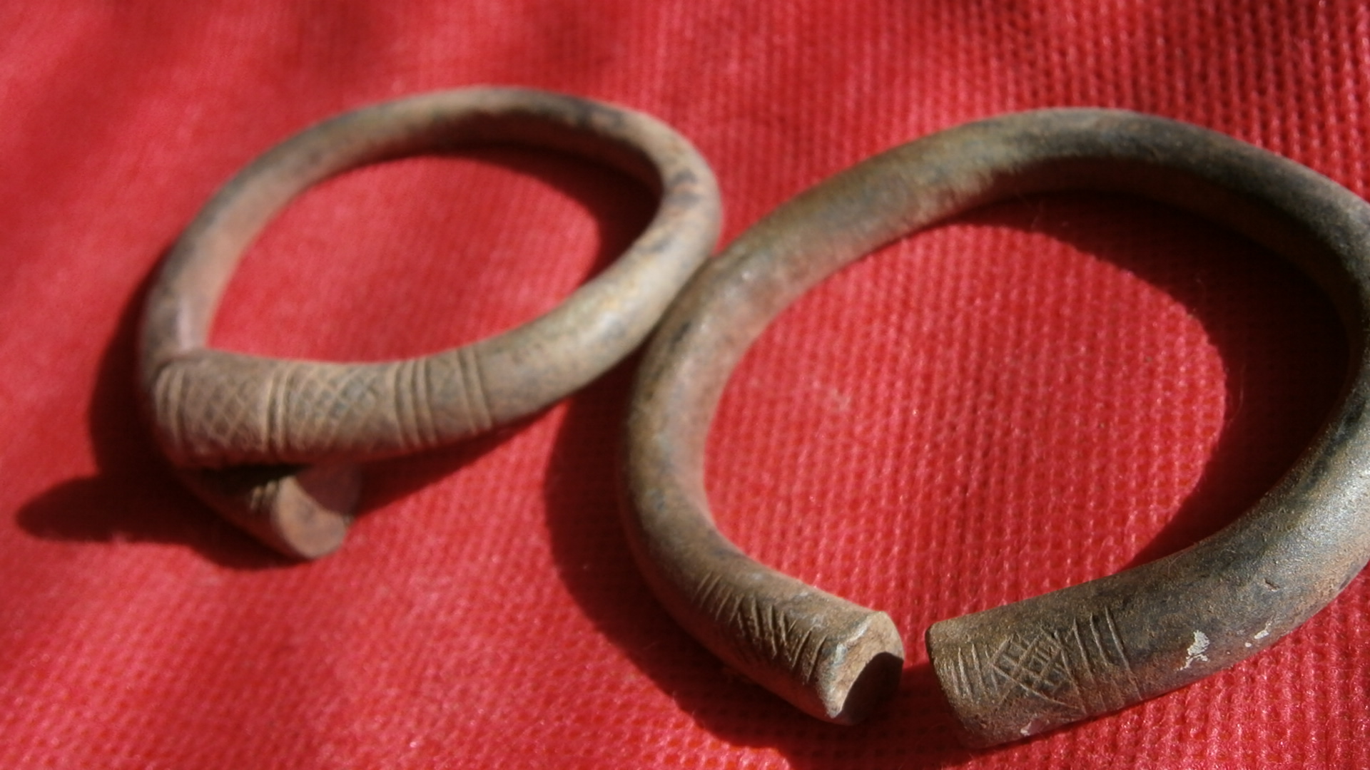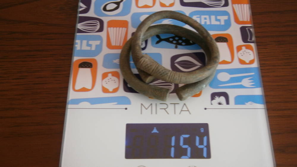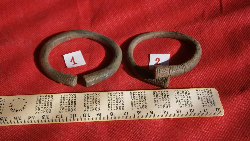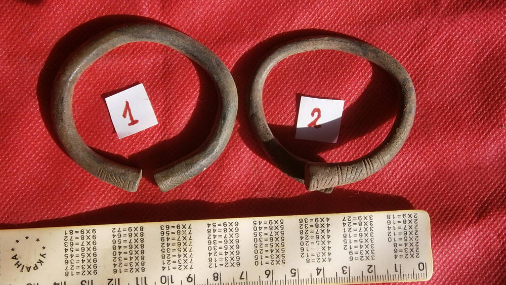 Пара бронзовых браслетов с плавно раширяющимися концамиТакие браслеты представляют собой кусок толстого, круглого в сечении прута с плавно расширяющегося по обеим концам, с тупыми окончаниями. На расширенные концах нанесен глубокий орнамент. Аналоги этих браслетов известны, например в Мартыновском кладе, а также по археологии Пеньковской и Пражкой культур.