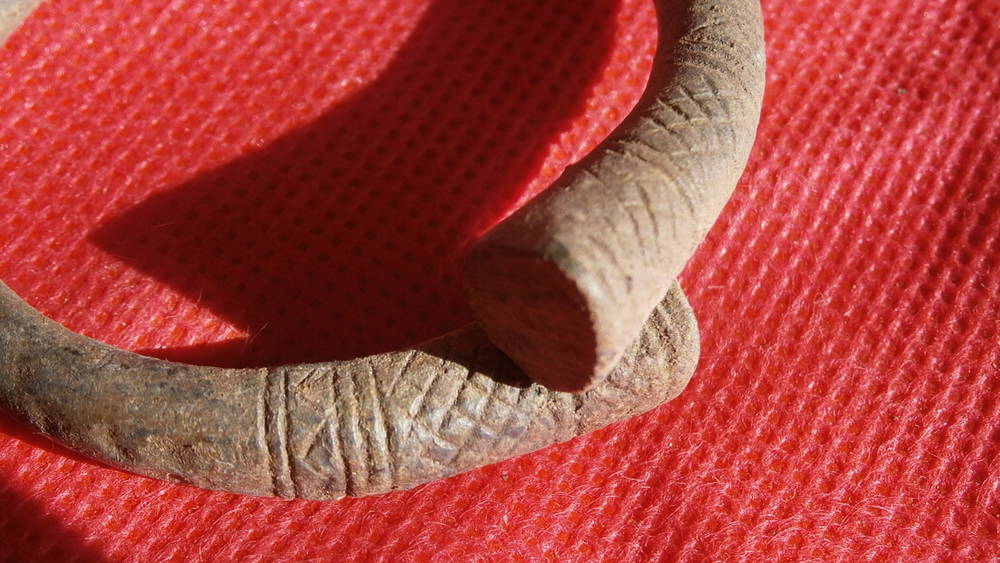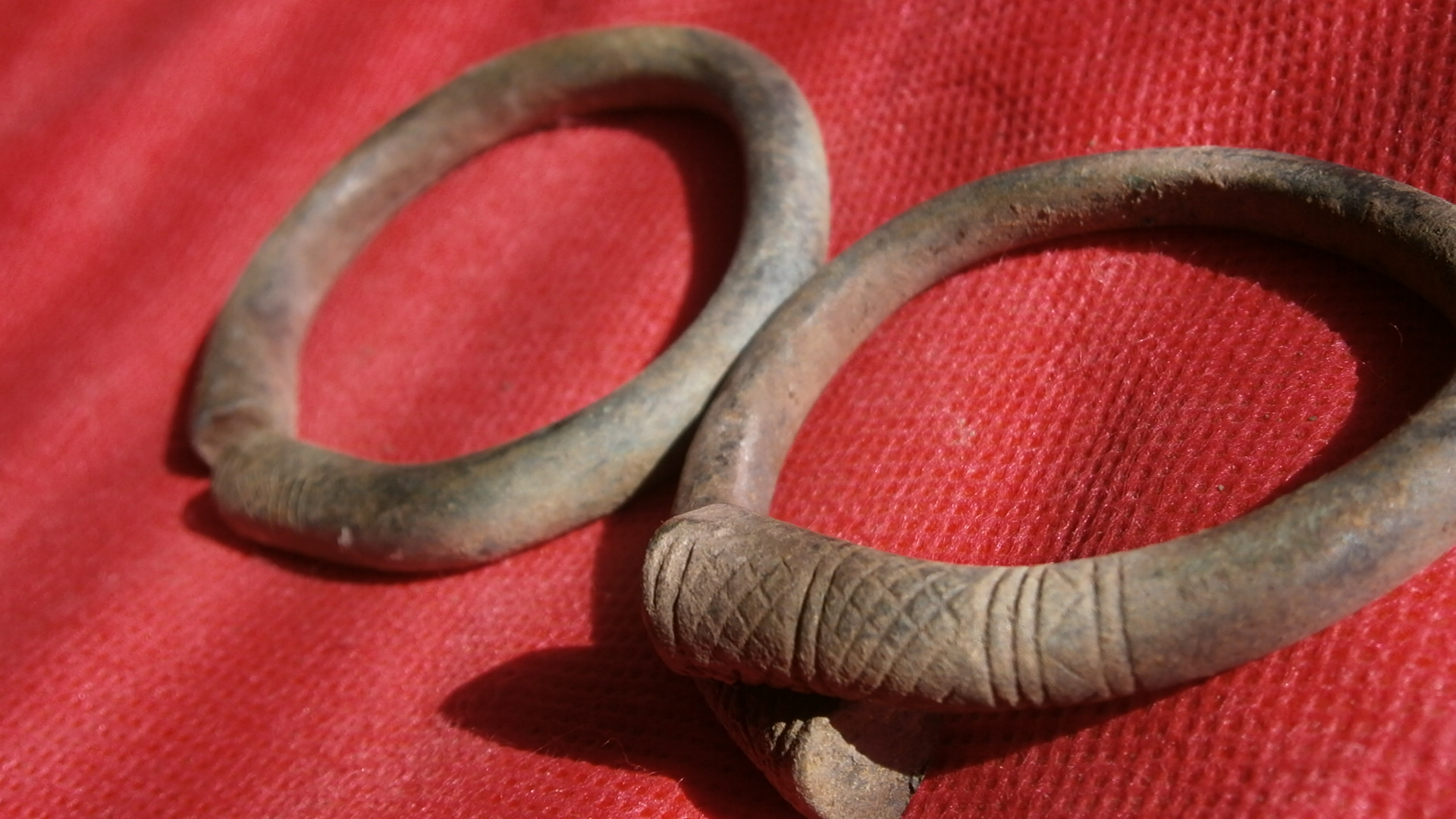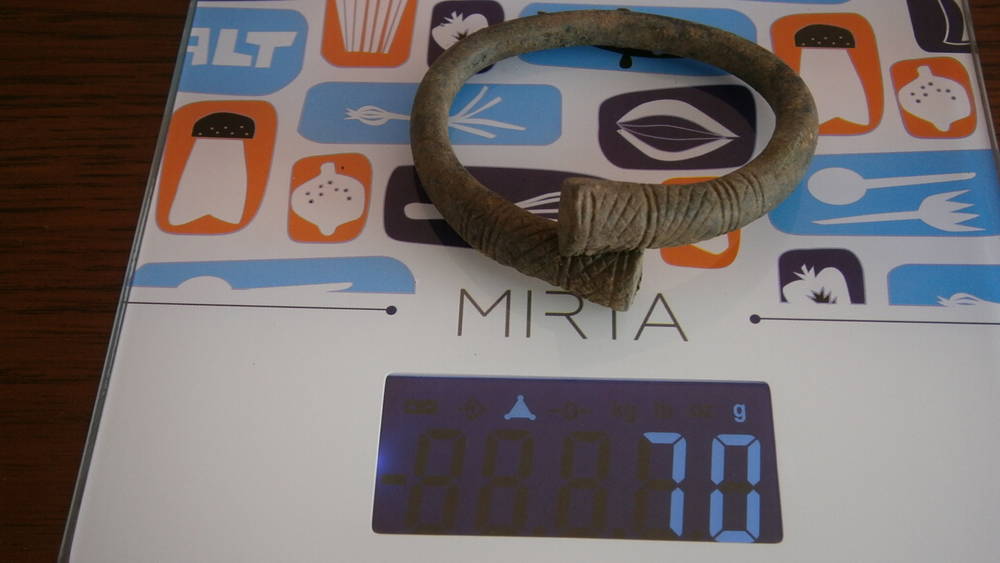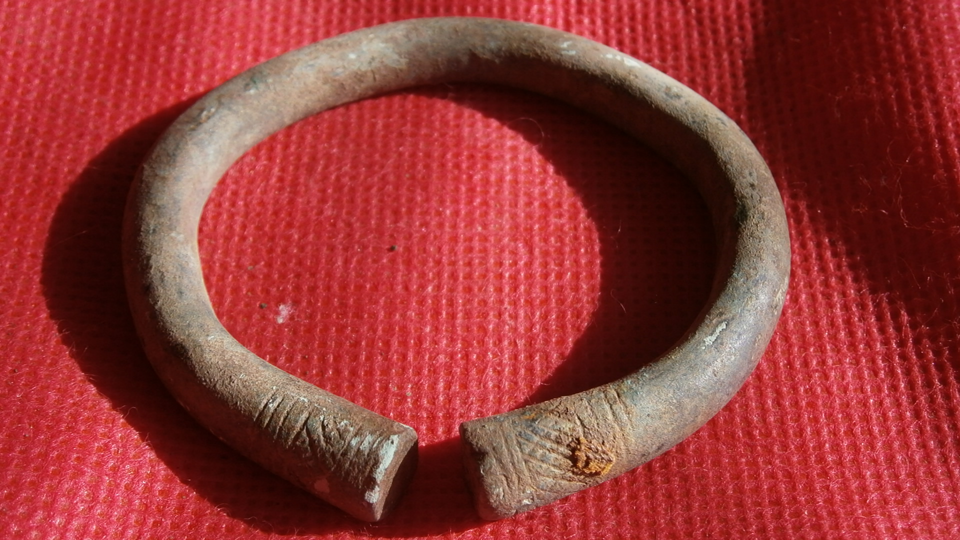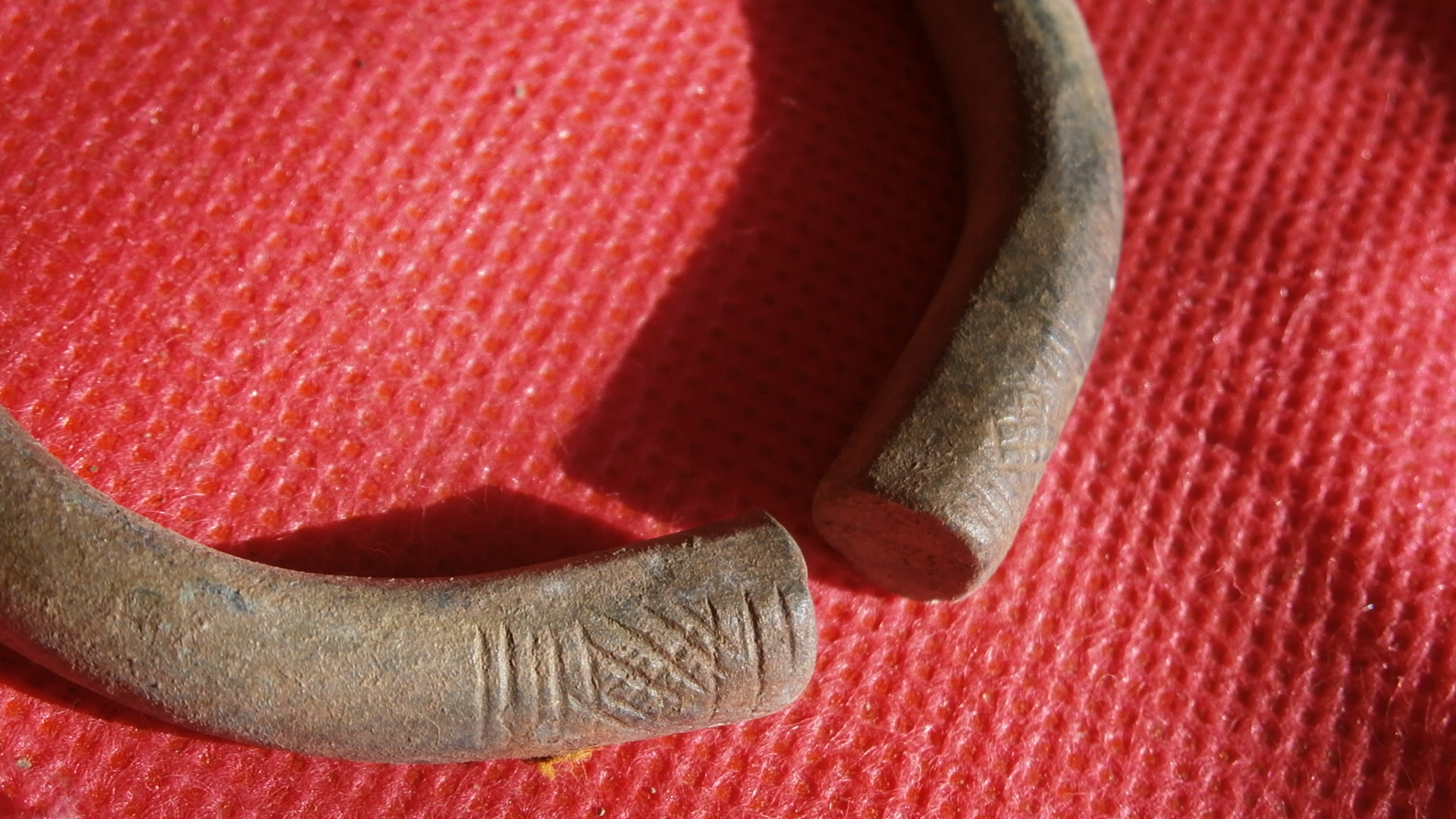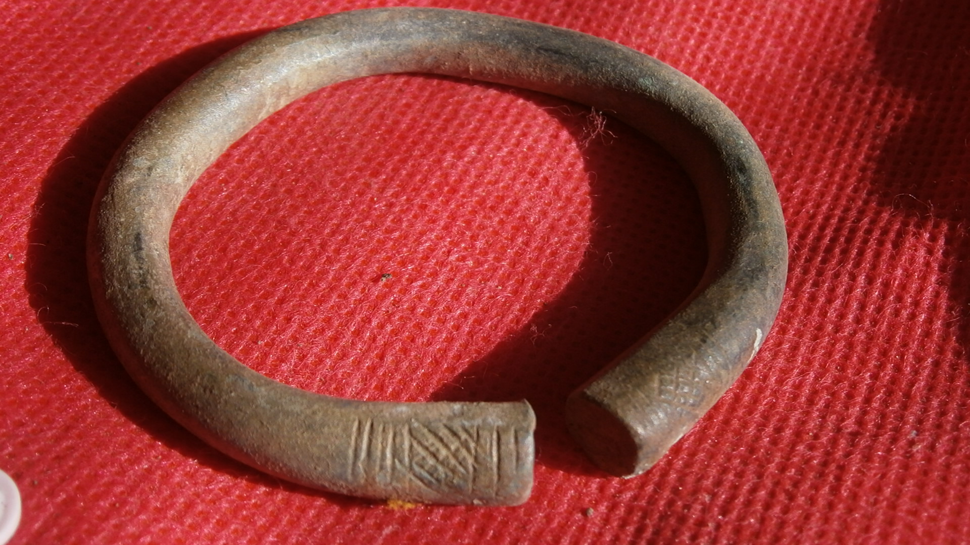 Пара бронзовых браслетов с плавно раширяющимися концамиТакие браслеты представляют собой кусок толстого, круглого в сечении прута с плавно расширяющегося по обеим концам, с тупыми окончаниями. На расширенные концах нанесен глубокий орнамент. Аналоги этих браслетов известны, например в Мартыновском кладе, а также по археологии Пеньковской и Пражкой культур.