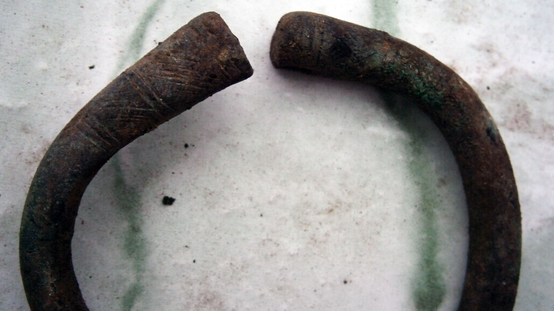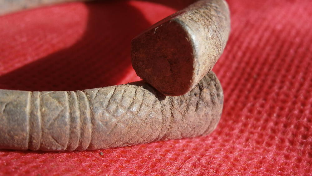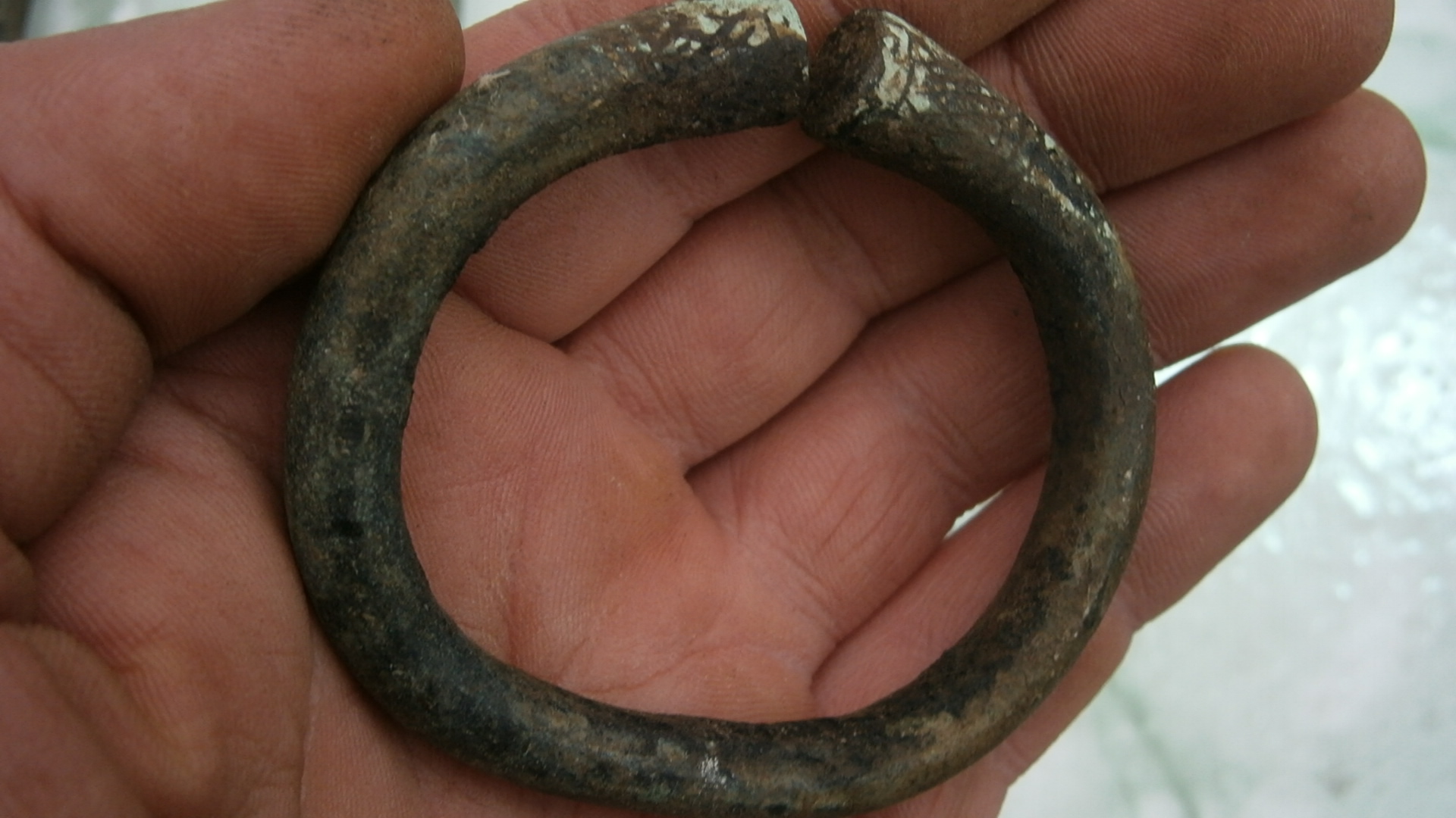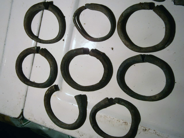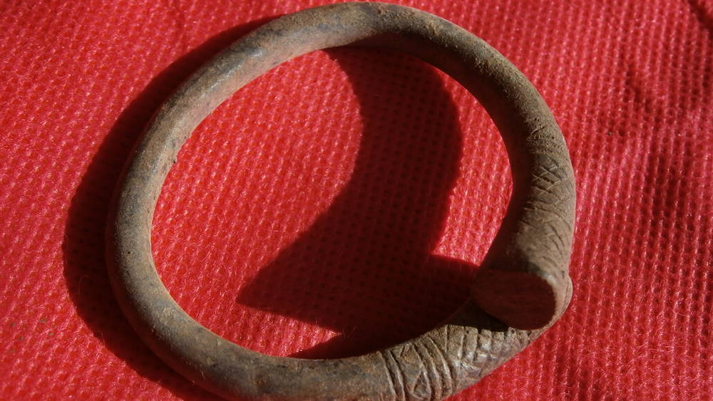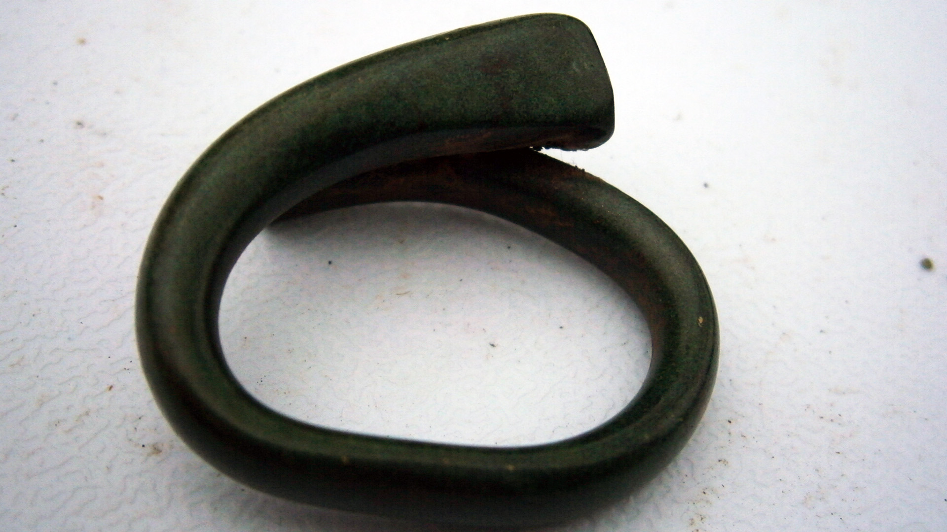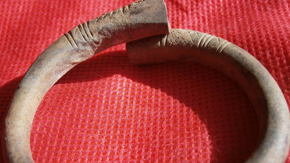 Пара бронзовых браслетов с плавно раширяющимися концамиТакие браслеты представляют собой кусок толстого, круглого в сечении прута с плавно расширяющегося по обеим концам, с тупыми окончаниями. На расширенные концах нанесен глубокий орнамент. Аналоги этих браслетов известны, например в Мартыновском кладе, а также по археологии Пеньковской и Пражкой культур.