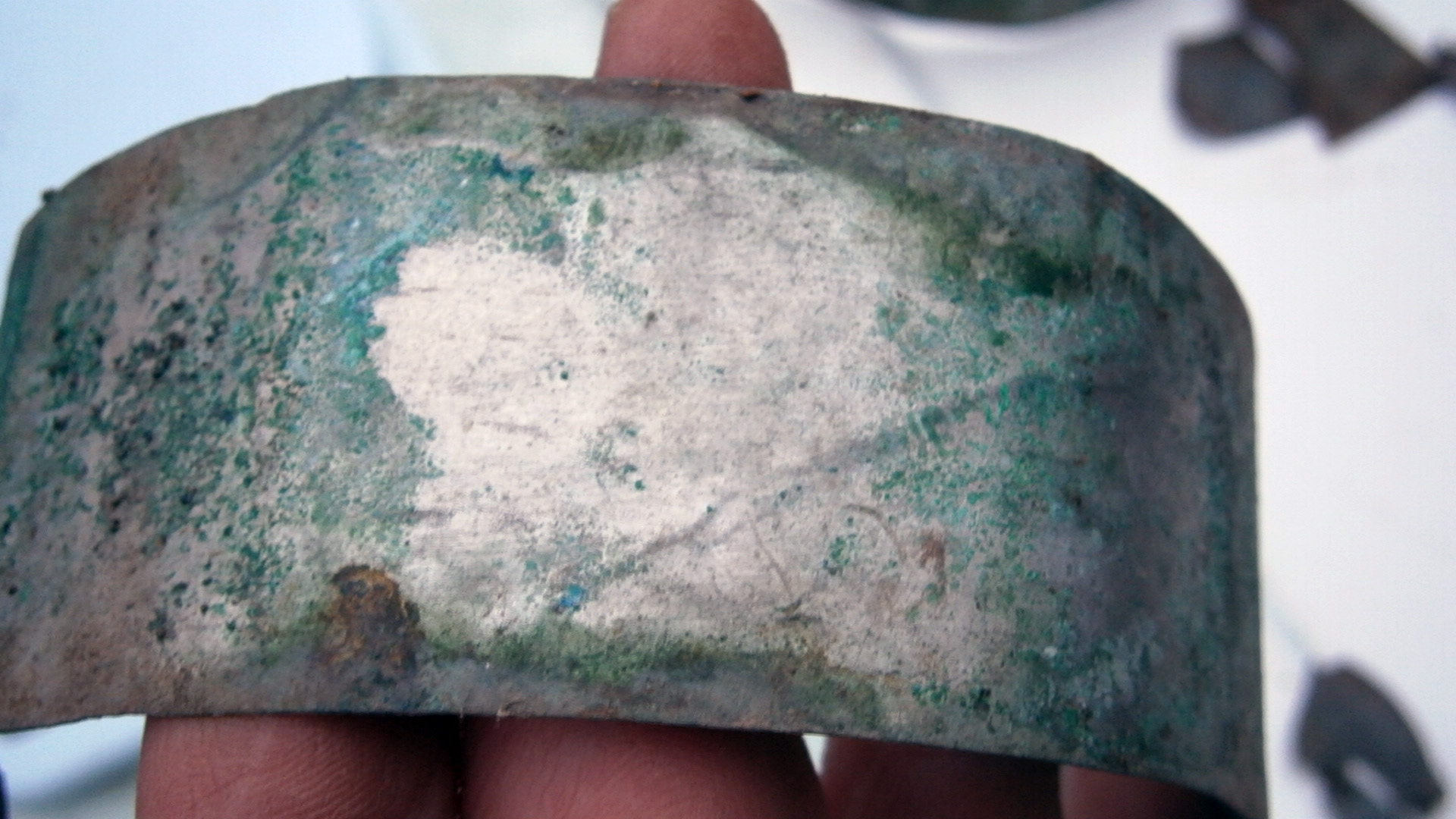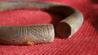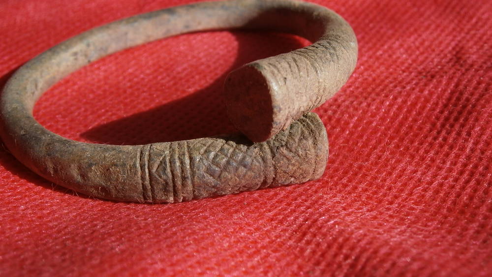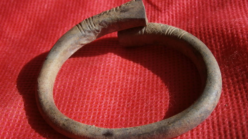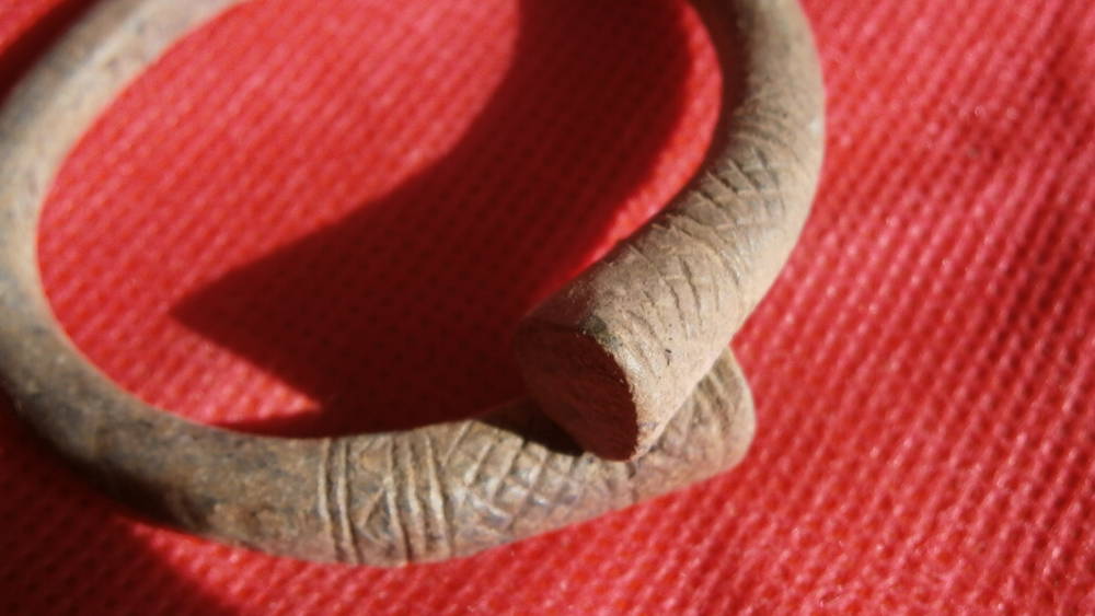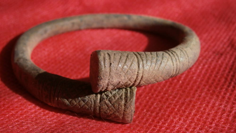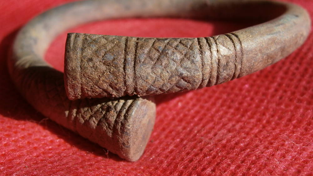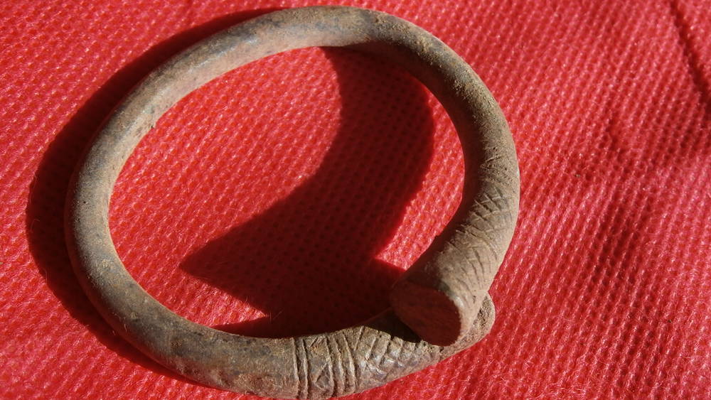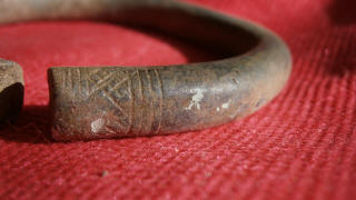 Пара бронзовых браслетов с плавно раширяющимися концамиТакие браслеты представляют собой кусок толстого, круглого в сечении прута с плавно расширяющегося по обеим концам, с тупыми окончаниями. На расширенные концах нанесен глубокий орнамент. Аналоги этих браслетов известны, например в Мартыновском кладе, а также по археологии Пеньковской и Пражкой культур.