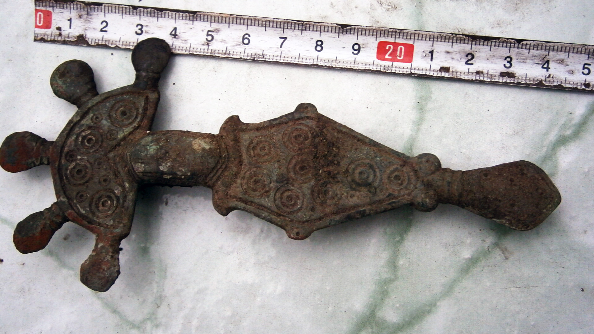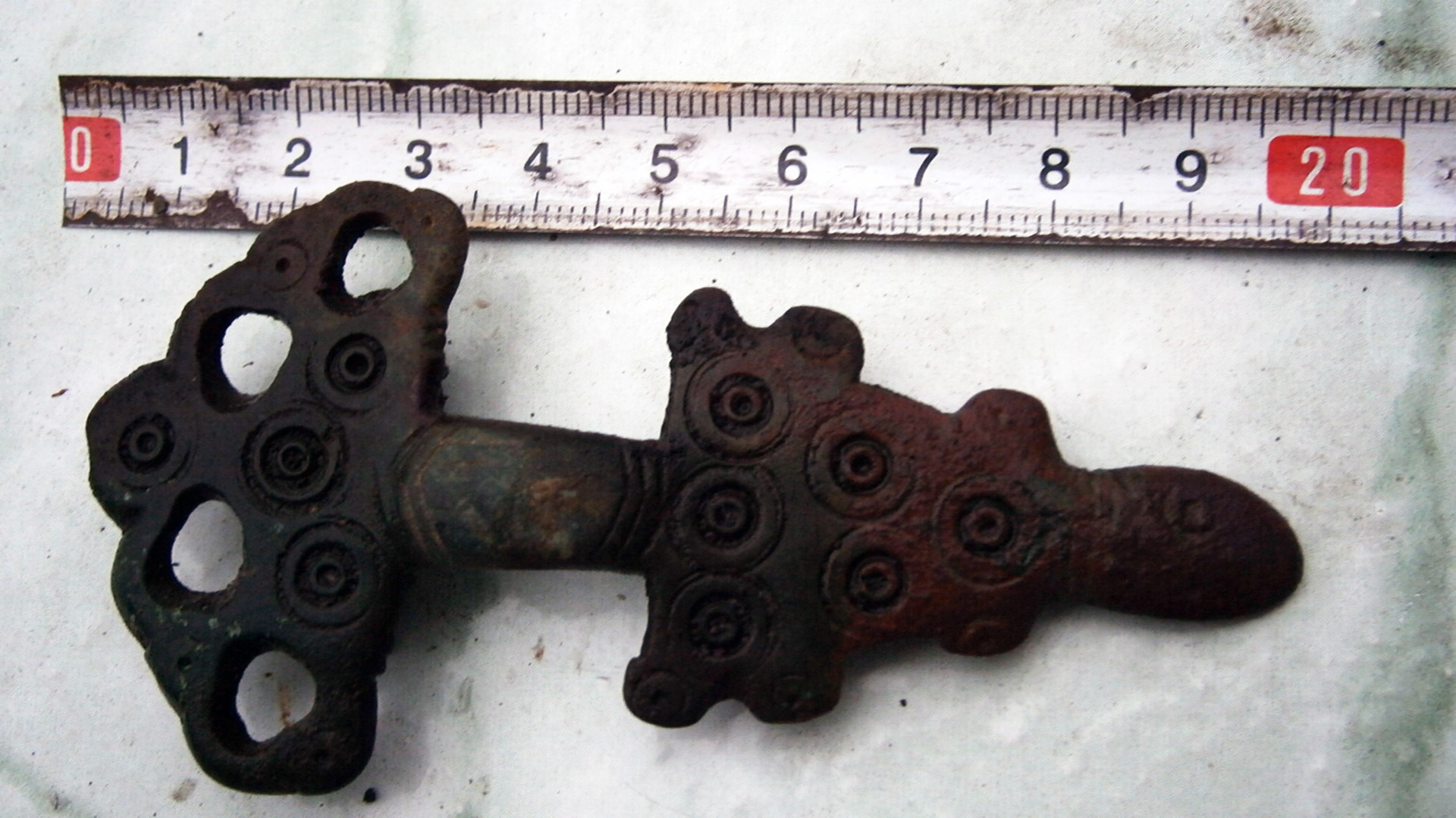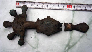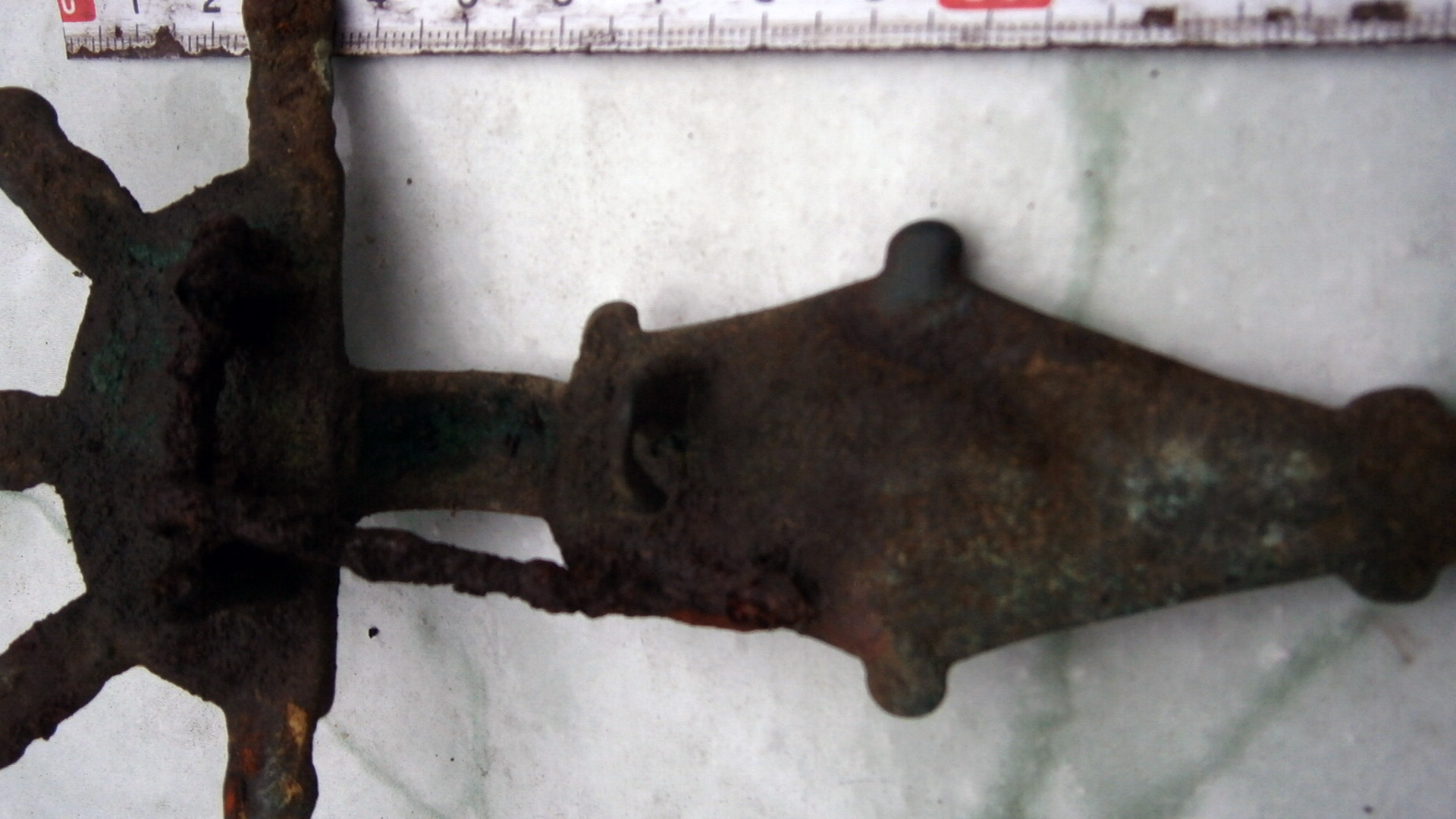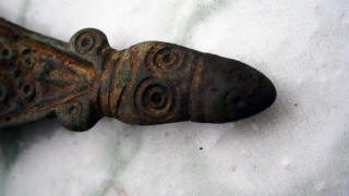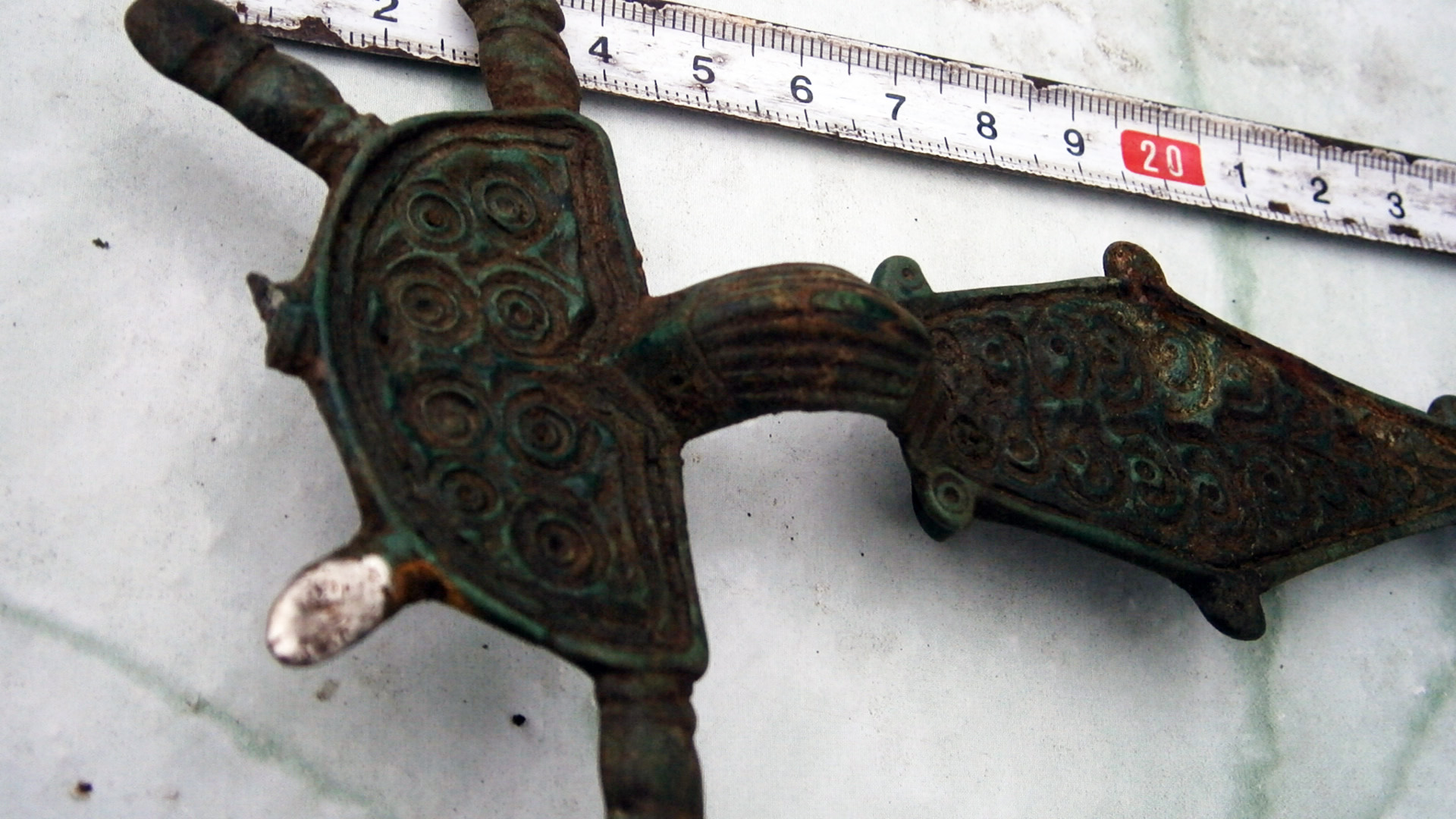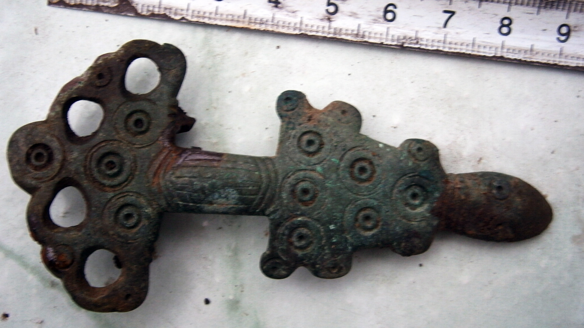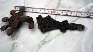 Пальчатые фибулы днепровского типаЛитые бронзовые пальчатые фибулы "днепровского" типа, украшенные циркульным и S-образным орнаментом, широко представлены в памятниках V-VII вв. н.э. юга Восточной Европы. Любопытно что одна фибула с обратной стороны имеет три выступа-нервюры для увеличения жесткости её конструкции, что однако не спасло её от слома еще в те стародавние времена.