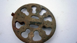 Фибула «Коловрат»Щиток фибулы в виде солнца-колеса из восьми лучей вокруг перемычки по внешнему периметру ограничивающимся ободком. Два луча спицы проходящие по одной линии с перемычкой толще других. Каждая спица имеет по две метки циркулем, а одна особо толстая три, что придает фибуле антропозооморфный вид.