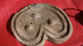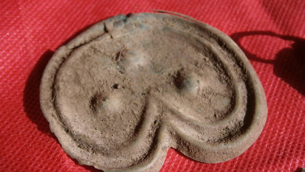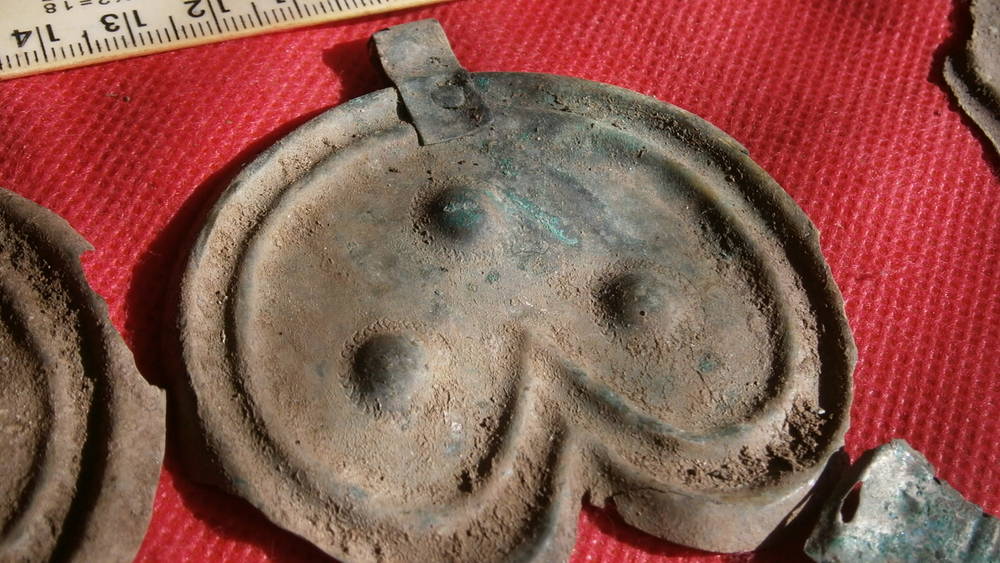 Фибулы с каймой из птичьих головФибулы днепровского типа с схематичными изображениями шести птичьих головок центральной человеческой головой на щитке, с шестиугольной ножкой с вогнутыми боковыми сторонами. Украшенная точечным орнаментом. С обратной стороны частично сохранились петли от иглоприемника, по обратной стороне проходит выступ-нервюра для усиления прочности фибул.