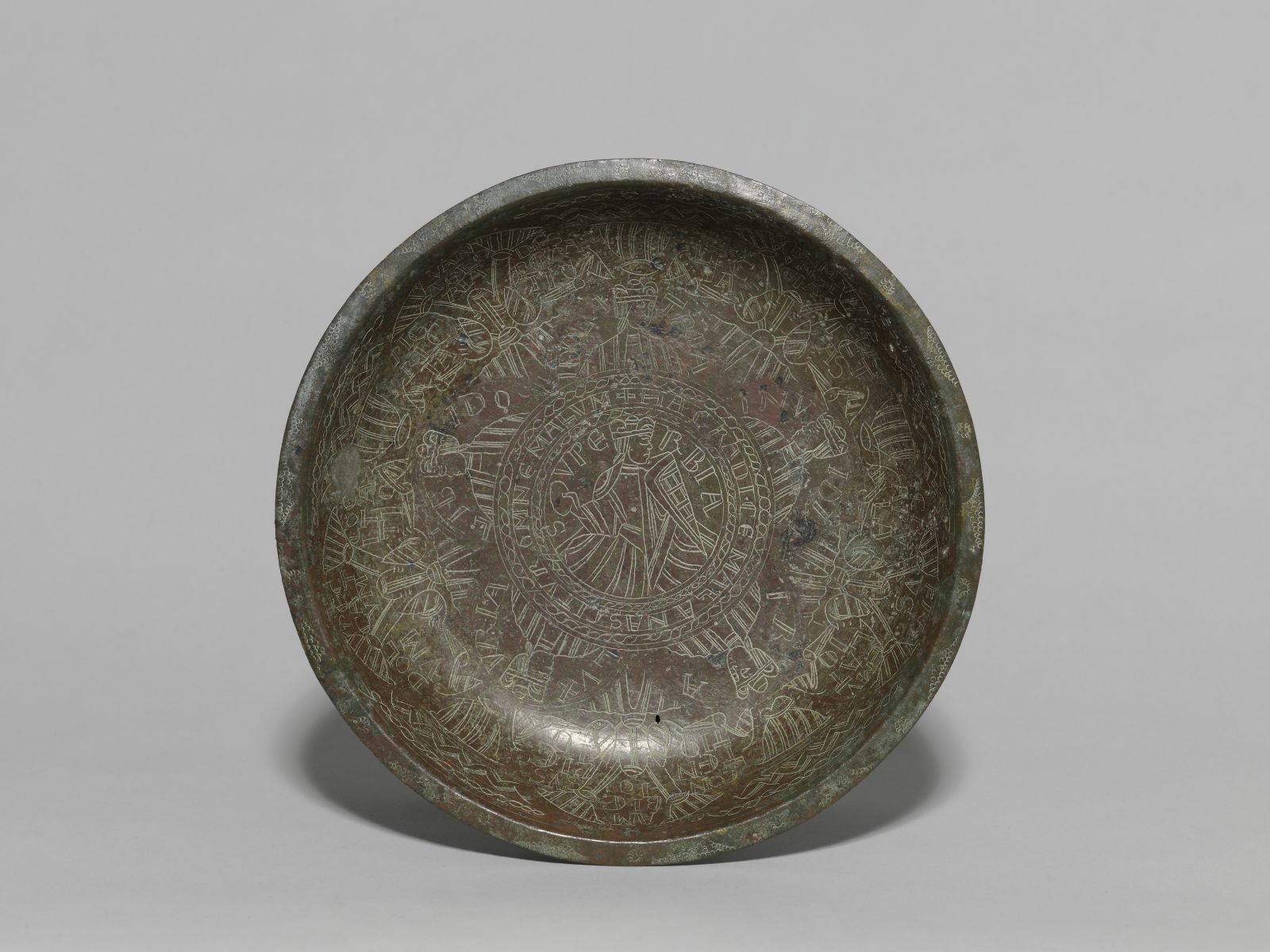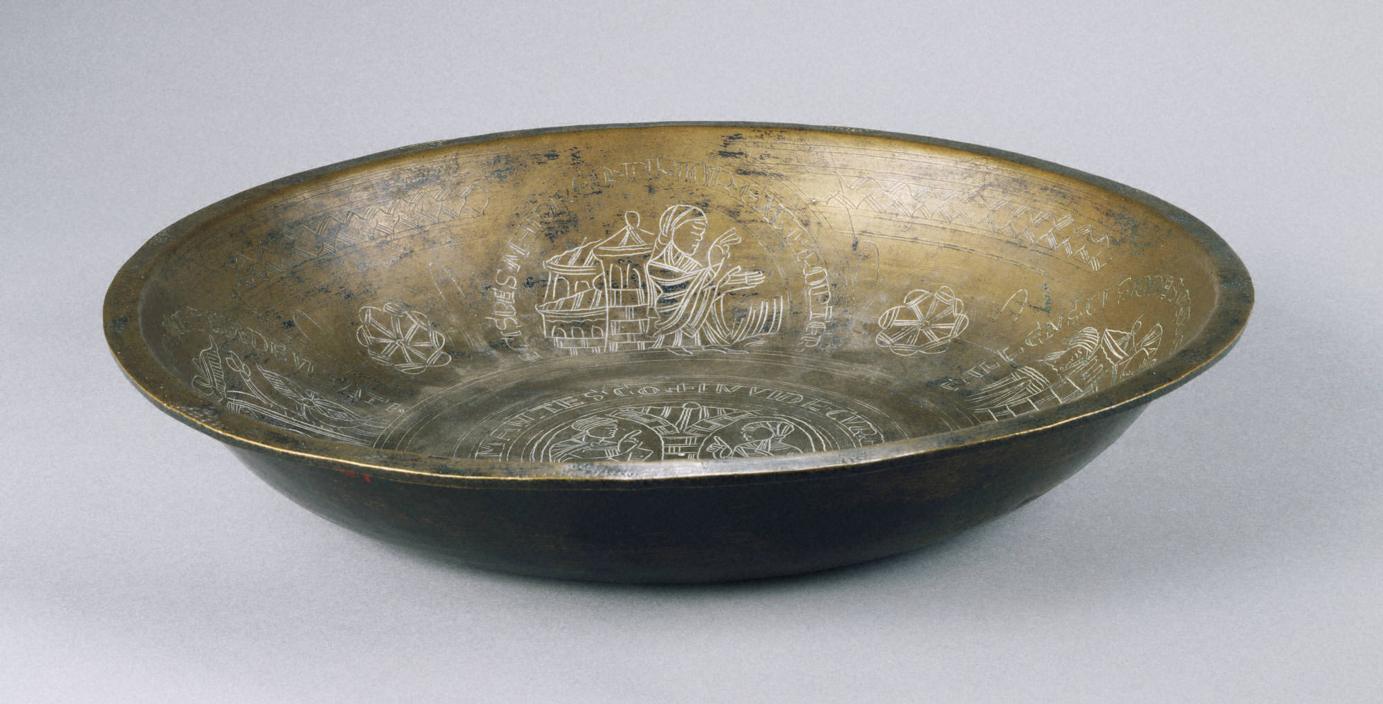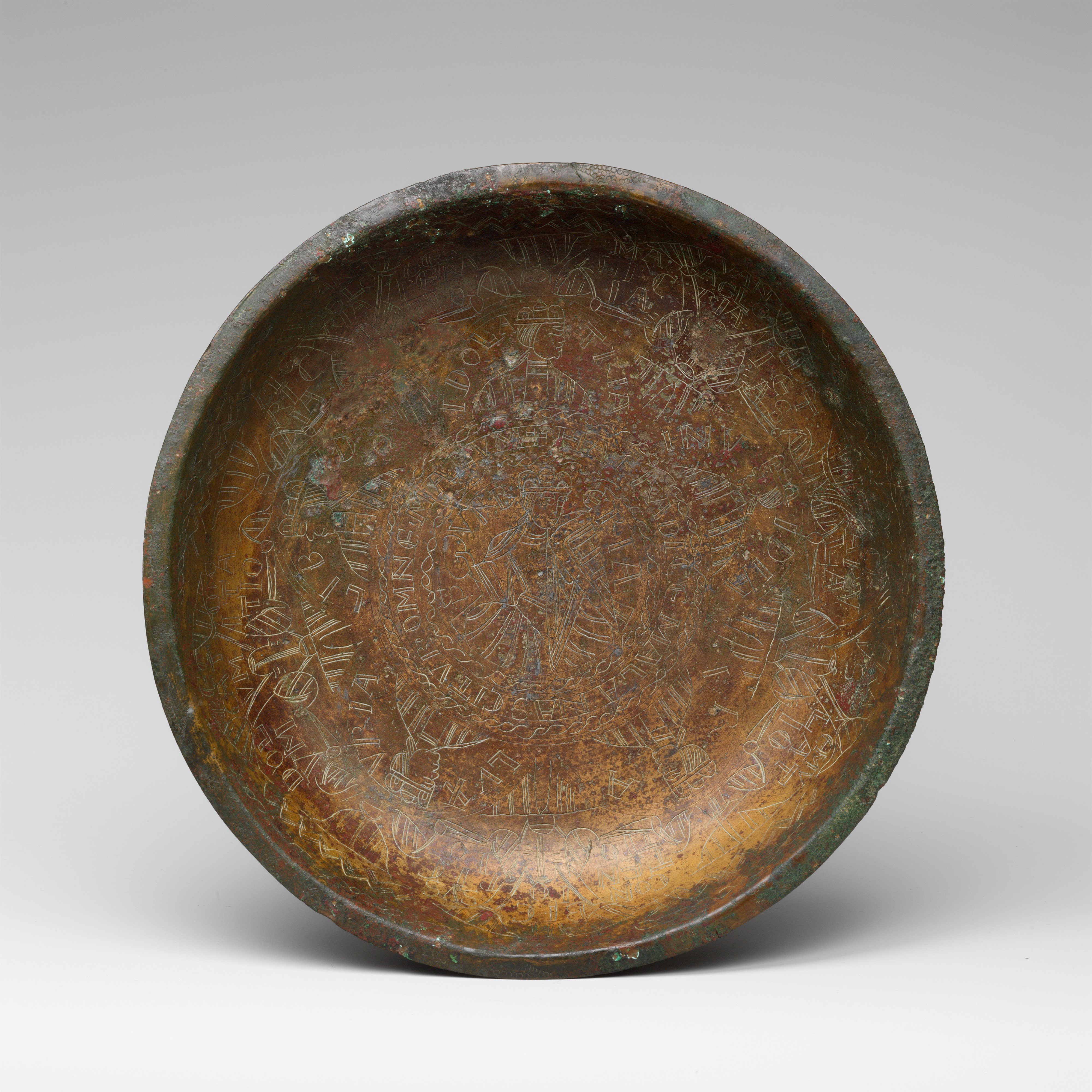Engraved Bowl metmuseum.org Date: ca. 1130 Culture: Netherlandish Medium: Copper alloy, wrought Dimensions: Overall: 10 7/16 x 1 7/8 in. (26.5 x 4.8 cm) Classification: Metalwork-Copper alloy Credit Line: The Cloisters Collection, 1965 Accession Number: 65.89
