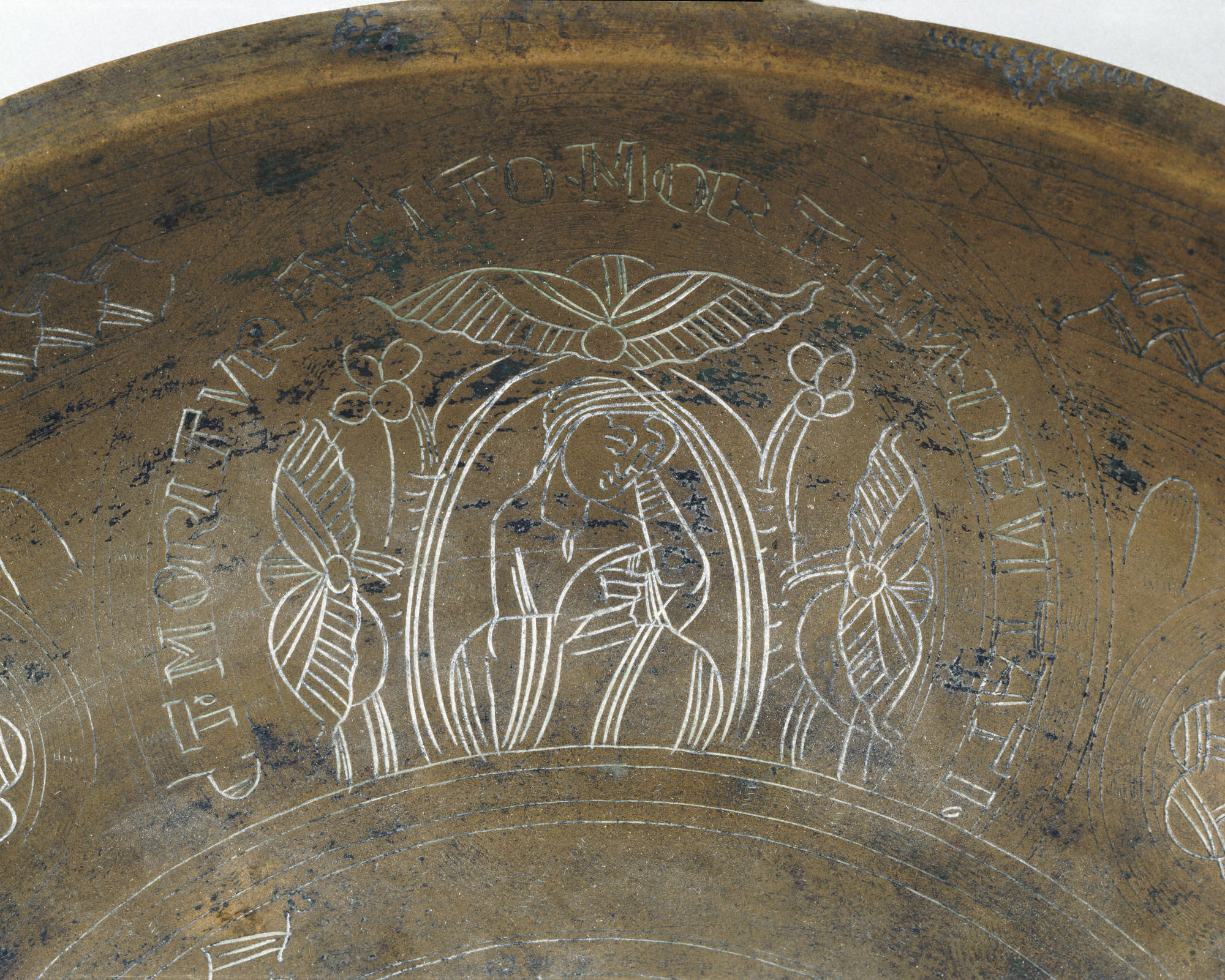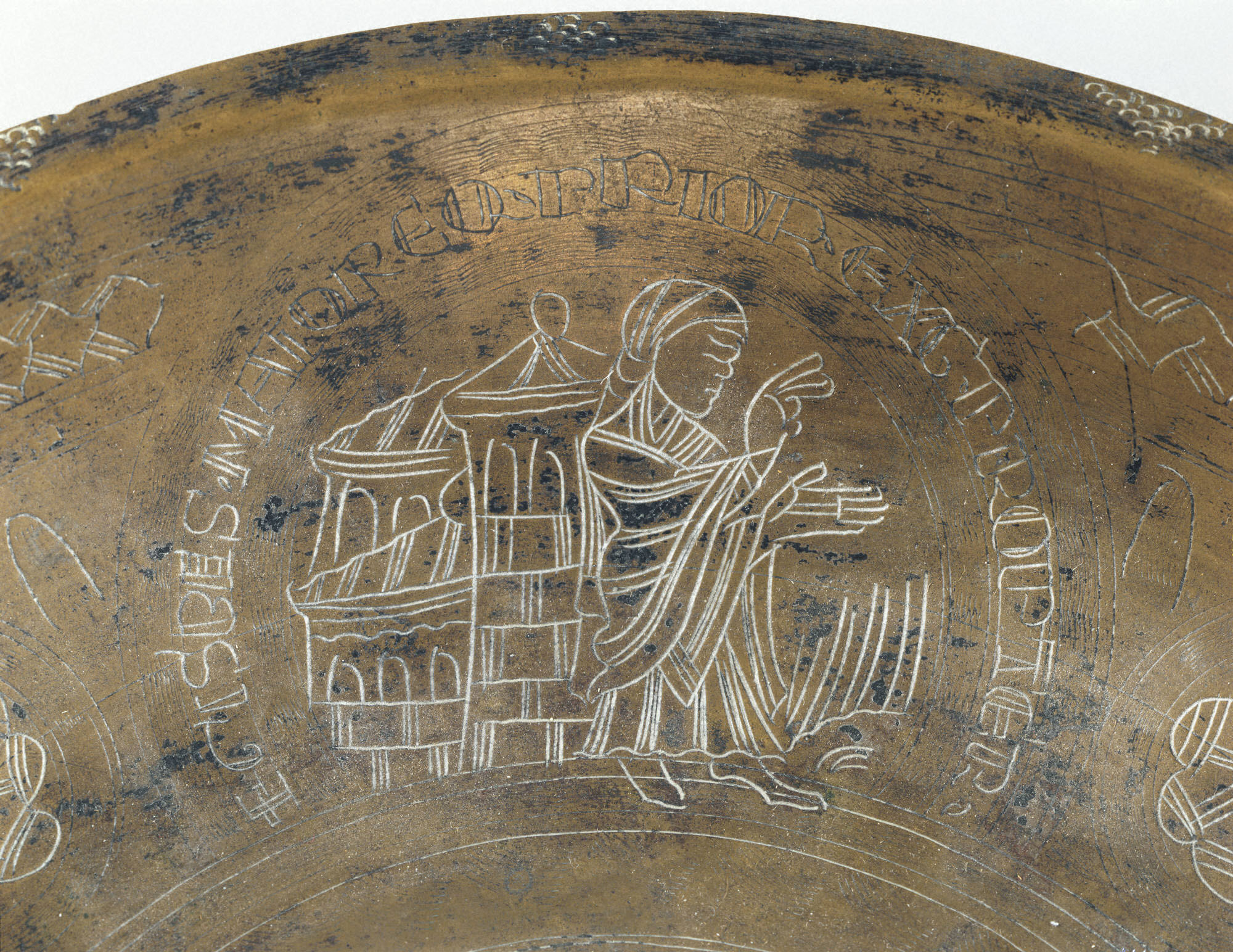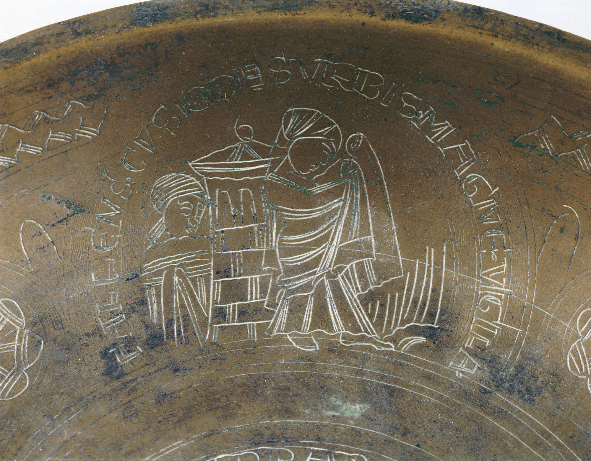 Engraved Bowl metmuseum.org Date: ca. 1130 Culture: Netherlandish Medium: Copper alloy, wrought Dimensions: Overall: 10 7/16 x 1 7/8 in. (26.5 x 4.8 cm) Classification: Metalwork-Copper alloy Credit Line: The Cloisters Collection, 1965 Accession Number: 65.89