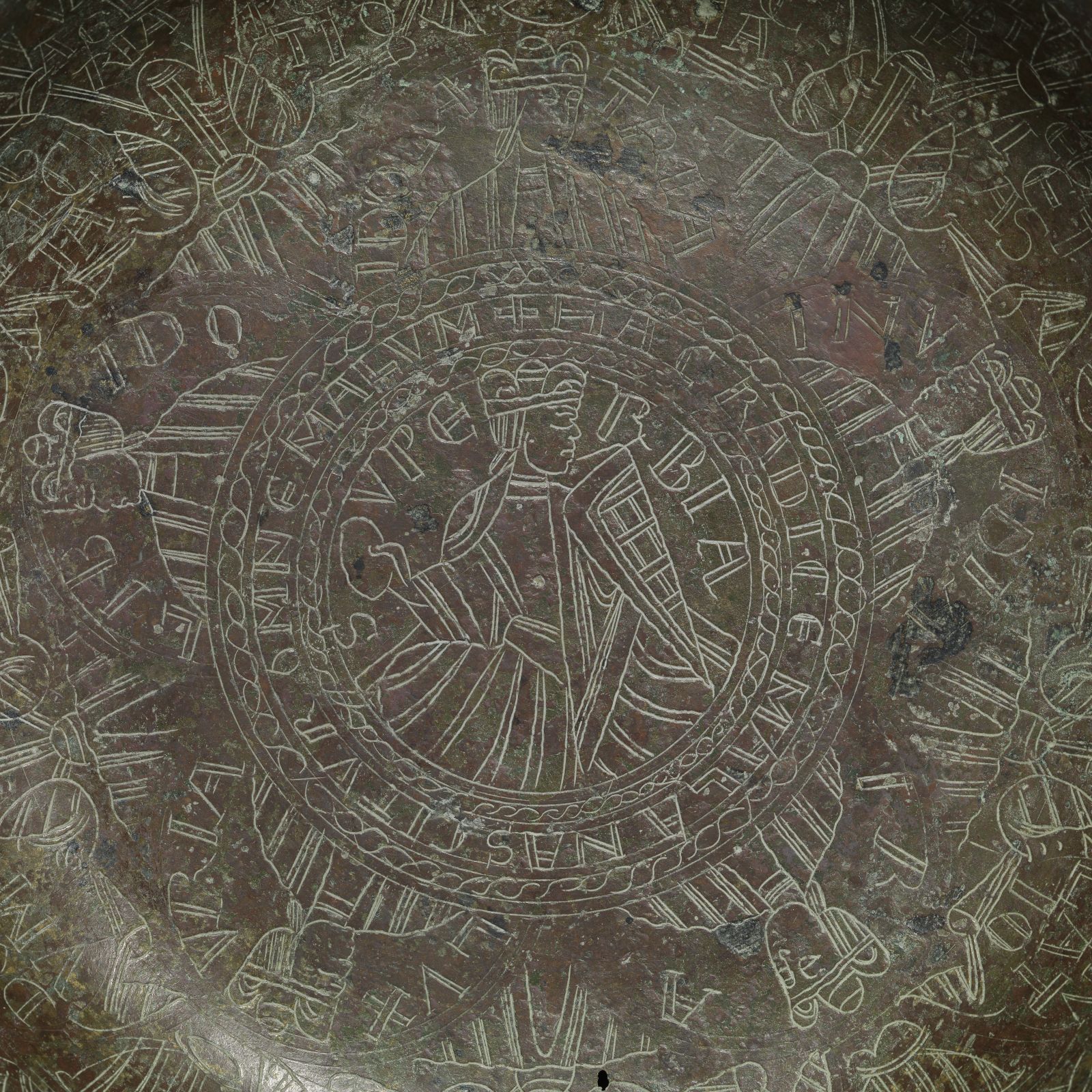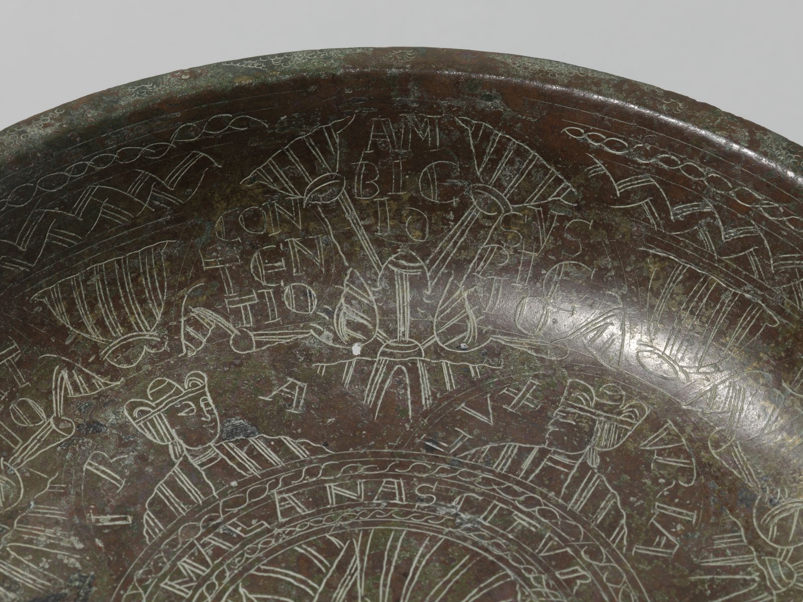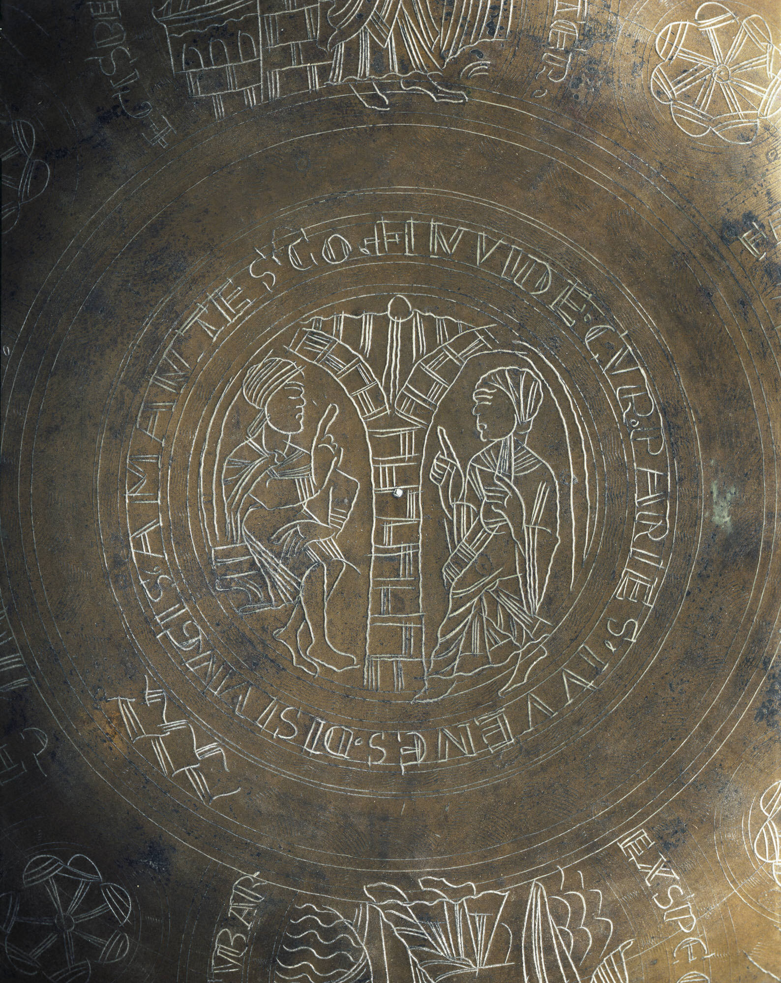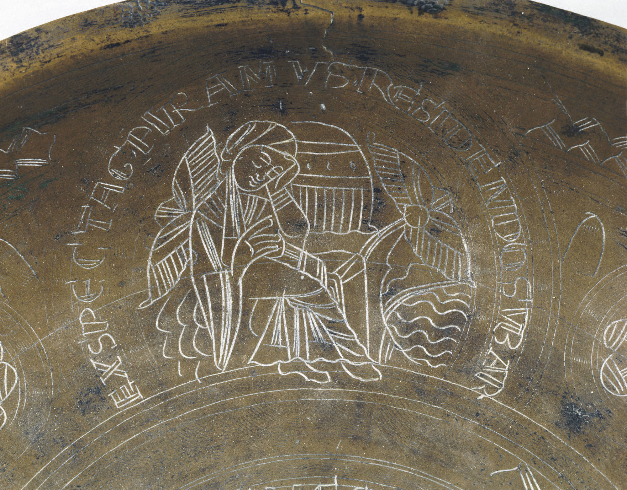 Тарелка с гравировкой для омовения рук Гравировка на тарелке детально Гравировка на средневековой бронзовой посуде Гравировка на средневековой бронзовой посуде Гравировка на средневековой бронзовой посуде Гравировка на средневековой бронзовой посуде Средневековая чаша для церемониального омовения рук
