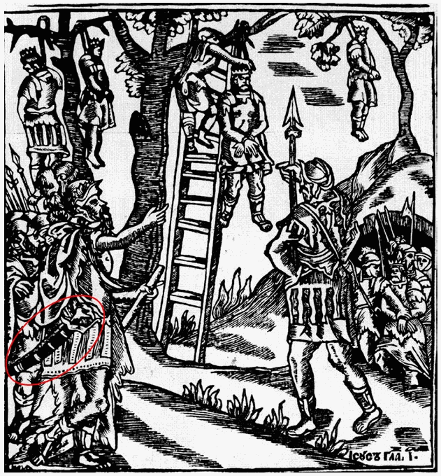 Высокая популярность сабель с L-образной гардой на всей территории Речи Посполитой, в том числе и в Украине, подтверждается не только вещественными, но и рядом иконографических источниками. Так, на гравюре известного киевского мастера Ильи «Иисус Навин вешает побежденных царей» (1640-е гг.) изображена сабля с полузакрытым эфесом (рис. 2).