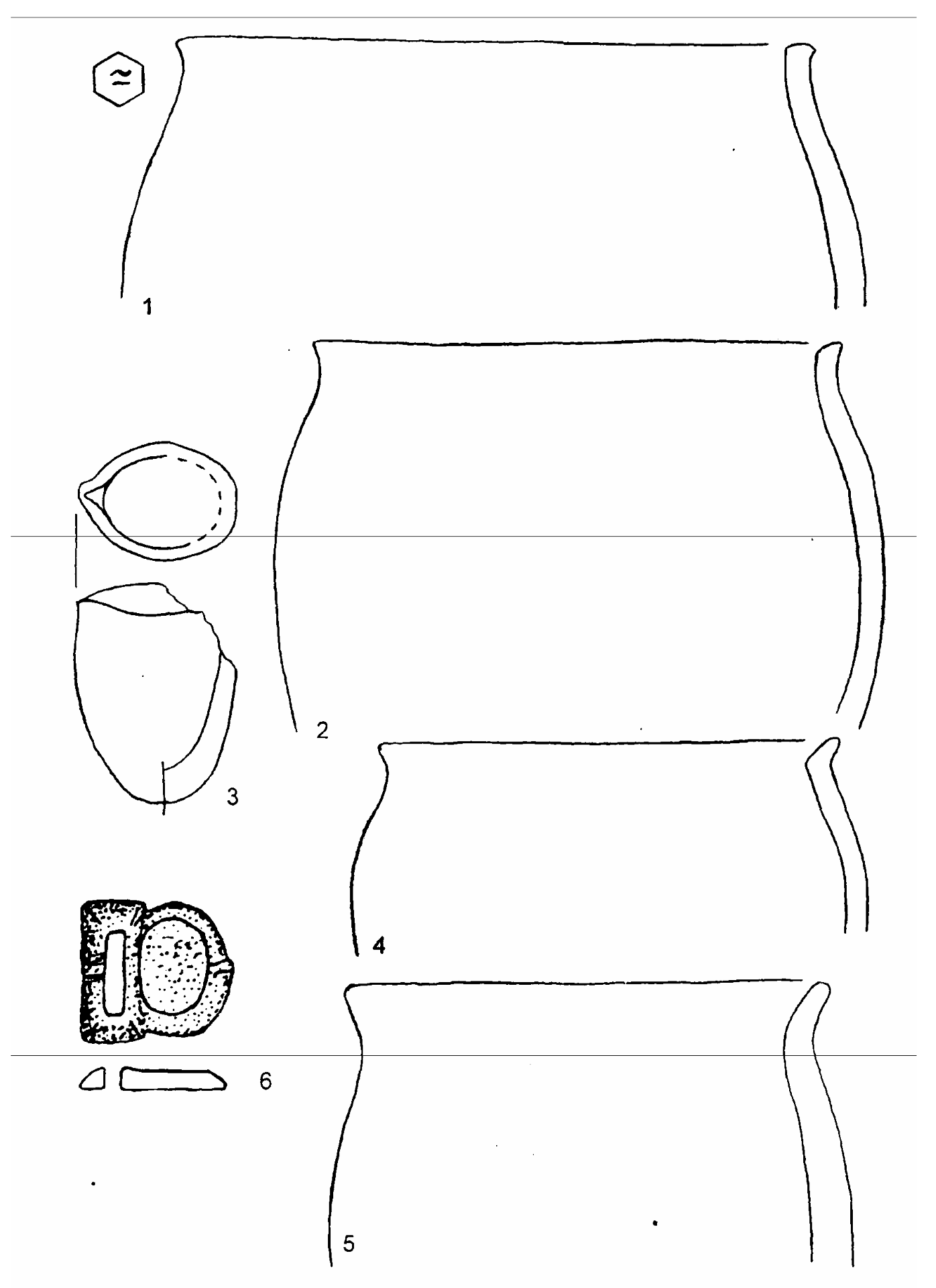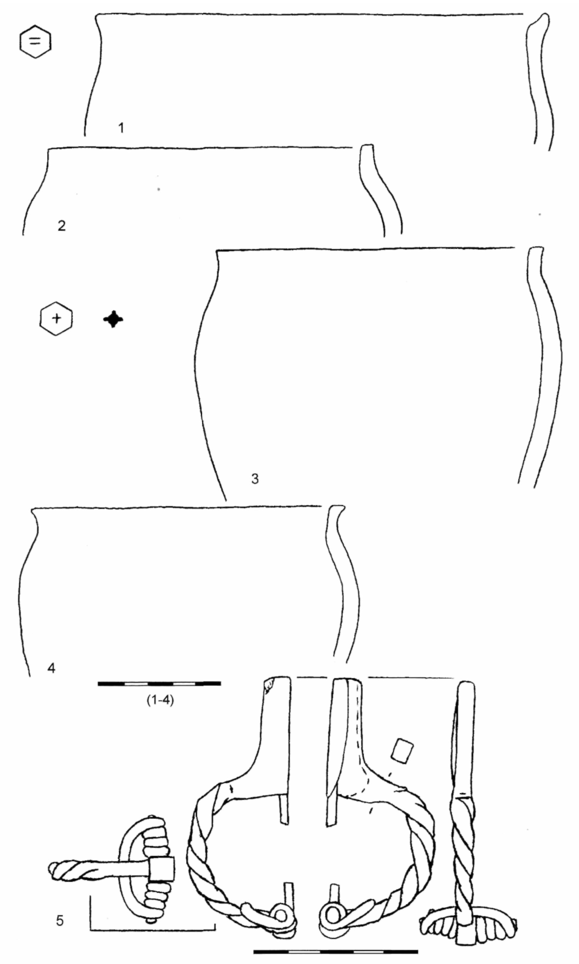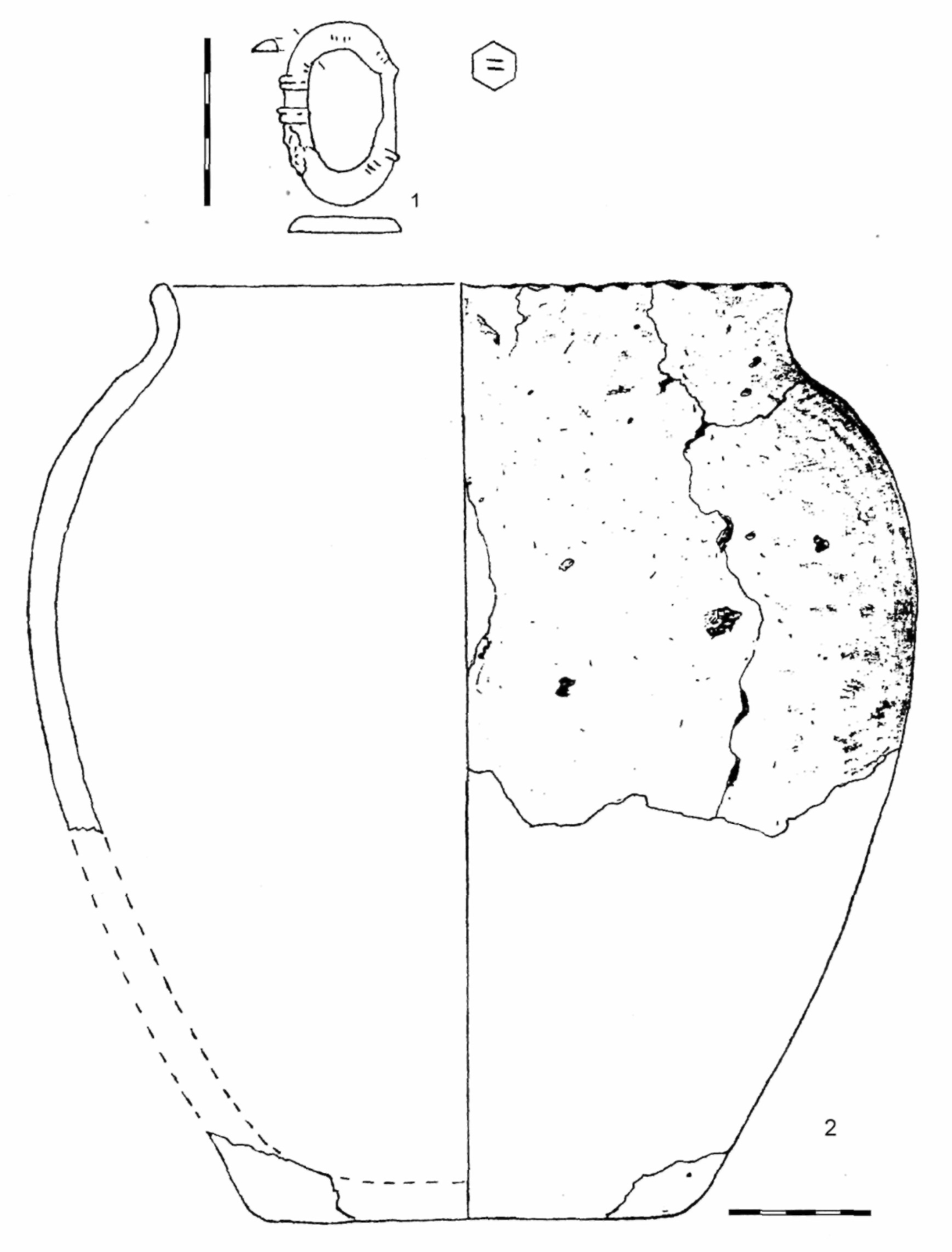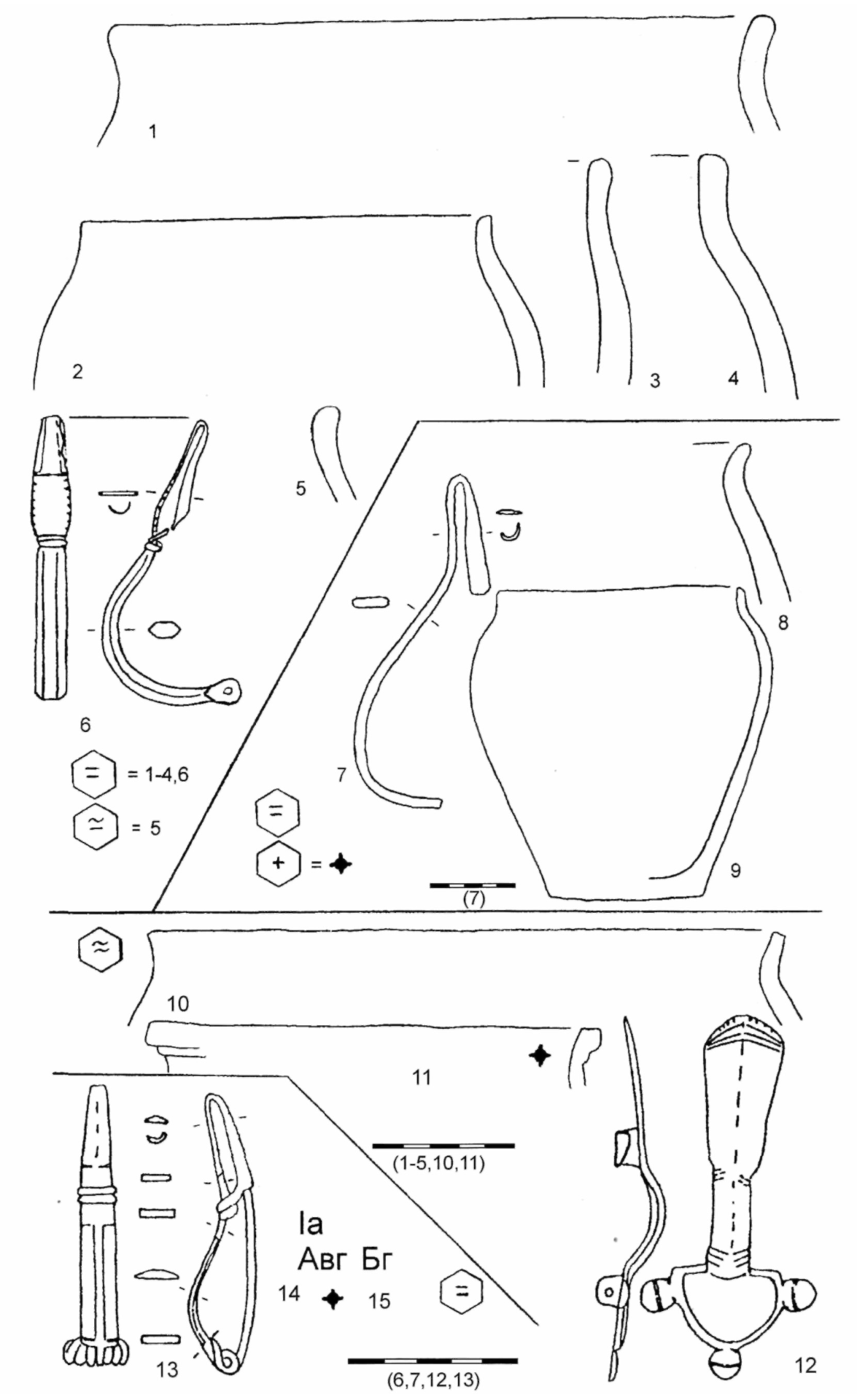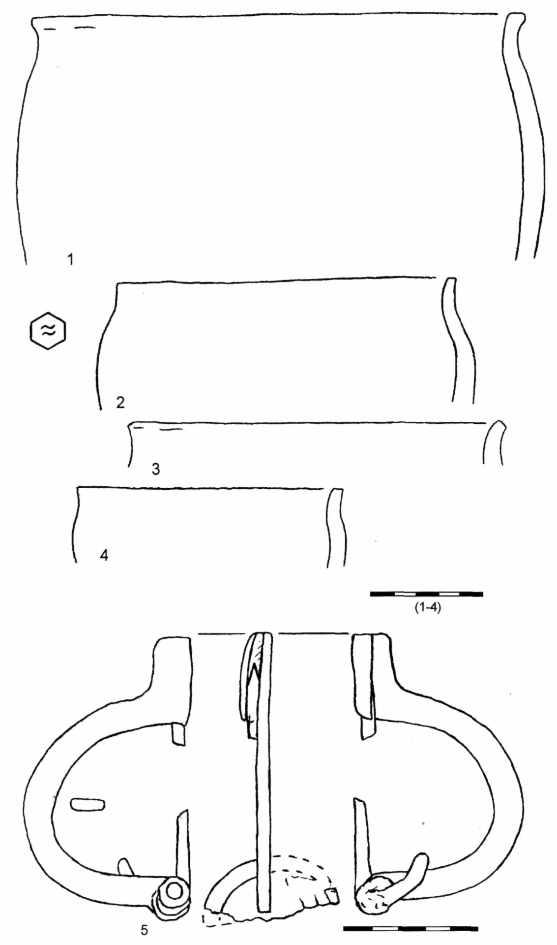 Железная фибула с тордированной дужкой из жилища 21 в Кодыне (рис. 3:5) отнесена М. Шульце-Доррламм к типу Прага, датированному около середины V в. или (по сводным таблицам) ок. 440-480 гг. (М. Schulze-Dörrlamm 1986, с. 600-605, 670, 672). Параллельно о таких фибулах (названных тип Пильвины) была написана моя работа, где было учтено меньше центральноевропейских комплексов, но более полно представлены восточноевропейские находки, и предложена схожая дата: середина -вторая половина V в. (И. О. Гавритухин 1989). Кроме особенностей выборки, расхождение в этих работах связано с оценкой происхождения и механизма распространения типа. Для целей данного исследования они не так уж важны. Материалы, ставшие доступными мне после написания той статьи, кроме не принципиальных в данном случае дополнений, не дают оснований для изменения изложенных тогда основных позиций.