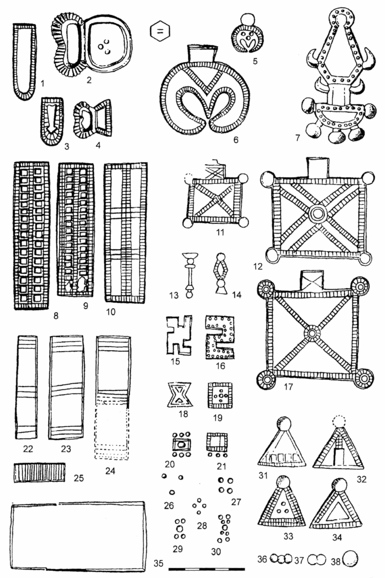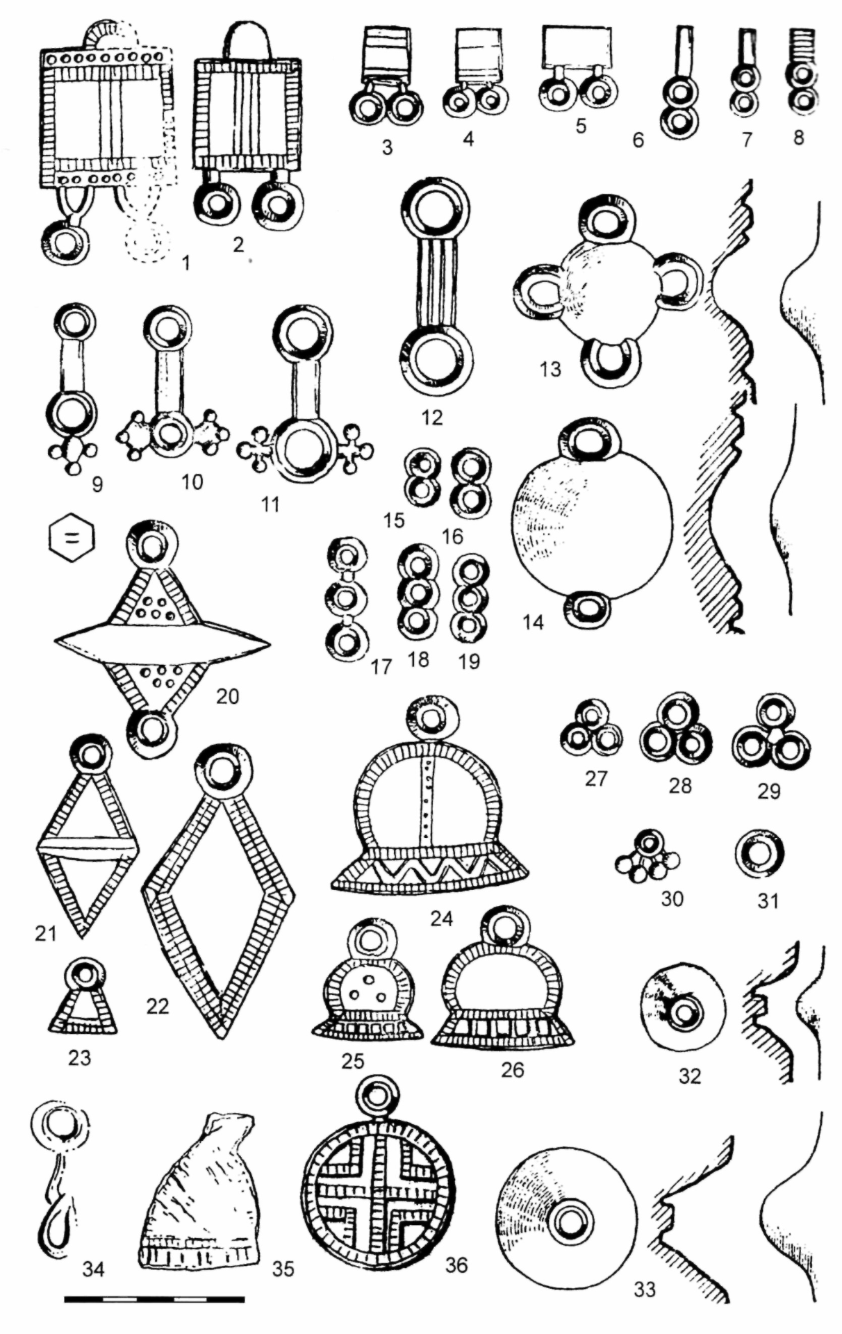 Литейные формочки из Бернашовки предназначались для изготовления вещей из свинцово-оловянистых сплавов, рассмотренных в недавнее время О. А. Щегловой (2001; печати). Значительная часть этих вещей, в том числе и представленные на ряде формочек из Бернашовки, бытовали длительное время на территории от Нижнего Дуная и Повисленья до Днепровского Левобережья, Верхней Волги, Приладожья и Причудья. Некоторые формочки из Бернашовки предназначены для изготовления вещей, пока более нигде не встреченных. Узкую дату для вещей, изготавливаемых с помощью формочек из Бернашовки, на современном уровне исследований можно предложить лишь для деталей ременной гарнитуры и фибулы. Хотя для фибулы (рис. 9:7) соответствий на уровне „узкого" варианта не известно, мной были приведены аргументы в пользу ее атрибуции по аналогиям (И. О. Гавритухин 19976, с. 47). Она относится к кругу изделий, связанных с рядом вариаций поствосточногерманских фибул конца VI-VII вв. дунайско-днестровской подгруппы, но напоминает и образцы, известные в крымских комплексах, датируемых около последних десятилетий VI - начала VII вв. Новых аргументов для оценки этой вещи, насколько мне известно, пока не появилось.