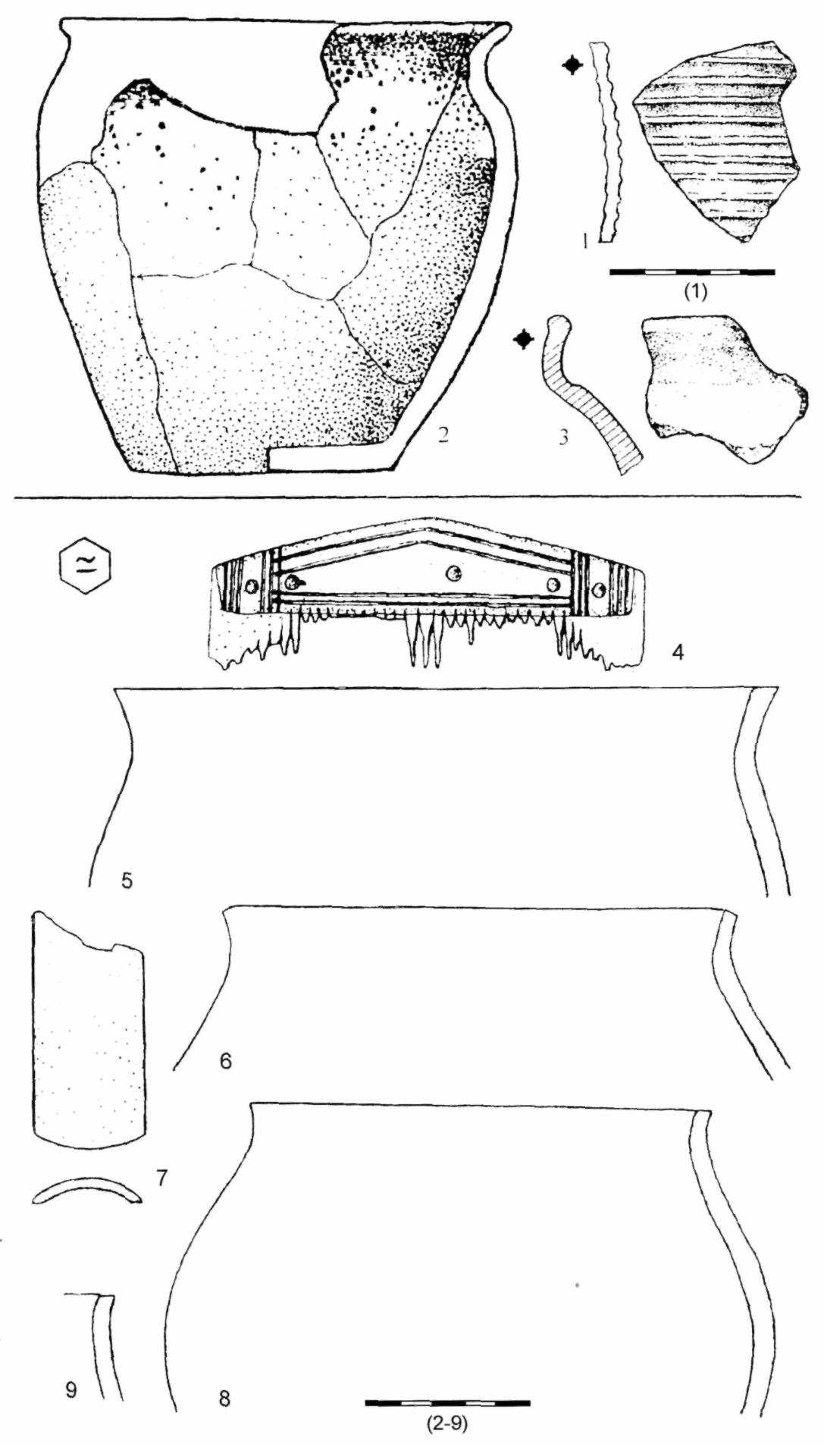 Оценка датирующего значения сочетания железных миски и кресала из сооружения 3 в Кодыне (рис. 5:5, 6) предложена И. П. Русановой и Б. А. Тимощуком. Форма миски связывается ими с традициями финала римского времени, продолжавшимися на протяжение, по крайней мере, V в., а кресало датировано в рамках V-VI вв. или уже – около конца V -первой половины VI вв. (И. П. Русанова, Б. А. Тимощук 19846, с. 22). Очевидно, сочетание этих датировок указывает на возможность определять хронологию комплекса в рамках 2-й половины V - 1-й половины VI вв.