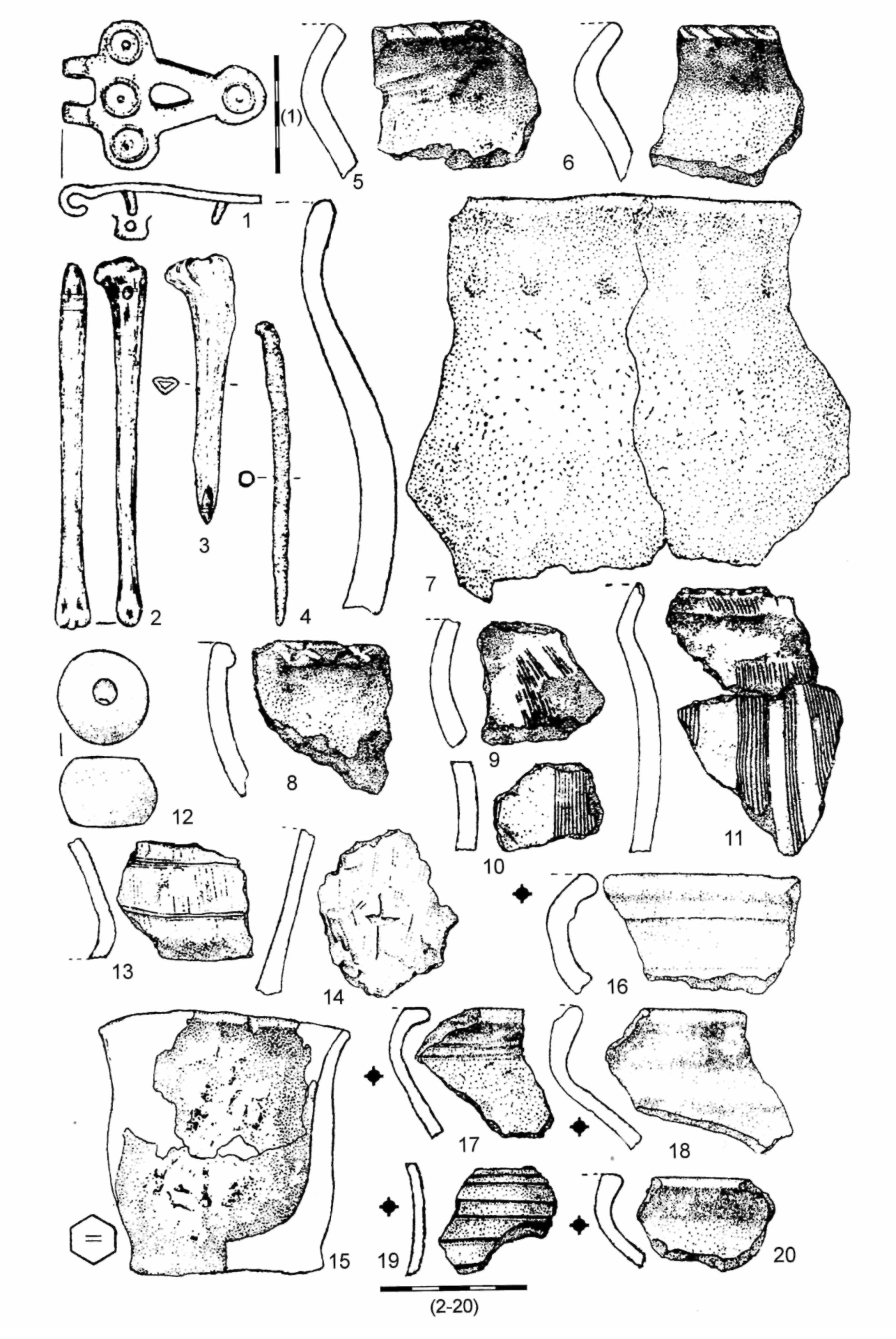 Наиболее ранние датирующие вещи, встреченные с керамикой пражского типа, относятся к финалу римского периода. А. А. Егорейченко (1991, с. 7071) выделен ряд вещей этого времени, найденных на поселении Остров. Некоторые из них, например бусы (рис. 1:5-12,15) имеют довольно широкую дату. Однако, поселение пражской культуры, судя по всему, существовало здесь не долго. Можно согласится с А. А. Егорейченко, что для его датировки более всего важна фибула (рис. 1:4). Подобные, двучленные прогнутые подвязные фибулы выделены А. К. Амброзом в вариант 3 серии I группы 16-2 и датированы в рамках 4 - начала 5 вв. (А. К. Амброз 1966, с. 64-66). Новые исследования не изменили эту дату принципиально, и лишь позволяют исключить из указанных рамок начало 4 в. (И. О. Гавритухин 19976, с. 42, там литература).