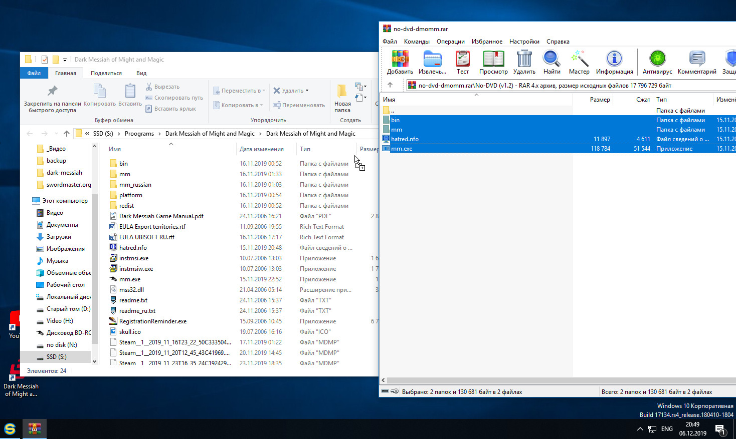 Если есть проблемы, то ещё существует для запуска этой игры без диска незащищенный EXE-файл из ДЕМО-версии (работает со всеми версиями игры) – dark-messiah/mm.rar (3.3 Mb). Однако его я не использовал, так как Dark Messiah of Might and Magic спокойно проходится после применения той отвязки.