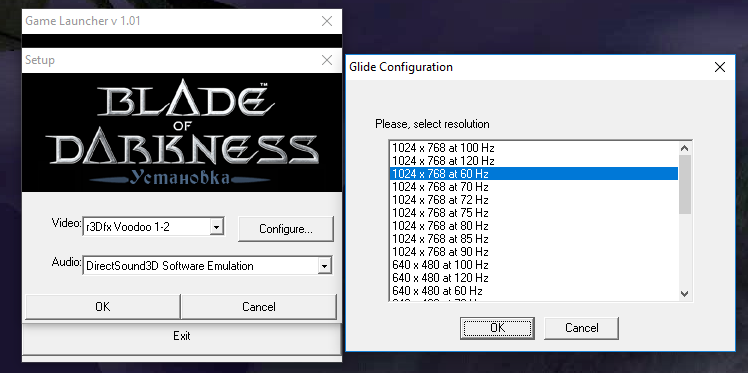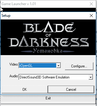 После установки игра должна запускаться через програму лончер, он установится вместе с игрой, его ярлык будет на Рабочем Столе и в меню Пуск. Лончер решает большинство вопросов с совместимостью и играть вполне можно с настройками по умолчанию, только разрешение поменять, однако кое что изменить не помешает. Запускаем ярлык Blade of Darkness в открывшемся окне нажимаем Setup. Видим окно с полями Video и Audio. В поле Audio можно поставить DirectSound3D Software Emulation, если увас в системе включено полное аппаратное ускорение, если не включено или вы не знаете этого, то ничего в поле Audio не меняйте.