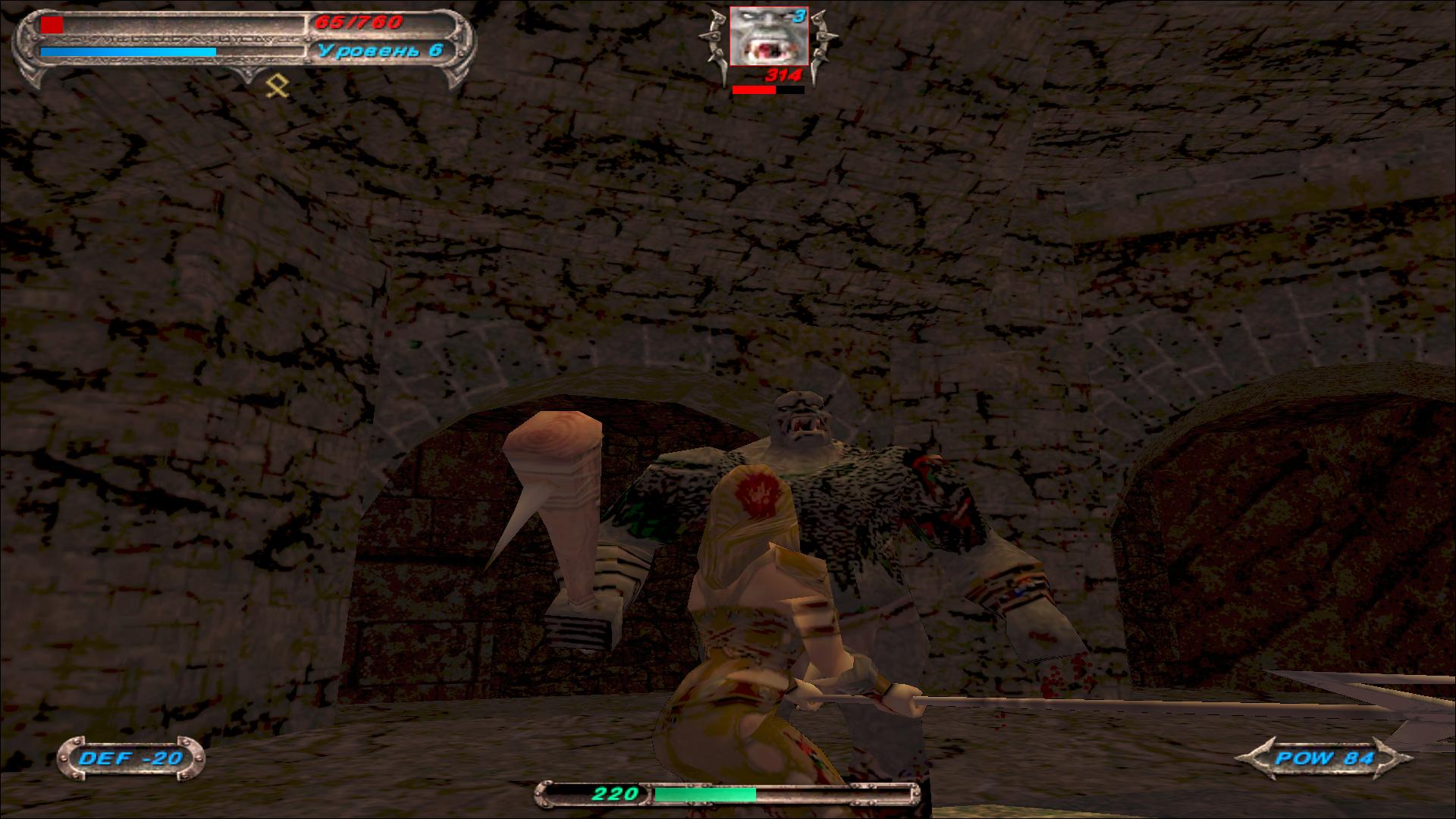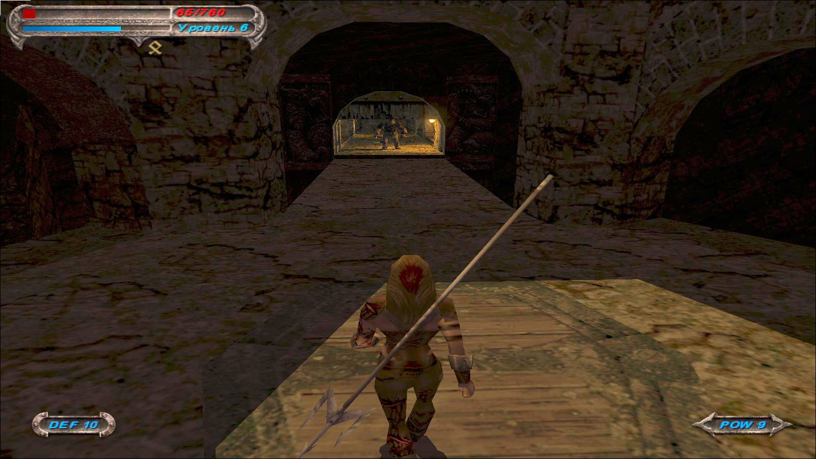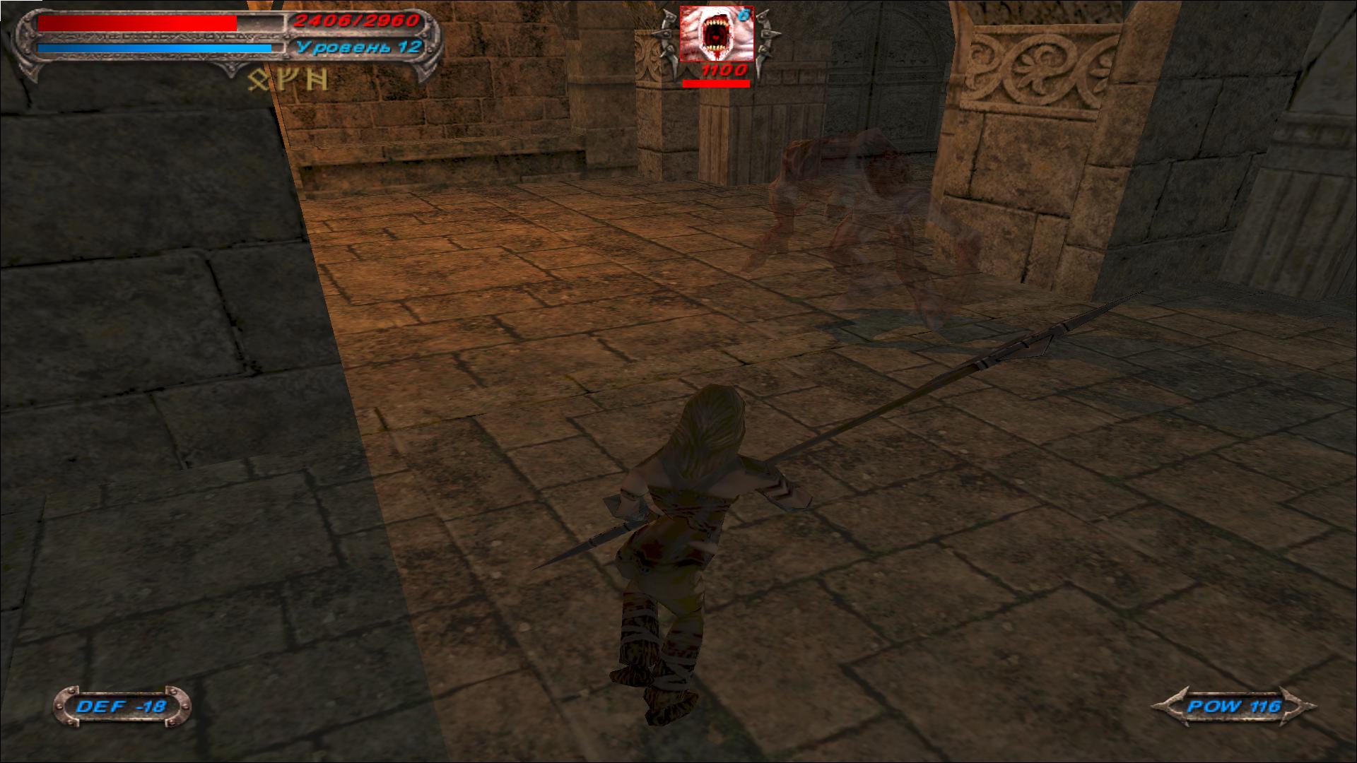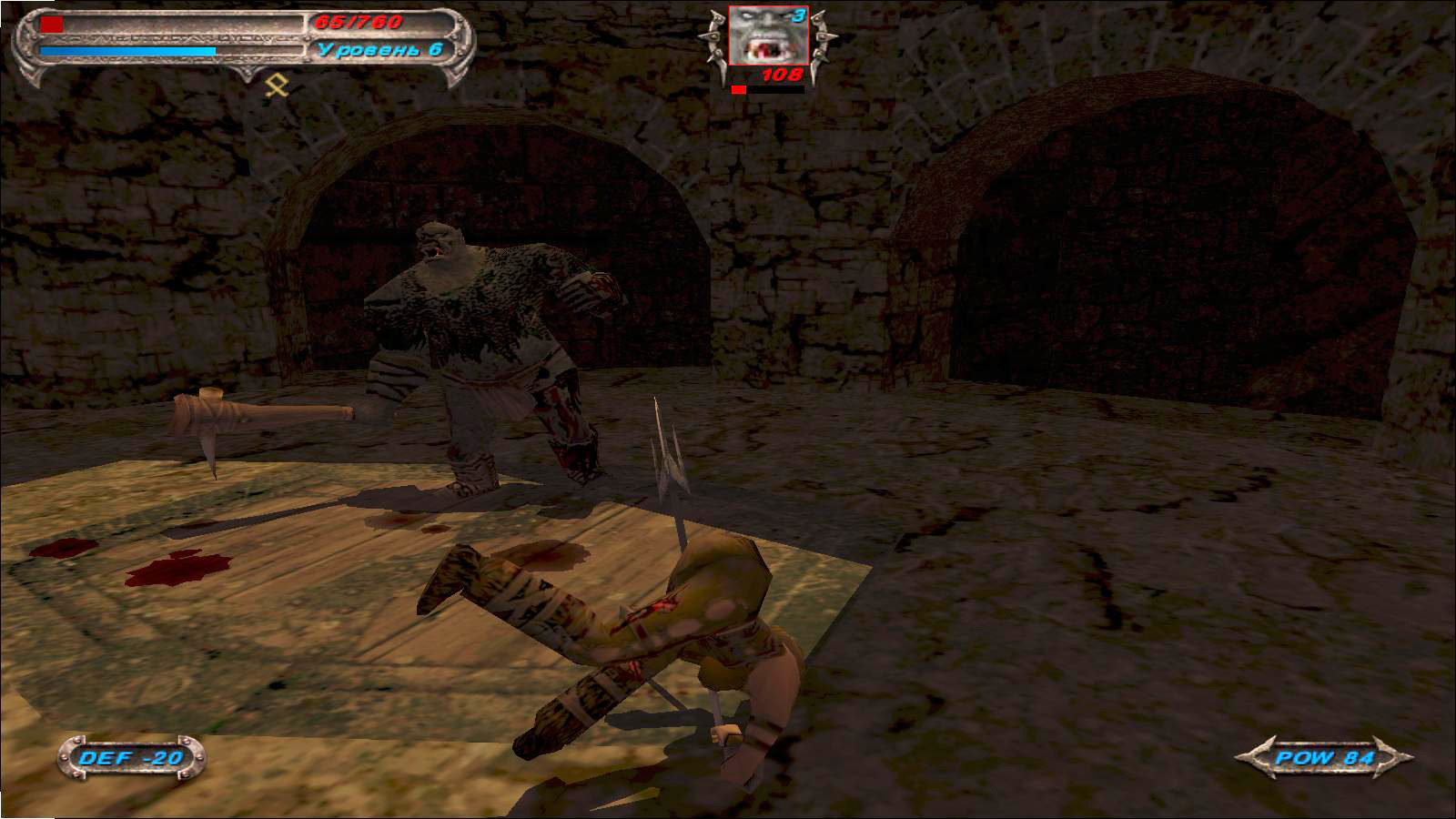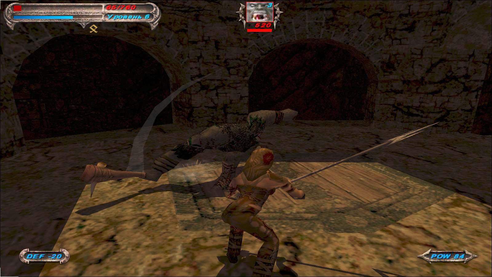 Проблема зависаний и вылетов из игры Blade of Darkness есть, она не очень так тоб критична, но есть место где играя за амазонку игра вылетает всегда. Есть два решения этой проблемы пройти это проблемное место задом: то есть открыли ключом дверь, развернулись и задом прошли в дверной проём до лесницы. Или, что проще – переключились на вид от первого лица, по умолчанию – дважды нажать клавишу +. Прошли – опять дважды нажать +. Кроме того на вкладках Оружие а также Особые есть список оружия, которые ваш герой может применять без проблем. В игре есть так же несколько экземляров оружия вообще не предназначеных для любым героем или противником, как например меч Затоичи, или секира Лезвие Света. Подобное оружие обладает повышеным уроном как для своих уровне, но имеют большие штрафы по энергии. Пользоваться ими можно только для того чтобы разнообразить геймплей. Смотрите видео как амазонка убивает мечом Затоичи босса первого уровня. Босс этот именуется Гуль – анг. Ghoul, на дальнейших уровнях они будут встречаться уже как рядовые бойцы: