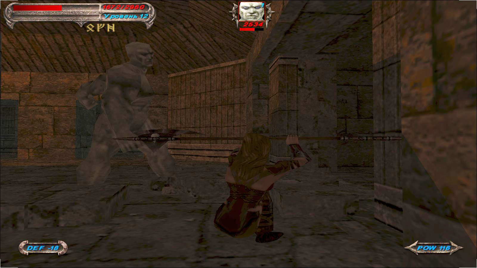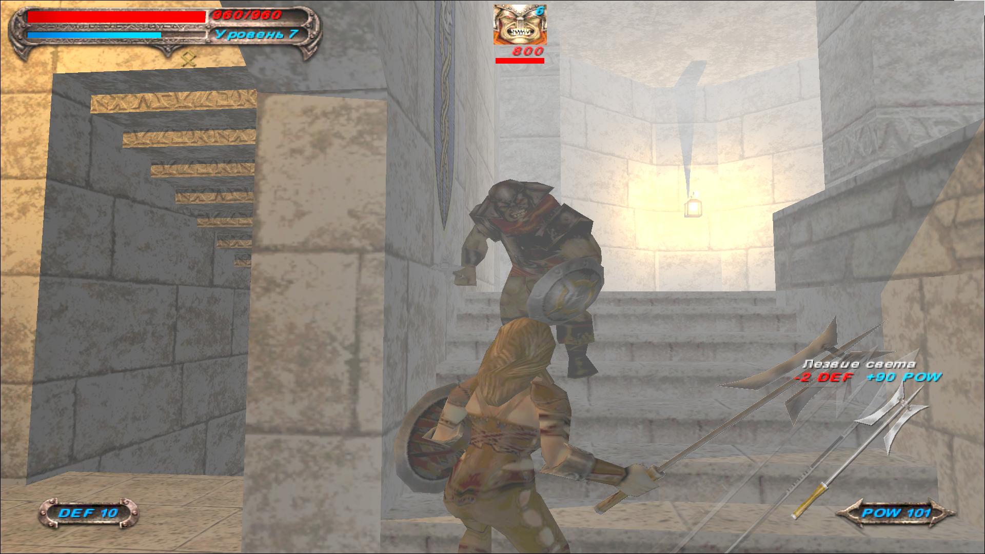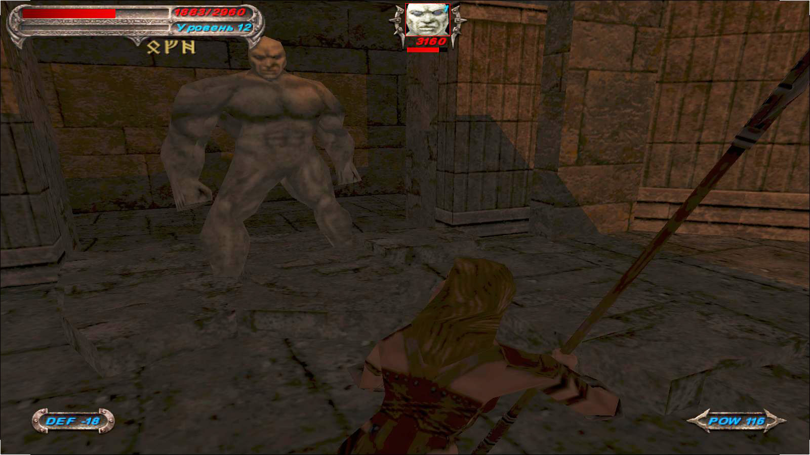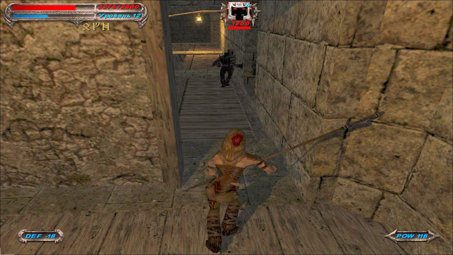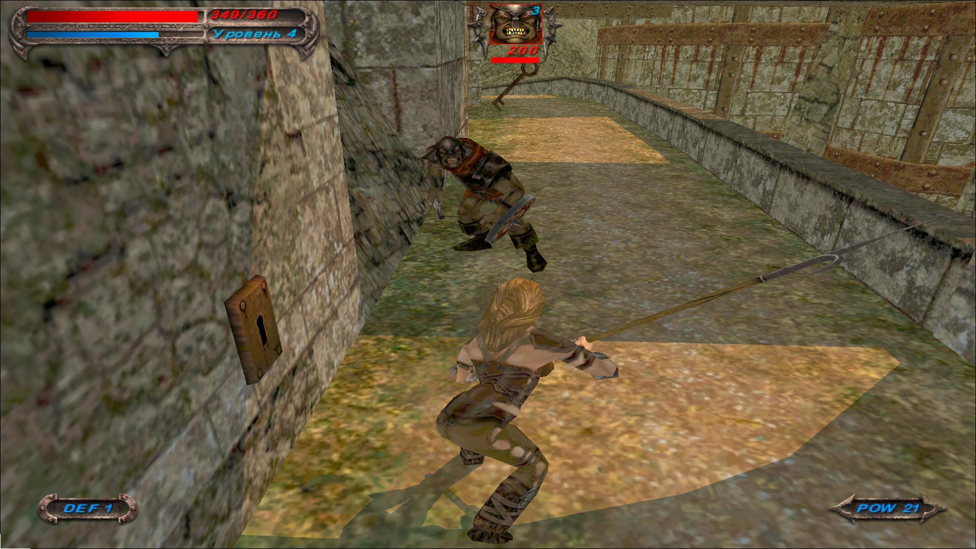 Проблема зависаний и вылетов из игры Blade of Darkness есть, она не очень так тоб критична, но есть место где играя за амазонку игра вылетает всегда. Есть два решения этой проблемы пройти это проблемное место задом: то есть открыли ключом дверь, развернулись и задом прошли в дверной проём до лесницы. Или, что проще – переключились на вид от первого лица, по умолчанию – дважды нажать клавишу +. Прошли – опять дважды нажать +. Кроме того на вкладках Оружие а также Особые есть список оружия, которые ваш герой может применять без проблем. В игре есть так же несколько экземляров оружия вообще не предназначеных для любым героем или противником, как например меч Затоичи, или секира Лезвие Света. Подобное оружие обладает повышеным уроном как для своих уровне, но имеют большие штрафы по энергии. Пользоваться ими можно только для того чтобы разнообразить геймплей. Смотрите видео как амазонка убивает мечом Затоичи босса первого уровня. Босс этот именуется Гуль – анг. Ghoul, на дальнейших уровнях они будут встречаться уже как рядовые бойцы: