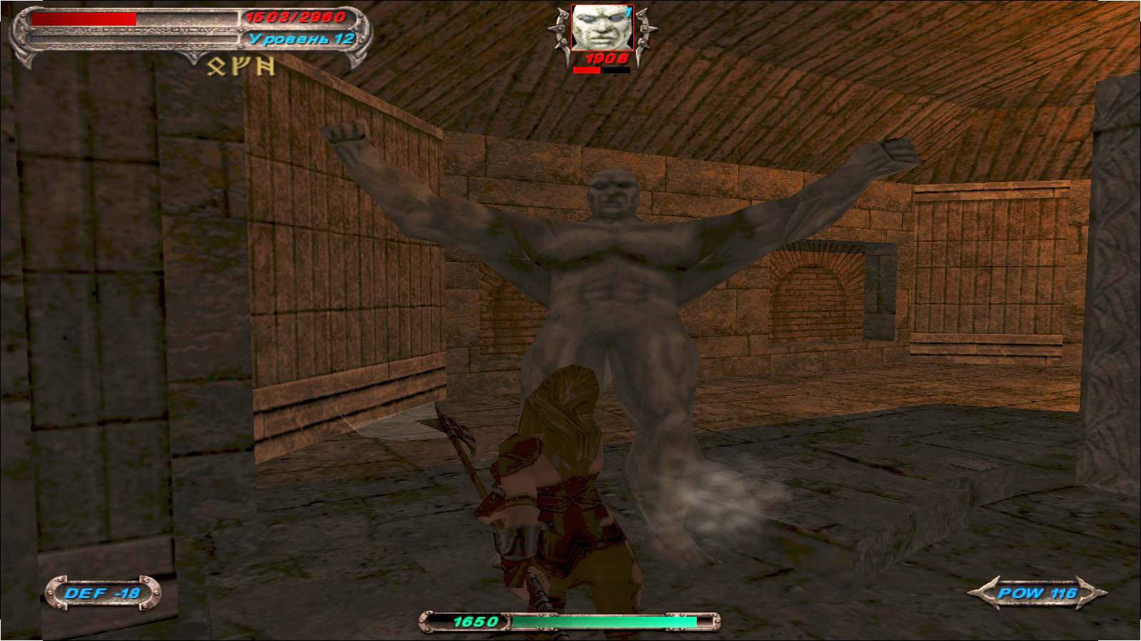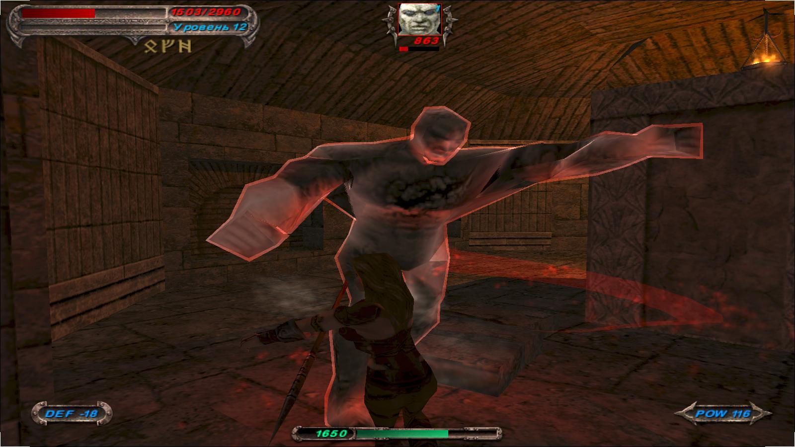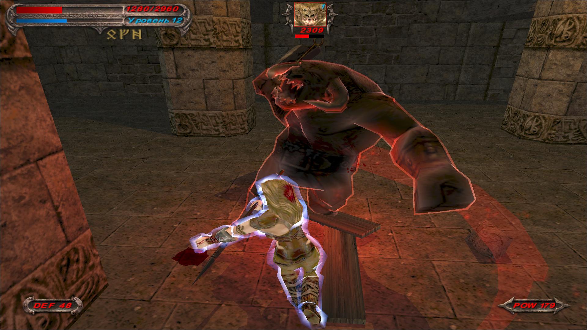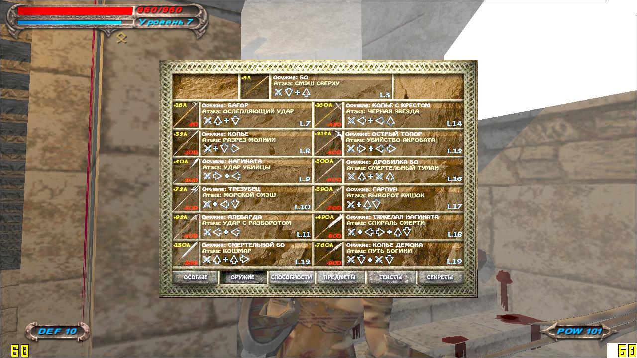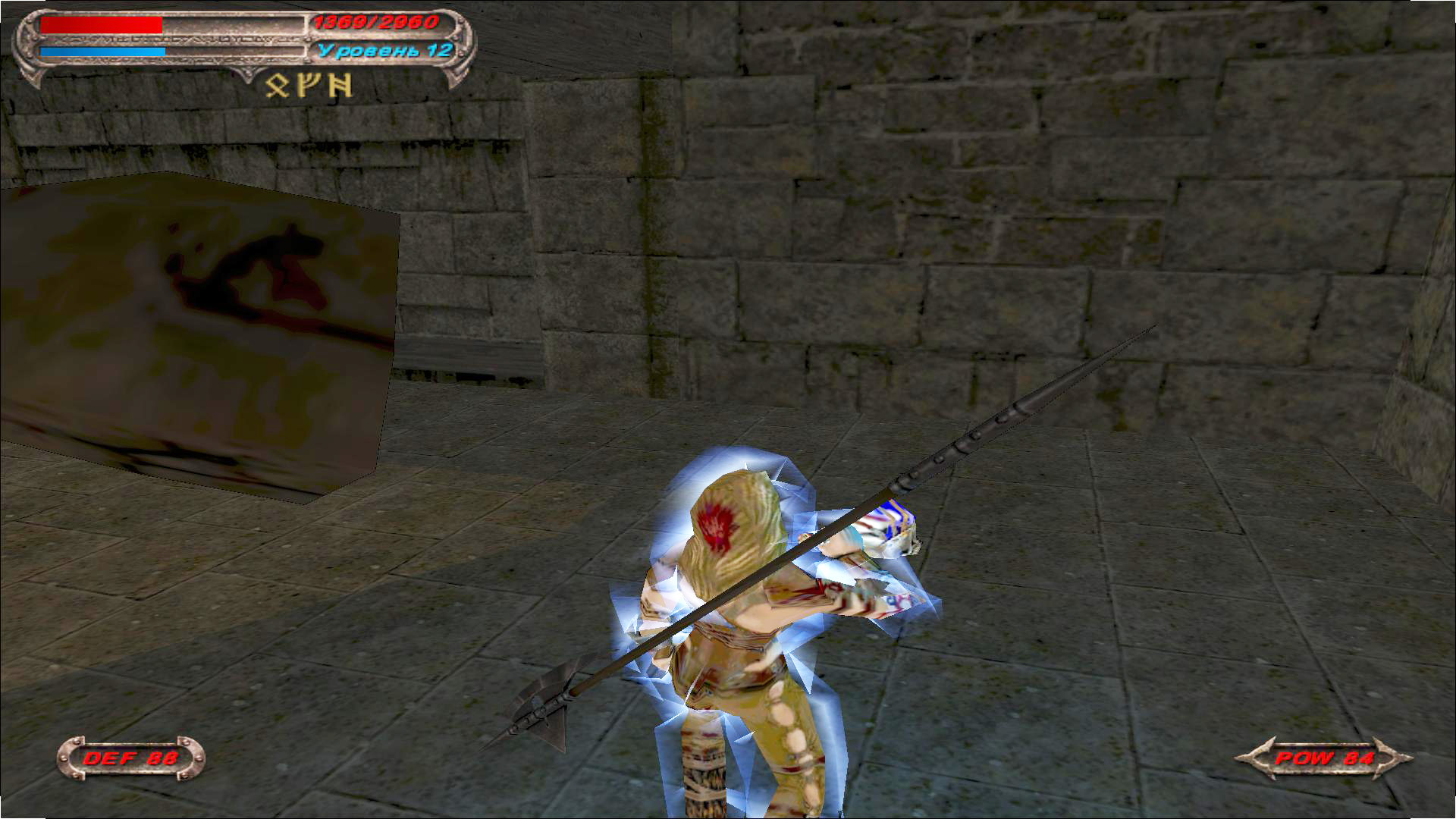 Проблема зависаний и вылетов из игры Blade of Darkness есть, она не очень так тоб критична, но есть место где играя за амазонку игра вылетает всегда. Есть два решения этой проблемы пройти это проблемное место задом: то есть открыли ключом дверь, развернулись и задом прошли в дверной проём до лесницы. Или, что проще – переключились на вид от первого лица, по умолчанию – дважды нажать клавишу +. Прошли – опять дважды нажать +. Кроме того на вкладках Оружие а также Особые есть список оружия, которые ваш герой может применять без проблем. В игре есть так же несколько экземляров оружия вообще не предназначеных для любым героем или противником, как например меч Затоичи, или секира Лезвие Света. Подобное оружие обладает повышеным уроном как для своих уровне, но имеют большие штрафы по энергии. Пользоваться ими можно только для того чтобы разнообразить геймплей. Смотрите видео как амазонка убивает мечом Затоичи босса первого уровня. Босс этот именуется Гуль – анг. Ghoul, на дальнейших уровнях они будут встречаться уже как рядовые бойцы: