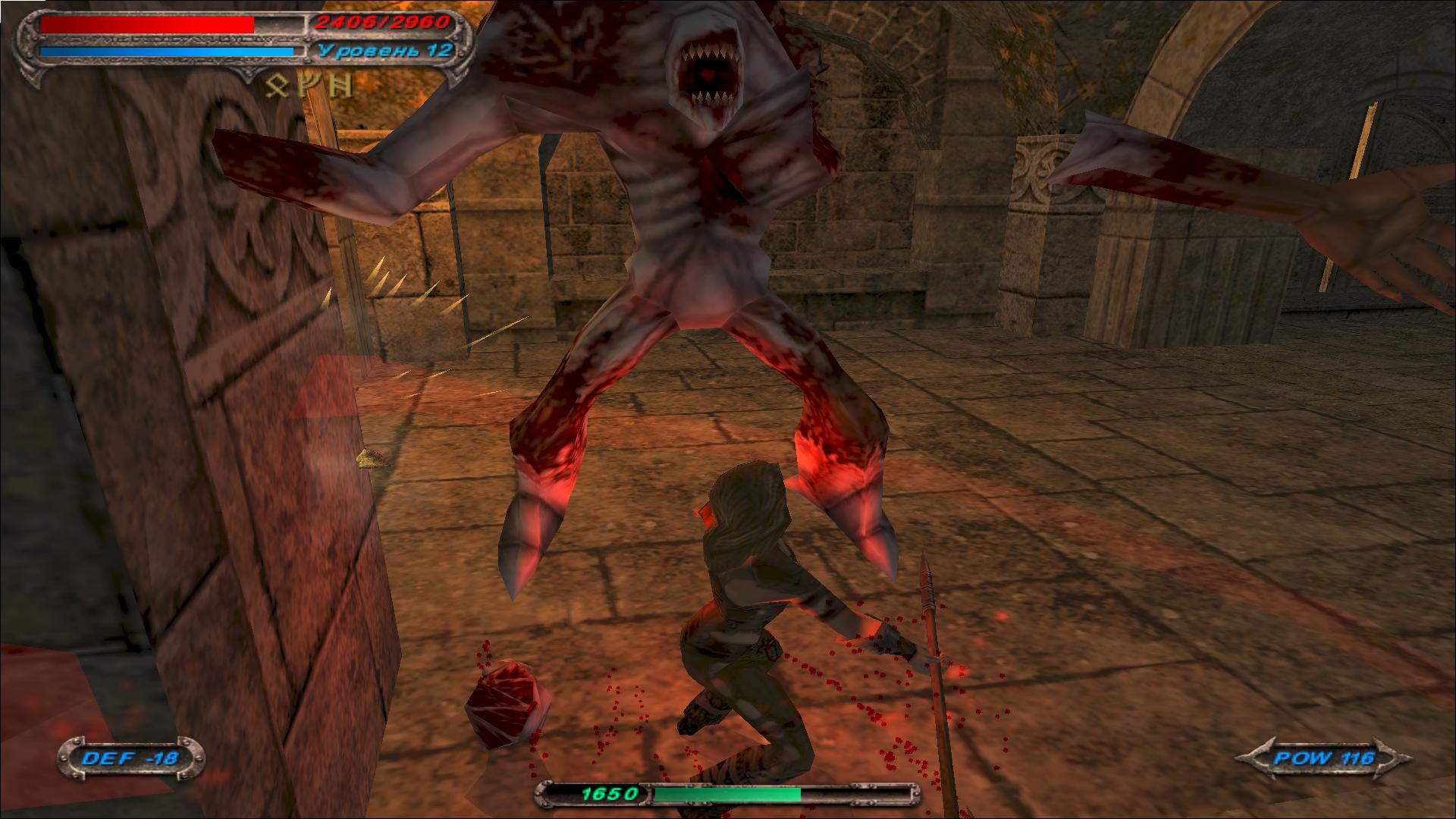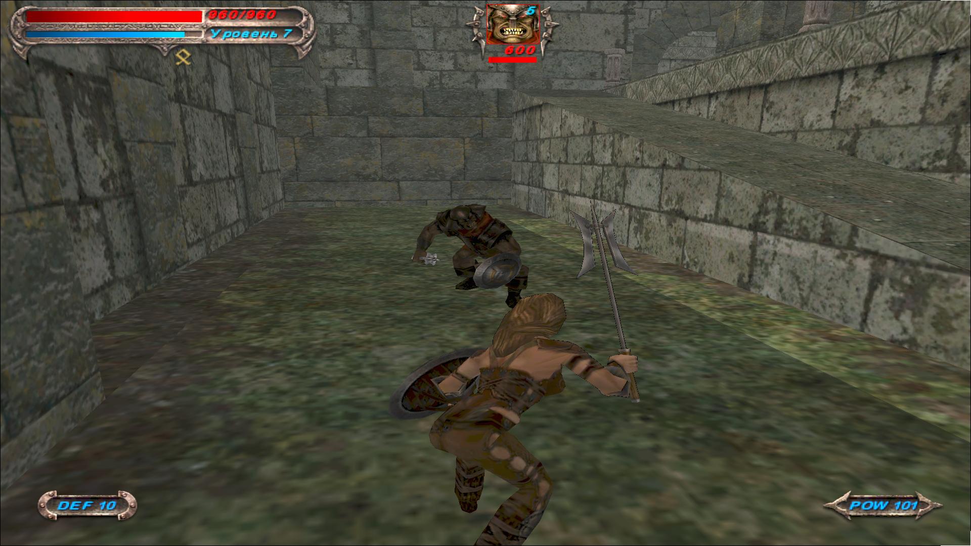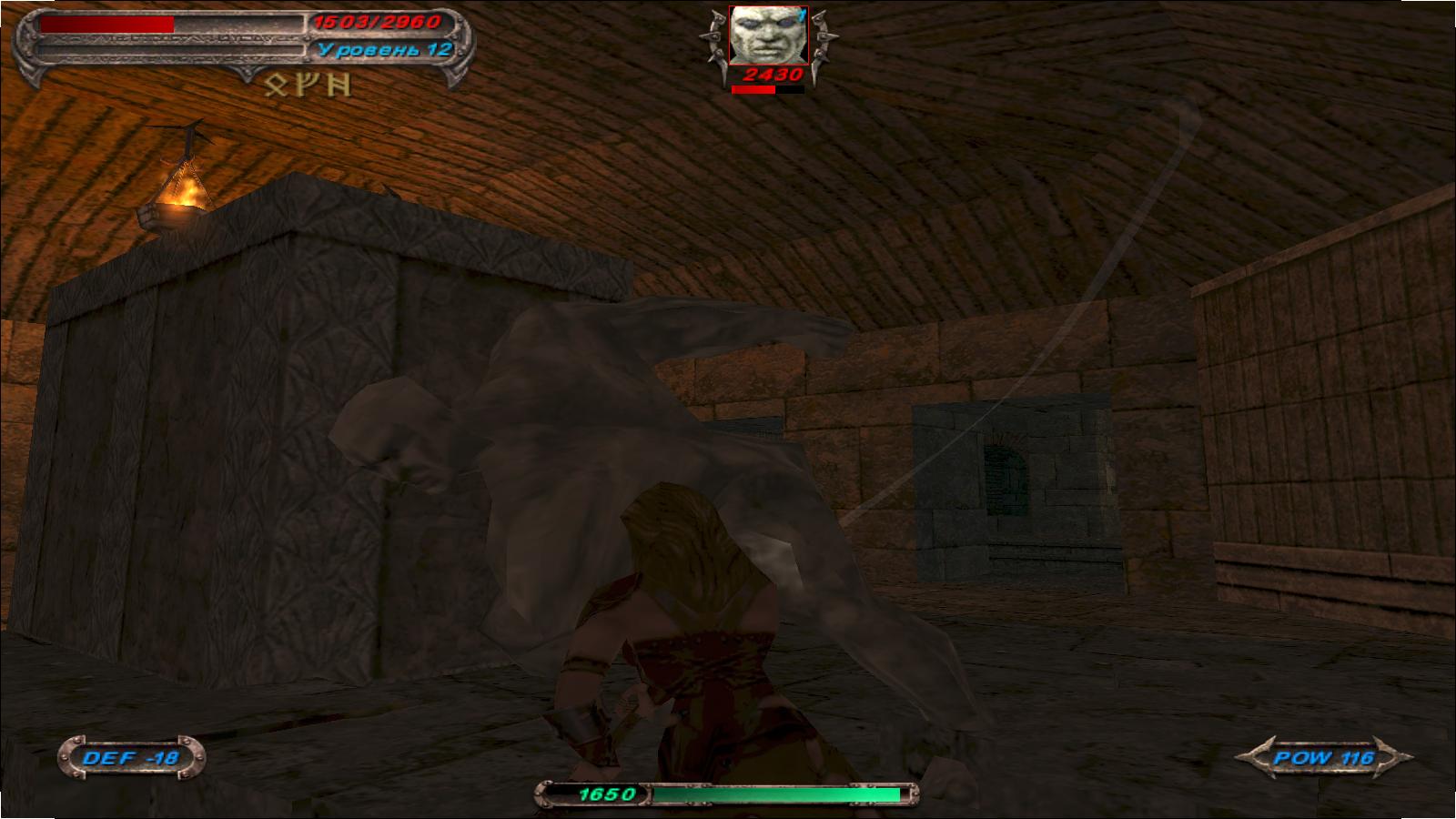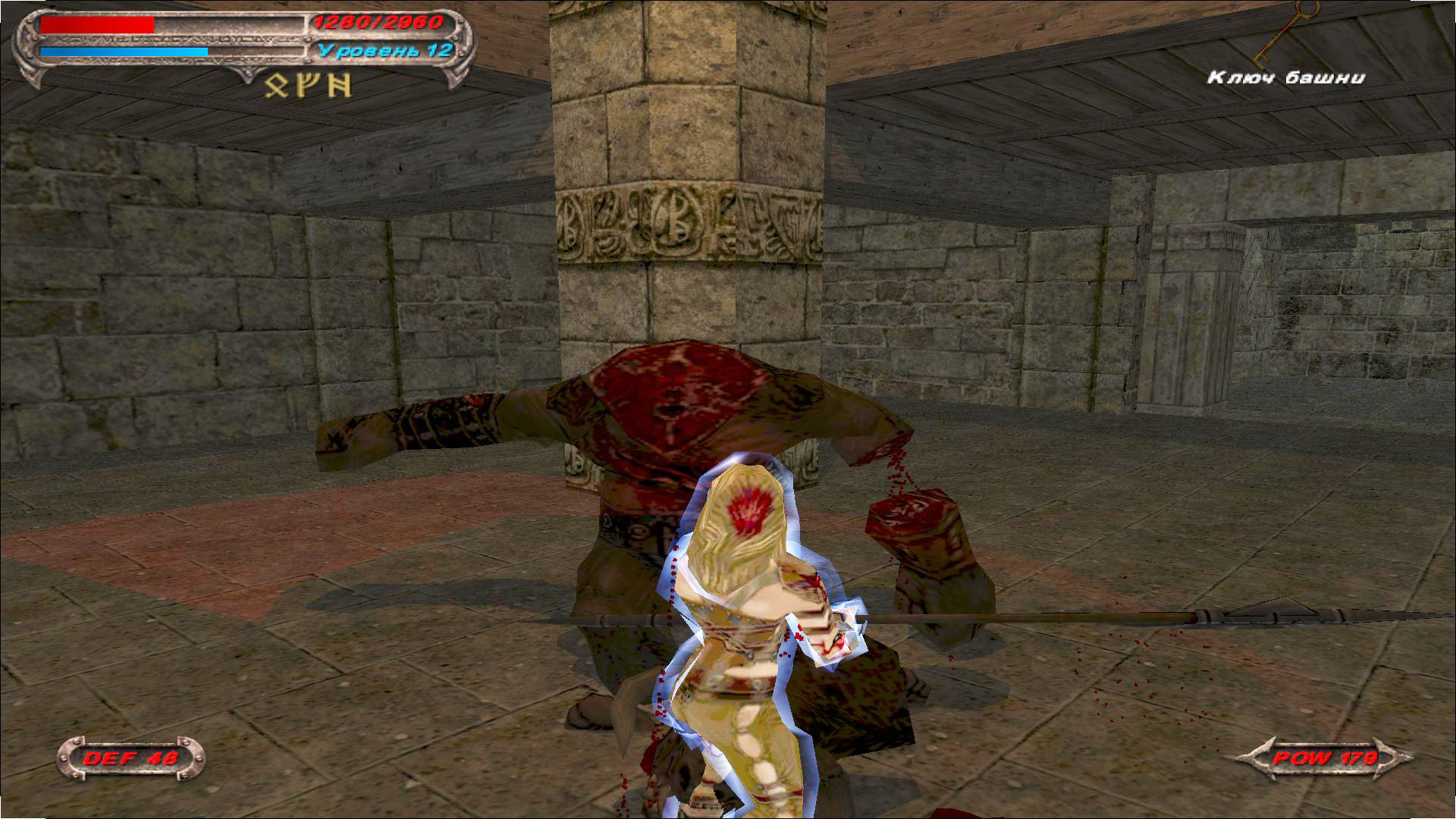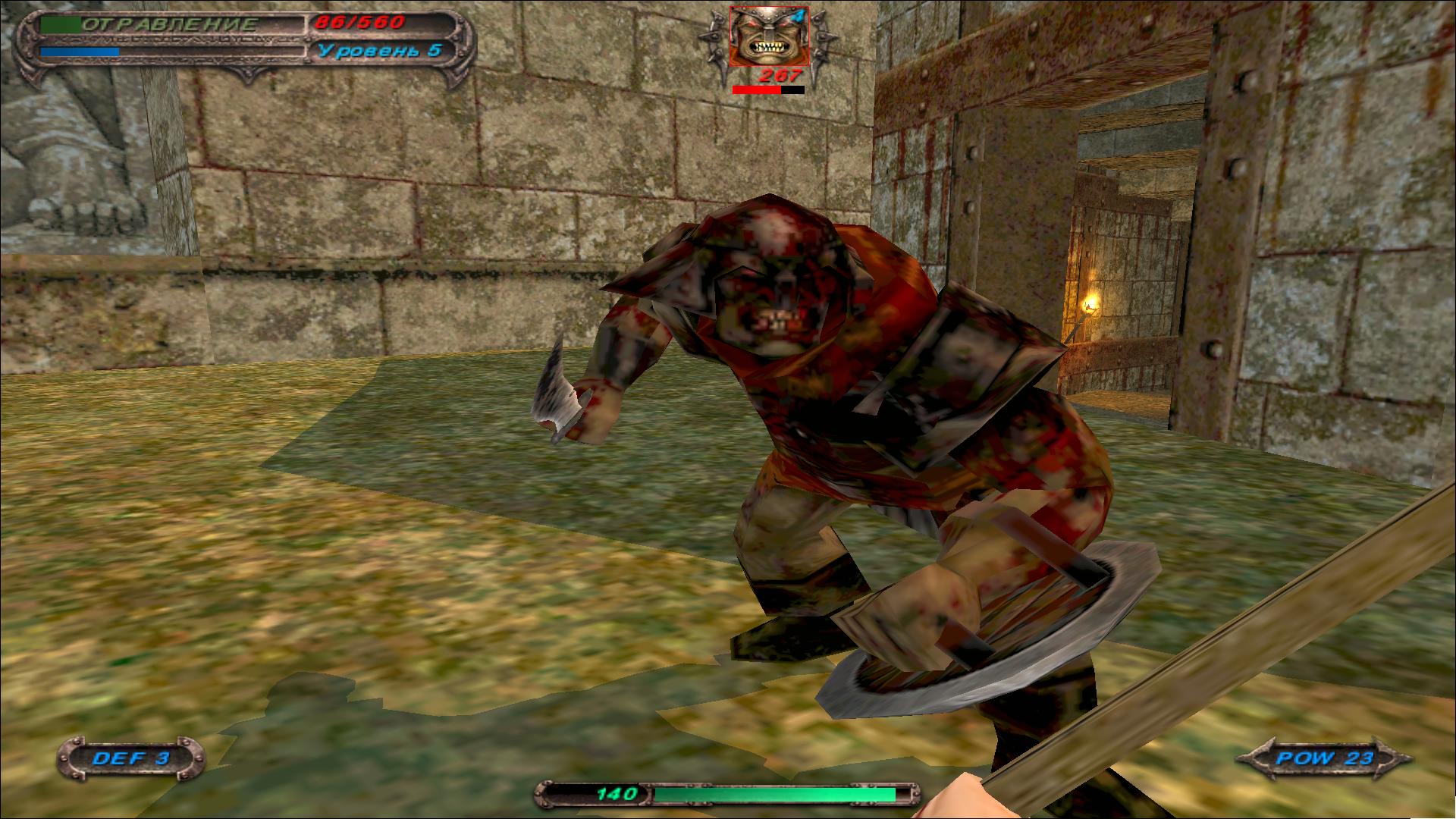 Проблема зависаний и вылетов из игры Blade of Darkness есть, она не очень так тоб критична, но есть место где играя за амазонку игра вылетает всегда. Есть два решения этой проблемы пройти это проблемное место задом: то есть открыли ключом дверь, развернулись и задом прошли в дверной проём до лесницы. Или, что проще – переключились на вид от первого лица, по умолчанию – дважды нажать клавишу +. Прошли – опять дважды нажать +. Кроме того на вкладках Оружие а также Особые есть список оружия, которые ваш герой может применять без проблем. В игре есть так же несколько экземляров оружия вообще не предназначеных для любым героем или противником, как например меч Затоичи, или секира Лезвие Света. Подобное оружие обладает повышеным уроном как для своих уровне, но имеют большие штрафы по энергии. Пользоваться ими можно только для того чтобы разнообразить геймплей. Смотрите видео как амазонка убивает мечом Затоичи босса первого уровня. Босс этот именуется Гуль – анг. Ghoul, на дальнейших уровнях они будут встречаться уже как рядовые бойцы: