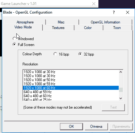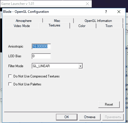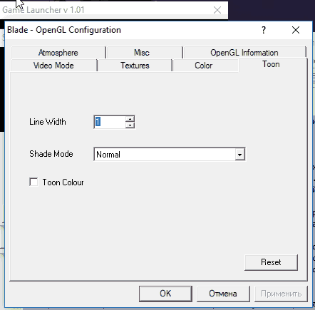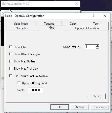 А вот в Video будем настраивать rOpenGL для Severance: Blade of Darkness, жмем Configue. На вкладке Video Mode выбираем разрешение игры, хорошим выбором будет разрешение, совпадающее с разрешением вашего Рабочего Стола Windows. На вкладке Textures нас интересует поле Anisotropic, в него мы вписывем значение 16 – это сделает картинку игры мягкой. На кладке Color настройте как вам нравится, игра бывает довольно-таки темная, поэтому добавить в Brightness 5 пунктов не помешает. На вкладке Toon нас интересует поле Line Width, оно отвечет за контуры вокруг юнитов, я поствил значение 1, чтоб был не большой контур. Если вы испытываете проблемы с локациами где туман или просто хотите чтоб противники были четче помечены ставьте 2, 3 или сколько вам надо. Вкладка Misc нам интересна пунктом Swap Interval, в него мы впишем значение 1, при таком значении частота обновления картинки в игре не будет превышать частоту обновления картинки на мониторе. Это обеспечит вертикальную синхронизацию кадра – он не будет разваливаться. Так же на вкладке Misc убираем галочку с пункта Use Texture Font For System и в поле Scale пишем 0.