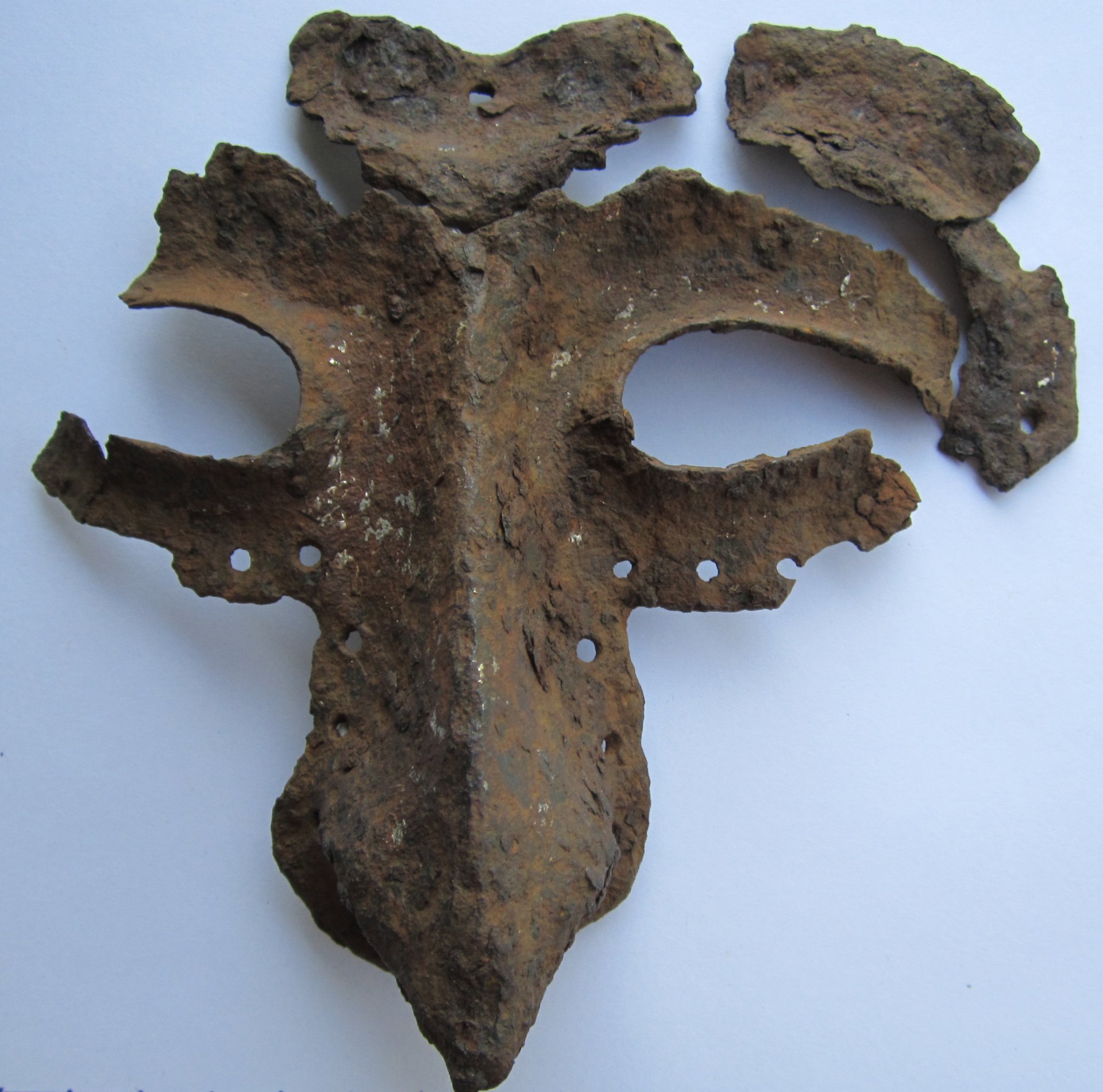 Фрагменты полумаски и обломки тульи шлема, найденные при раскопках на городище Свислочь, также трудно привязать к какому-либо одному событию со стопроцентной точностью. Ясно одно — находка сделана в горелом слое и связана с последствиями боя, так как к внутренней стороне полумаски «припекся» фрагмент кальцинированной кости – все, что осталось от сгоревшего хозяина шлема98. Эти боевые действия вполне могли носить и междоусобный характер, но авторы раскопок связывают находки со штурмом монголами крепости во время карательного похода Бурундая в 1258 г., так как среди обнаруженного оружия имеется и навершие древка значка «бунчука»99.