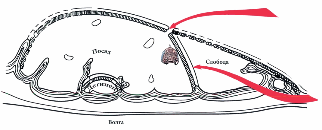 Шлем, найденный в Городце, — это свидетельство боевого прошлого древнего волжского города. Крупный по тем временам торгово-промышленный город был в XIII в. столицей Городецкого княжества, а затем вошел в состав НижегородскоСуздальского княжества. Дважды Городец был полностью разрушен (в 1238 и 1408 г.). Роковым в истории средневекового Городца стал 1408 г., когда после опустошения войсками Едигея город пришел в запустение более чем на три столетия. Согласно народному преданию, именно неподалеку от места находки шлема враги прорвали оборону города. Еще И.А. Кирьянов предположил, что народная легенда, рассказывающая о прорыве линии городских укреплений в районе современной ул. Загородной, путает осаду 1238 г. с событиями 1408 г.124 В подтверждение этой догадки приводились данные археологических разведывательных работ, в ходе которых был произведен обмер городецких валов и рвов. Было установлено, что на отрезке вала (отгораживающего слободу от посада), с внутренней стороны которого и был обнаружен шлем, на протяжении 540 м вал и ров имеют меньшие размеры, чем на других участках. Остроконечная форма вершины вала в этом месте и отсутствие на ней широкой площадки для городни позволяют утверждать, что в качестве крепостной стены здесь использовался обычный частокол; тем более что его обуглившиеся остатки были найдены при обследовании 1955 г. у выхода вала к Волге125. Скорее всего, на данном участке отсутствовали и башни, либо они имели малые размеры, так как линия вала на их предполагаемых местах прерывается незначительно. Соседние же участки вала резко отличаются и размерами и устройством, где стены и башни были очень мощными. Строительство более мощных стен, чем первоначальные, отмечено в русских летописях под 1391 г.126 Таким образом, использование противником для штурма стыкового участка с более мощными укреплениями и участка частокольной стены позволяет говорить об осаде 1408 г., и, надо полагать, в этом случае предание указывает место прорыва достаточно точно. Именно здесь легче всего было штурмовать укрепления. Проездная башня, на месте расширенного в середине XX в. въезда в город со стороны Нижней Слободы и деревни Обросихи, где теперь пролегает асфальтированная дорога на ул. Маслова, видимо, также была небольшого размера. Предположительно именно через нее нападавшие прорвались на территорию посада (рис. 52). О направлении удара противника свидетельствуют и народные предания. Согласно легенде, немногочисленные защитники города приняли смертный бой возле современной деревни Черепово; от найденных здесь человеческих черепов деревня и получила свое название127. Однако народные предания не очень надежный носитель исторической памяти, да и археологических изысканий в окрестностях деревни Черепово не проводилось. К тому же если после нашествия Едигея городецкая округа была опустошена и начала заселяться и осваиваться лишь полтора века спустя, то кто же мог быть носителем памяти о трагичных событиях? Поэтому остается только гадать, откуда происходят найденные костные останки — из массового захоронения или же с территории какого-то могильника. Проникнуть в слободу враги могли тем путем, о котором говорит легенда, — по оврагу, поднимающемуся от кромки волжского берега вдоль горы Шихан. Именно с этой горой народное сказание связывает размещение 