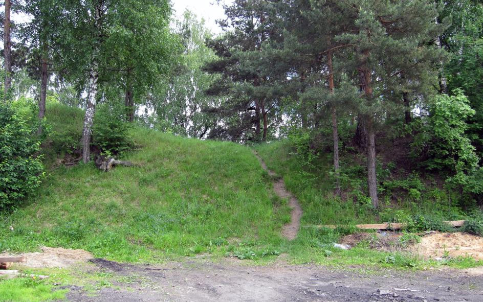 | Рис. 52. Вал на предполагаемом месте прорыва штурмующих (фото А.Е. Негина) | Рис. 53. Древний вал на месте находки шлема |