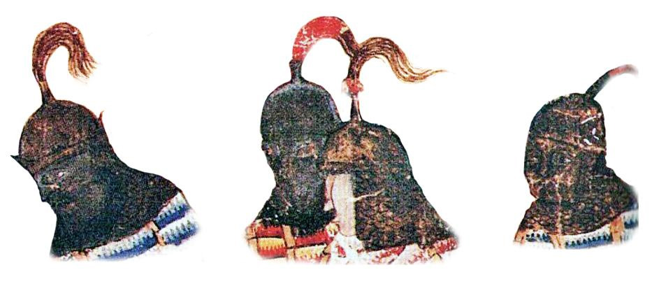 Несомненно, не следует упрощать вопрос, приписывая шлемы рассматриваемого типа к русской или монгольской оружейной традиции, так как они несут на себе отпечаток сразу нескольких традиций. Горбатый скульптурно выполненный нос видоизменялся — от довольно реалистичного до упрощенного и неуклюже изготовленного — в зависимости от места изготовления шлема, что прекрасно демонстрирует шлем из погребения № 1 Келийского могильника114, являющийся подражанием или локальным вариантом этой серии шлемов.