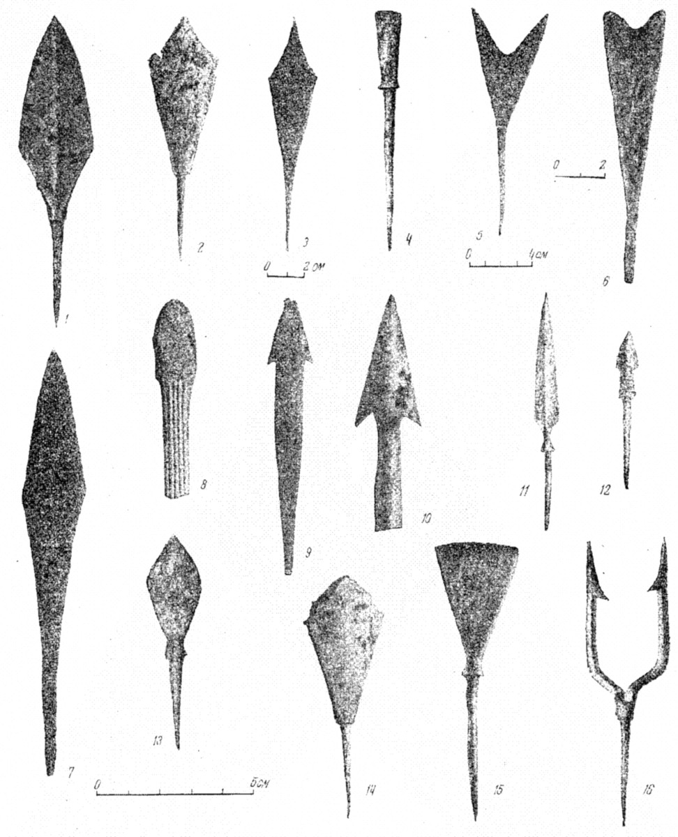 Широкое распространение такие наконечники имели в Норвегии102 и Швеции102. Иногда без достаточного основания высказывается мнение, что ланцетовидные наконечники были занесены на Русь из Скандинавии варягами. Несомненно, что взаимопроникновение отдельных предметов было, но в Восточной Европе такие стрелы – только меньших размеров – употреблялись еще в I тысячелетии н. э.. задолго до появления варягов па исторической арене. Об этом свидетельствуют находки их на Гляденовском костище первых веков нашей эры в Прикамье104; на Мощинском городище Калужской области в слое VI-VIII вв.105 и на других.