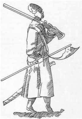 2. Снять с плеча бердыш, когда в одной руке находится готовый к выстрелу мушкет а в другой зажатый между пальцами тлеющий фитиль, неудобно и довольно трудно.