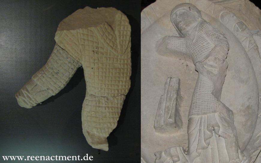 В скульптуре на рис. F левого рыцаря четко видно, что рукава обычной одежды, которые берутся в складки, которые видны из под брони.  Квадратами могли изображать стеганые доспехи или кольчугу. Но на рисунке I7 показываю двух рыцарей, у одного открытый клапан-предличник который однозначно является кольчугой, а у другого закрытый предличник изображен квадратами.