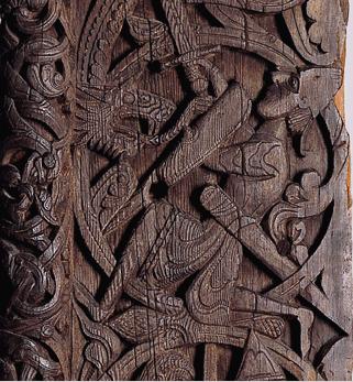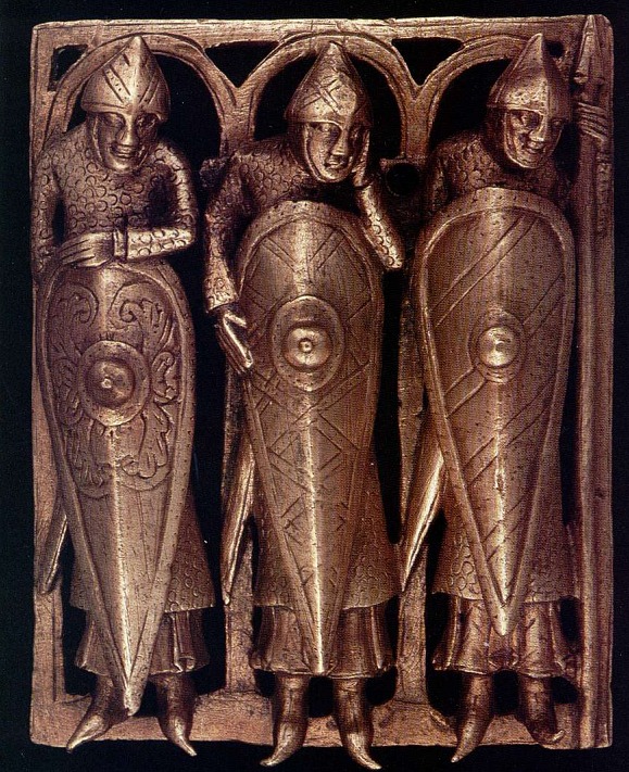 (V) Деревянная церковь в Хельстаде (Stabkirche in Hylestad), около 70 км к северу от Бергена, Норвегия. Резьба по дереву на входе, 12 век.  Любопытно что кольчуги у воина нет, но есть меч шлем и щит, из под туники, кажется выглядывает стеганный доспех. Бармица на шлеме закрывает только затылок. Есть мнение что и шея защищена кожаным Горжетом, но по моему это просто голая шея. (I4) Деталь Дарохранительницы (Temple Pyx) (ок. 1140-1150) Позолоченная бронза. Музей Кельвингров в Глазго. Изображены рыцари в длинных кольчугах и с длинными рукавами, но все еще без кольчужных рукавиц. Интересны также горбатые Миндалевидные щиты с Умбонами и с окантовкой по краям