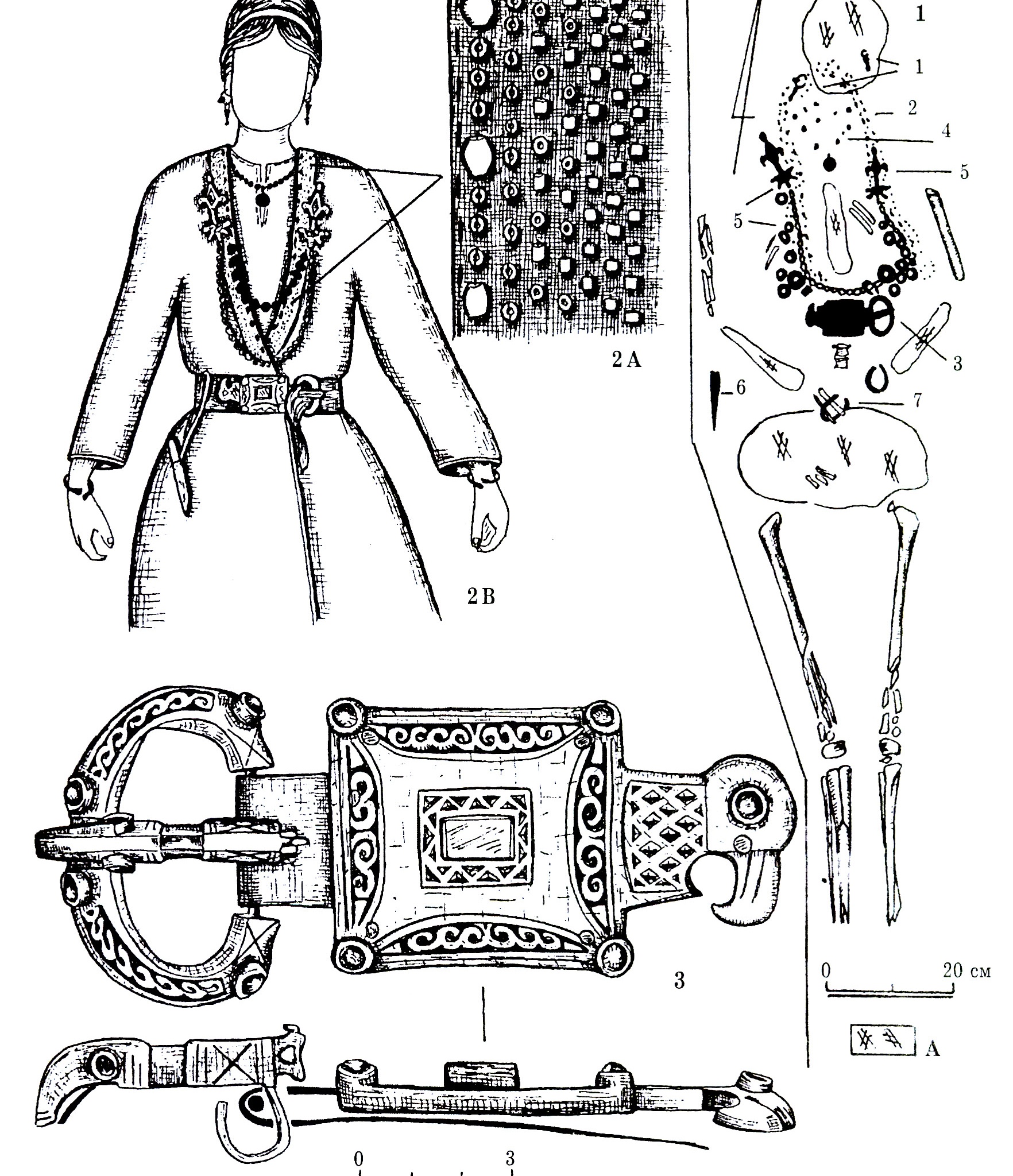 Помимо пряжки и фибул женский костюм включал бусы, серьги, браслеты, кольца, перстни, а иногда орудия труда и туалетные принадлежности.