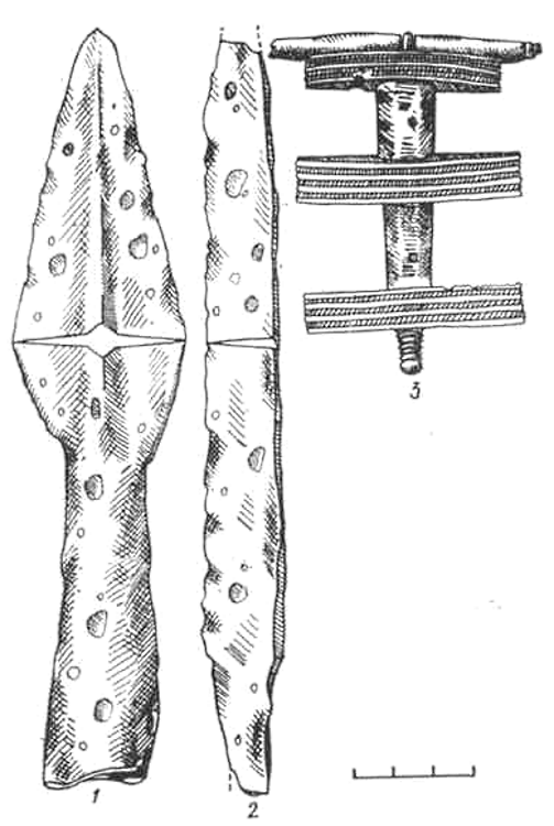 1 – наконечник копья подтипа ІБ. 2 – нож. 3 — бронзовая перскладчатая фибула