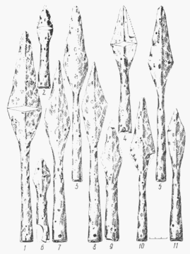 Самые ранние наконечники этой формы встречаются в Латвии и Дании, где они датируются III в. Поэтому вполне возможно, что наконечники с территории Латвии распространились в соседних землях балтских племен Восточной Прибалтики, а из Дании — и на других североевро-пейских территориях. В Центральной Европе наконечники этой формы появляются около 700 г. н. э. (166, с. 175).