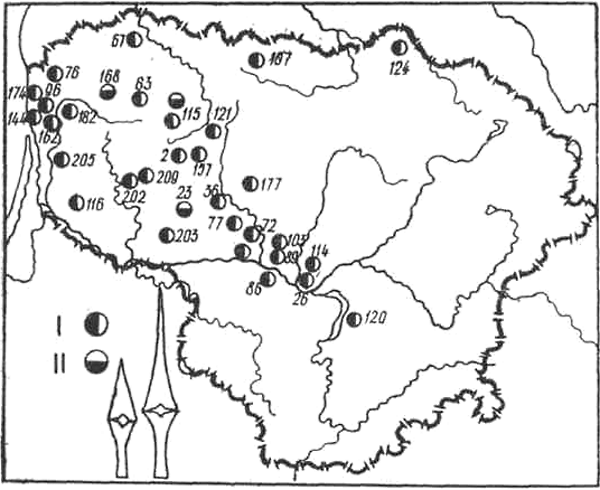 В ареале грунтовых могильников Центральной Литвы наконечников копий первой половины I тысячелетия н. э. больше всего обнаружено в погребениях III-IV вв. могильника Лауксвндай (Каунасский р-н). В них было найдено 9 экземпляров наконечников. В других могильниках — II в. Саргенай (г. Каунас), III-IV вв. Серяджюс (Юрбаркскнй р-н) (160, с. 217-218; 191, с. 173), IV в. Эйгуляй (г. Каунас) — найдены лишь отдельные экземпляры наконечников копий. Например, в Саргенай в 342 погребениях середины I-II вв. обнаружен только одни наконечник копья. Вообще в могильниках Центральной Литвы по сравнению с могильниками других частей республики наконечников копий II-IV вв. найдено очень мало. Такое же положение и с погребениями середины и второй половины I тысячелетия. Мужские погребения ареала Центральной Литвы этого времени оружием очень бедны. Например, в могильнике Плинкайгалис (Кедайн-скнй р-н) вскрыто 361 погребение V-VI вв. и 8 погребений VII в. Наконечники копий были найдены только в одном погребении VI в. и в трех VII в. По одному наконечнику копья найдено в могильнике IV-V вв. Гринюнай (Паневежский р-н) (192) и в могильнике V-VI вв. Кай-ренеляй (Радвилишкский р-н) (174). В некоторых могильниках, например, в Упите (Паневежский р-н), в погребениях III-V вв. не обнаружено никакого оружия.