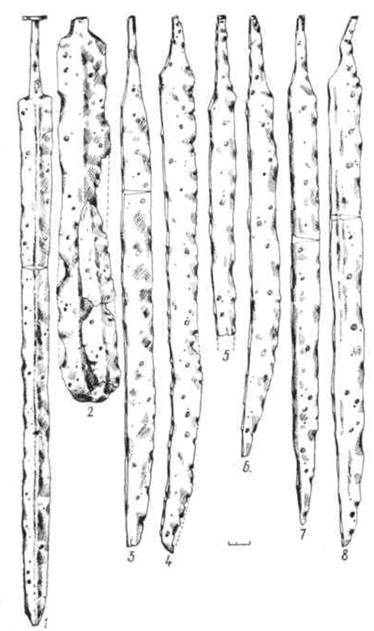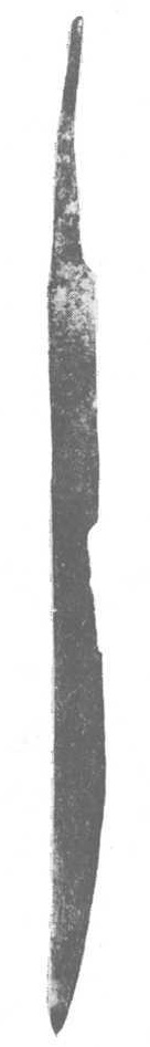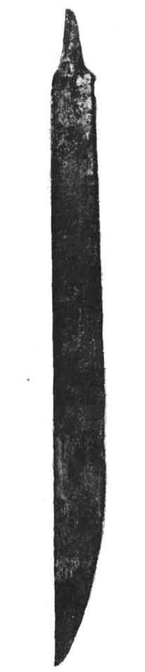 Было высказано мнение, что однолезвийные мечи местного происхождения (214, с. 204), а развились они из длинных боевых ножей (99, с. 45). Около середины I тысячелетия н. э. боевые ножи становятся длинными, некоторые из них достигают в длину 40 см и больше н приобретают характерные для мечей черты: постепенно утрачивают колющее свойство – узкий и тонкий клинок и вытянутое острие клинка. Спинки клинков утолщаются, они изготавливаются более широкими, острие округляется. Боевые ножи становятся длиннее и тяжелее и являются как будто переходной формой от боевого ножа к мечу. Например, такой боевой нож-меч найден в могильнике Плинкайгалис, в погребении № 16, датируемом V в. Его клинок длиной 40,9 см и шириной 2,47 см. Спинка толщиной 0,77 см. Таким оружием можно было не только колоть, но н удачно наносить удары. В Яунейкяй, в погребении № 271, обнаружен боевой нож-меч длиной 47 см с клинком шириной 2,5-3 см.