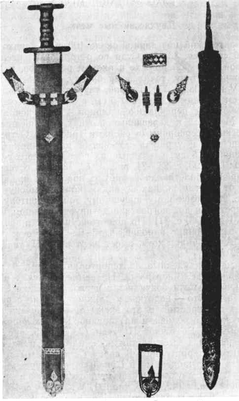 Крикштонский меч длиной около 100 см с клинком шириной в см (рис. 36:2). Судя по остальному инвентарю: бронзовой овальной пряжке и оковам ремешков, наконечнику копья, ритону, точильному бруску, погребение датируется V в. (105, с. 77). Второй, таурапильский, меч длиной 91 см с клинком шириной 5 см, с еле заметным долом и с черешком с перекладиной длиной 4 см в конце (рис. 36:1). Меч был в деревянных ножнах, украшенных металлическими серебряными оковами (рис. 39). Острие ножен упрочнял и украшал массивный наконечник U-формы, длиной 12,5 см, сделанный из позолоченного серебра (рис. 40 : 1) (193, с. 23-24, рис. 8, 12, 13). По остальному инвентарю: арбалетовидной фибуле, овальным пряжкам н оковам от ремешков, наконечникам копий, умбону щита, шпорам, узколезвийному проушному топору, ритону, пинцету, перстню и др., погребение датируется концом V -началом VI в. (193, с. 31). По принятой типологии эпохи великого переселения народов, этот меч ближе к мечам группы А IV типа, хотя имеет черты и III типа (48, с. 58-82).